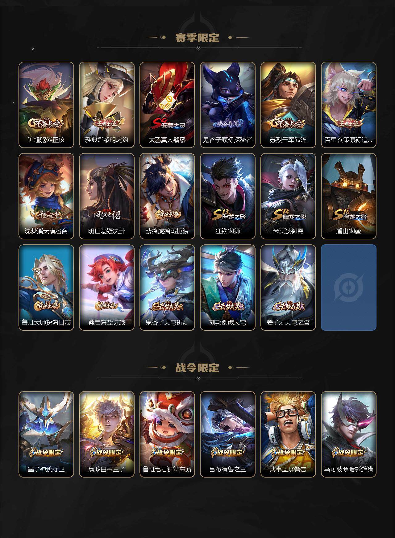 【赛季限定】:白起狰,芈月重明,夏侯惇朔风刀,曹操烛龙,典韦穷奇,狄仁杰万华元夜,达摩沙漠行僧,老夫子醍醐杖,程咬金演武夺筹,兰陵王金庭之子,牛魔御旌,李元芳云中旅人,钟馗驱傩正仪,雅典娜黎明之约,太乙真人饕餮,鬼谷子原初探秘者,苏烈千军破阵,百里玄策原初追逐者,弈星混沌棋,沈梦溪大漠名商,明世隐疑决卦,裴擒虎擒涛扼浪,狂铁御狮,米莱狄御霄,盾山御銮,鲁班大师探海日志,桑启海盐诗旅,鬼谷子天穹祈灯,刘邦剑破天穹,姜子牙天穹之誓