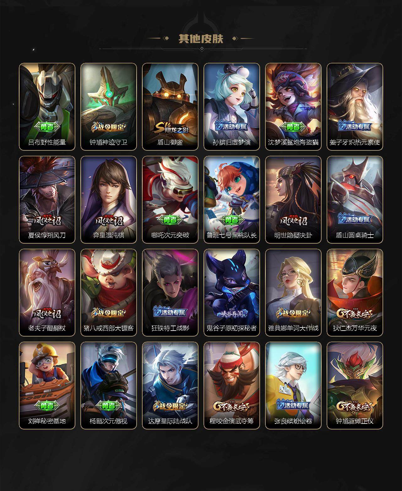 白起狰,太乙真人饕餮,曹操烛龙,芈月重明,典韦穷奇,狂铁御狮,米莱狄御霄,牛魔御旌,盾山御銮,夏侯惇朔风刀,明世隐疑决卦,老夫子醍醐杖,鬼谷子原初探秘者,狄仁杰万华元夜,程咬金演武夺筹,钟馗驱傩正仪,苏烈千军破阵,吕布猎兽之王,嬴政白昼王子,女娲朔望之晖,典韦蓝屏警告,钟馗神迹守卫,鲁班七号狮舞东方,马可波罗暗影游猎,蒙犽狂想玩偶喵,弈星混沌棋,达摩沙漠行僧,兰陵王金庭之子,沈梦溪大漠名商,李元芳云中旅人,桑启海盐诗旅,裴擒虎擒涛扼浪,鲁班大师探海日志