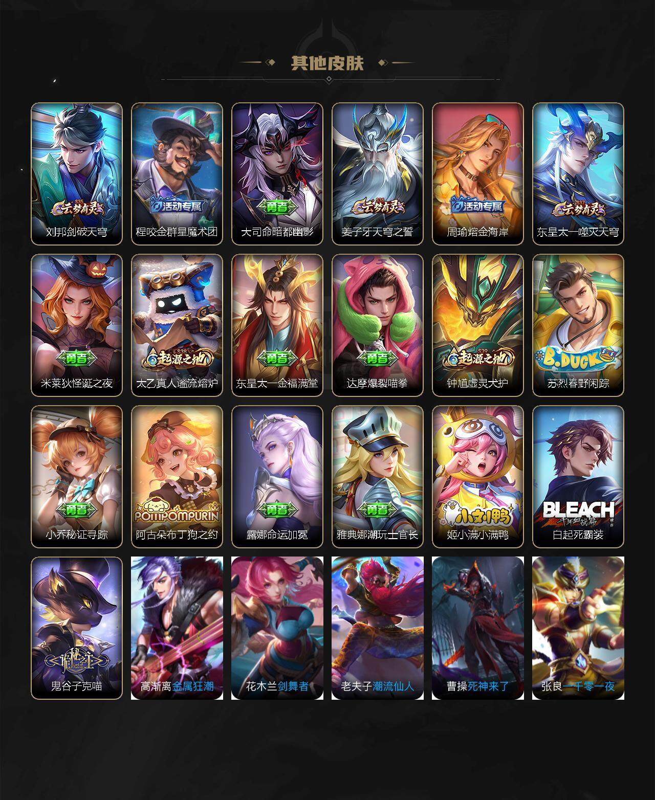小乔青蛇,瑶遇见神鹿,娜可露露晚萤,伽罗箭羽风息,李元芳逐浪之夏,公孙离无限星赏官,阿轲节奏热浪,王昭君偶像歌手,孙尚香时之恋人,阿轲暗夜猫娘,雅典娜冰冠公主,嬴政摇滚巨星,白起星夜王子,安琪拉心灵骇客,刘邦德古拉伯爵,曹操幽灵船长,小乔缤纷独角兽,夏侯惇乘风破浪,花木兰水晶猎龙者,百里玄策原初追逐者,吕布圣诞狂欢,貂蝉圣诞恋歌,嬴政暗夜贵公子,嫦娥拒霜思,雅典娜黎明之约,李白千年之狐,镜玫瑰异探,赵怀真器灵·浮梦炉
