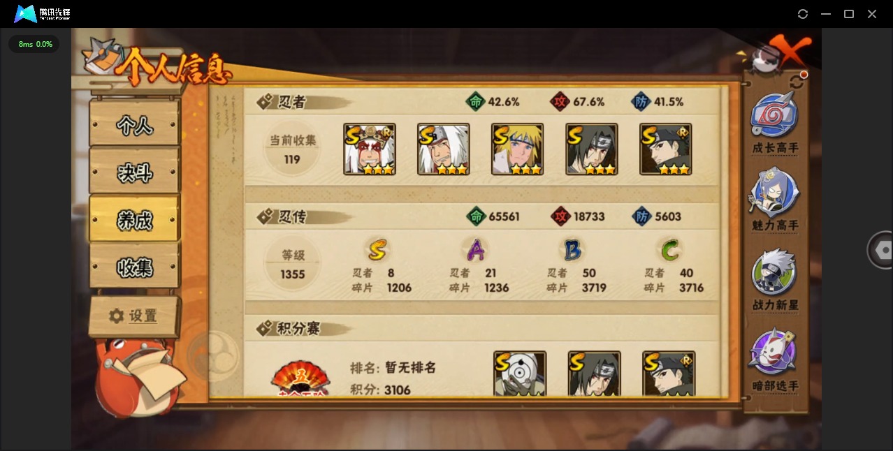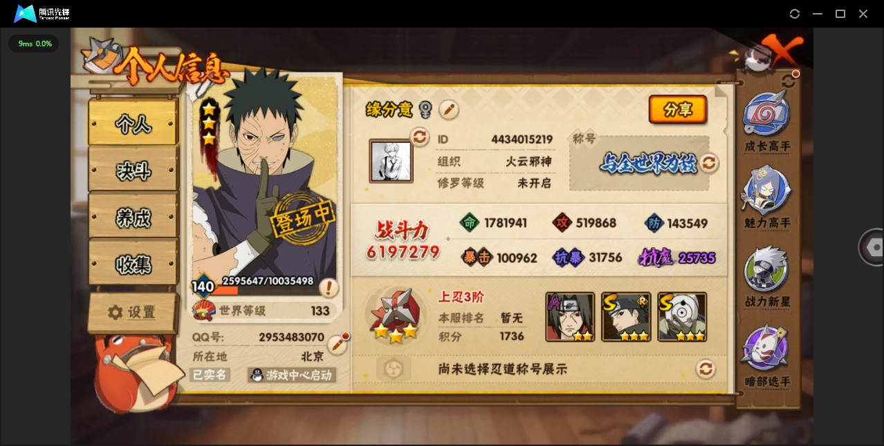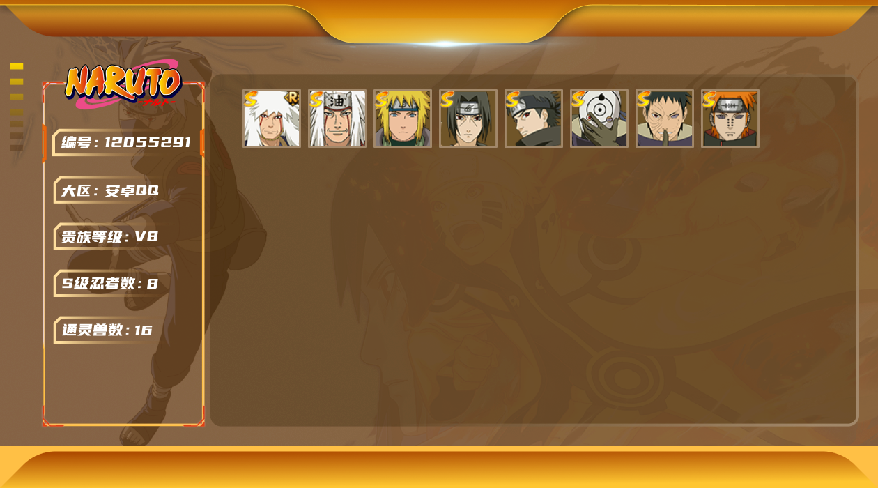 [12055291]V8 8S忍 21A忍 16通灵 619.7W战力 可二次 可修改实名 优质装备:宇智波带土 「忍界大战」,“宇智波斑” 「白面具」,宇智波止水「须佐能乎」 S级忍者:自来也 「舞之豪杰」,宇智波鼬 「须佐能乎」,佩恩「天道」,波风水门,自来也