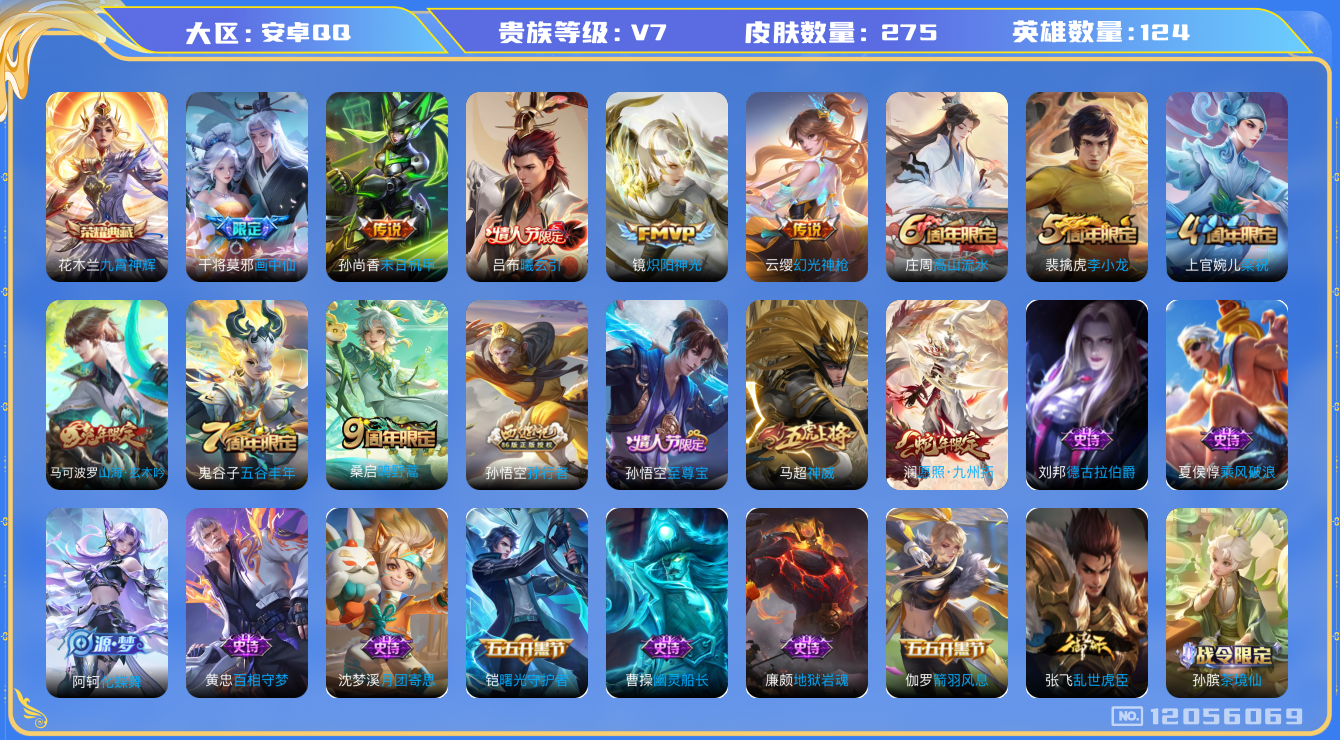 [12056069]V7 1典藏 7传说 124英雄 275皮肤 可修改实名 优质装备:九霄神辉(木兰典藏),炽阳神光,末日机甲-孙尚香(绿蚂蚱),画中仙 传说皮:吕布曦玄引,幻光神枪 珍宝阁皮:蔷薇恋人,玩趣恶龙 限定皮:愿照·九州拓(澜年限),鸣野蒿,至尊宝,神威(电光马子),高山流水,五谷丰年,梁祝,李小龙,孙行者,山海·玄木吟(马可年限) 史诗皮:器灵·浮梦炉,化蝶舞,星界战将,谪仙醉月,龙之律动,茶境仙,破空之剑,埋骨钱,百相守梦-百里守约,星界特工,百相守梦-黄忠,紫霞仙子,黄金分割率,特工魅影,千年之狐,永昼,魅语,蒙恬荣光圣徽,无限星赏官,冰冠公主,偶像歌手,晚萤,电玩·爆裂旋风,末日机甲-吕布,猫狗日记-孙策,乱世虎臣,女仆咖啡,摇滚巨星,水果甜心,天才门将,星夜王子,心灵骇客,德古拉伯爵,幽灵船长,鬼剑武藏,心灵战警,乐园奇幻夜,舞动绿茵,地狱岩魂,纤云弄巧,拒霜思,缤纷独角兽,乘风破浪,月团寄思,水晶猎龙者,曙光守护者,箭羽风息,金属风暴,原初追逐者,圣诞狂欢,圣诞恋歌,鹰眼统帅,魅力维加斯,黎明之约,无心,未来纪元-赵云,玫瑰异探