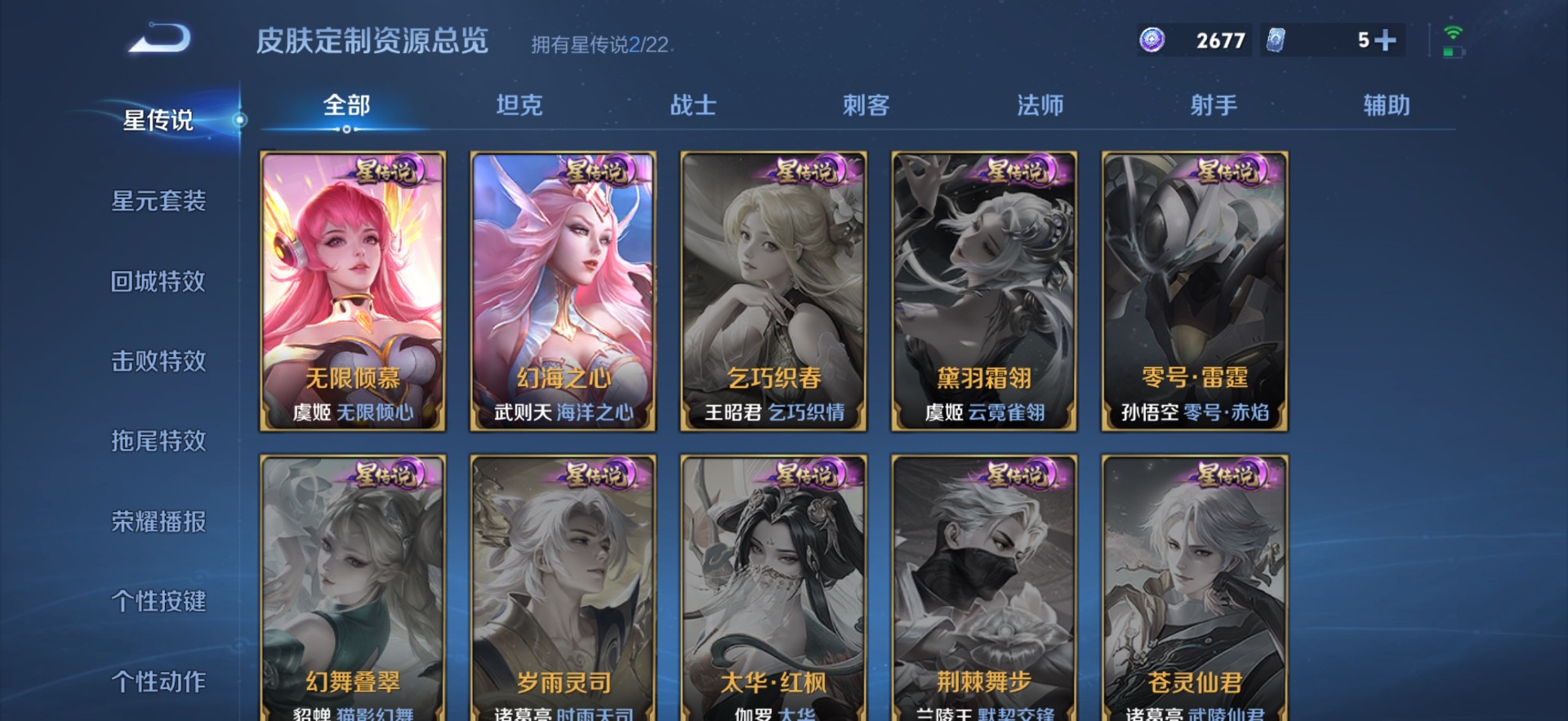 夏侯惇无限飓风号,铠银白咏叹调,小乔天鹅之梦,孙尚香杀手不太冷,鲁班七号星空梦想,武则天倪克斯神谕,诸葛亮星域神启,花木兰九霄神辉,李白鸣剑·曳影,芈月大秦宣太后,程咬金活力突击,孙悟空全息碎影,貂蝉幻阙歌,关羽赤影疾锋