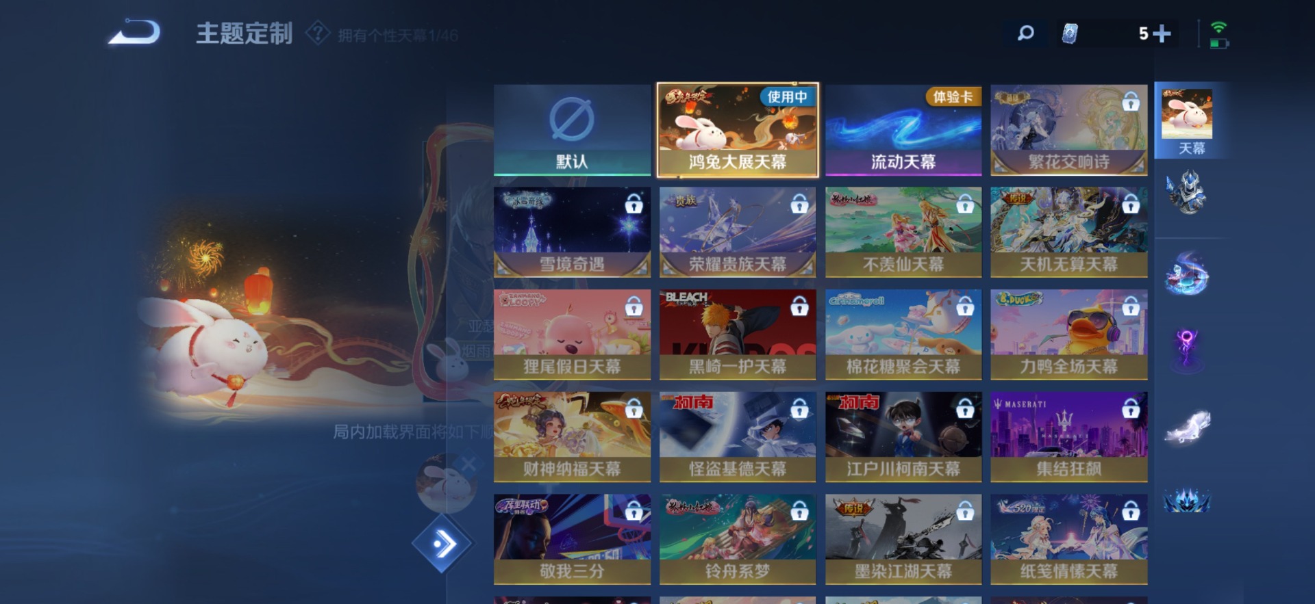 大乔白鹤梁神女,黄忠烈魂,哪吒逐梦之翼,甄姬幽恒,盾山梦圆繁星,铠青龙志,苏烈玄武志,张飞虎魄,赵云龙胆,干将莫邪冰霜恋舞曲,小乔纯白花嫁,不知火舞绯月行,后羿辉光之辰,露娜一生所爱,庄周玄嵩,周瑜真爱至上,裴擒虎李小龙,东皇太一逐梦之光,上官婉儿梁祝,上官婉儿神器·万象笔,李白诗剑行,花木兰瑞麟志,花木兰青春决赛季,马可波罗山海·玄木吟,桑启鸣野蒿,孙悟空大圣娶亲,孙悟空美猴王,百里玄策白虎志,马超神威,赵云引擎之心,盘古冰霜神祇,妲己时之奇旅,韩信飞衡,韩信逐梦之影,百里守约朱雀志,蔡文姬奇迹圣诞,墨子降魔,瑶山海·碧波行,妲己热情桑巴,关羽冰锋战神
