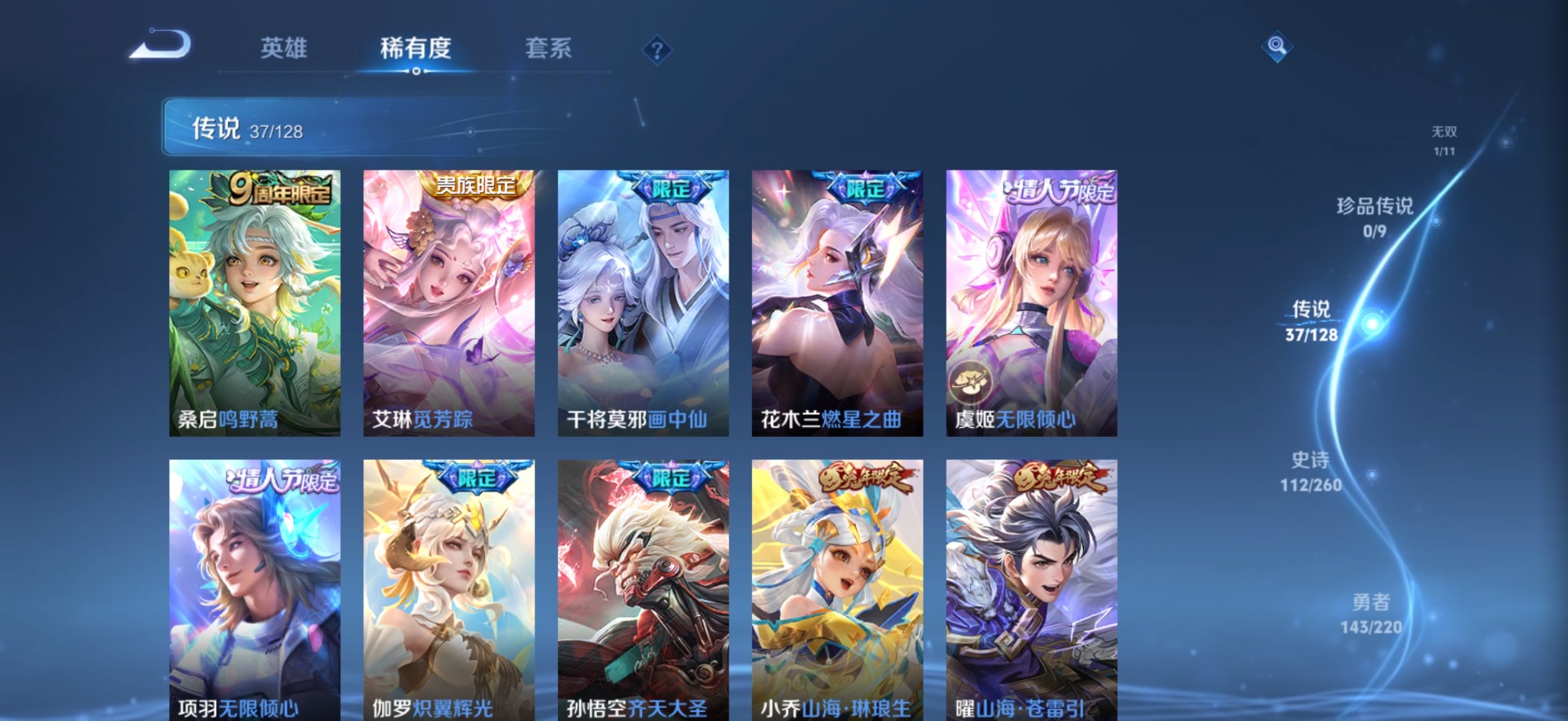 - PX_2023139-贵族等级: V5 英雄数: 53 皮肤数: 28 传说皮: 久胜战神,挚爱之约