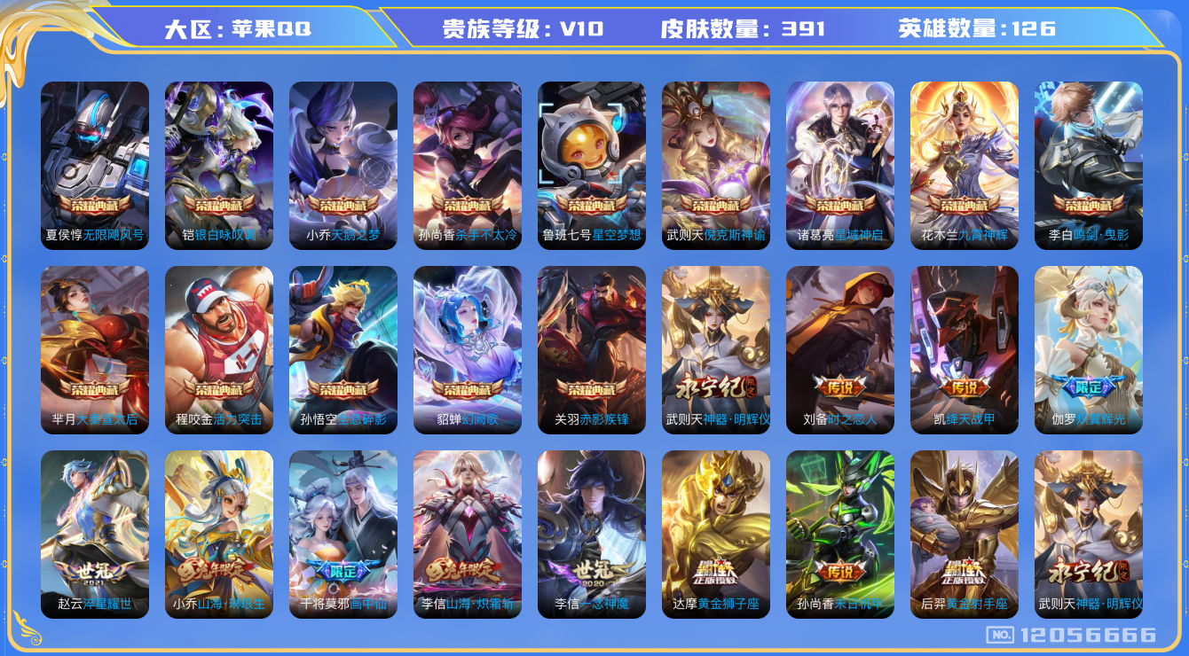 [12056666]V10 14典藏 1无双 37传说 126英雄 391皮肤 典藏英雄武则天 可修改实名 优质装备:天鹅之梦(小乔典藏),星空梦想(太空人),倪克斯神谕(宇宙婆娘),无限飓风号(高达),活力突击,杀手不太冷,大秦宣太后,鸣剑·曳影,全息碎影(猴子典藏),星域神启(倪克斯贼亮),九霄神辉(木兰典藏),赤影疾锋,银白咏叹调(倪克斯侍卫),幻阙歌(貂蝉典藏),神器·明辉仪,黄金狮子座,黄金射手座,冠军飞将,云鹰飞将(小将军),绛天战甲(鸡嘴战神),猫影幻舞,炽阳神光,一念神魔,末日机甲-孙尚香(绿蚂蚱),海洋之心,地狱之眼,音你心动-周瑜,胖达荣荣,时之恋人-刘备(电焊工),游龙清影(小青龙),淬星耀世,超时空战士-狄仁杰,神器·狴犴令,神器·明辉仪,山海·炽霜斩(李信年限),山海·琳琅生(小乔年限),山海·苍雷引(电光曜子),炽翼辉光(娃娃菜牛角包),燃星之曲,画中仙,艾琳觅芳踪 珍宝阁皮:女武神 限定皮:鸣野蒿,白虎志(电光耗子),凤求凰(白切鸡),绯月行,白鹤梁神女,神威(电光马子),飞衡(韩信年限),玄嵩(庄周年限),山海·碧波行(瑶年限),无限倾心-项羽,瑞麟志(木兰年限),遇见飞天,诗剑行,无限倾心-虞姬,齐天大圣,怒海麟威,降魔,青龙志(铠年限),冰锋战神,幽恒(沐浴露),游园惊梦,梁祝,龙胆,逐梦之翼,烈魂,虎魄,李小龙,逐梦之影,逐梦之光,玄武志(苏烈年限),朱雀志(守约年限),永曜之星,辉光之辰,奇迹圣诞,真爱至上,纯白花嫁,一生所爱,大圣娶亲,引擎之心,天魔缭乱,青春决赛季,冰霜恋舞曲,热情桑巴,美猴王,时之奇旅-妲己,神器·万象笔,梦圆繁星,山海·玄木吟(马可年限),冰霜神祇 史诗皮:化蝶舞,谪仙醉月,龙之律动,埋骨钱,遇见神鹿,苍穹之光,电玩小子(小书包),白龙吟,黄金分割率,特工魅影,千年之狐,江河有灵,蒙恬荣光圣徽,无限星赏官,冰冠公主,青蛇,偶像歌手,晚萤,电玩·爆裂旋风,暗夜猫娘,龙骑士(小龙虾),末日机甲-吕布,猫狗日记-孙策,猫狗日记-大乔,乱世虎臣,节奏热浪,修罗,女仆咖啡,摇滚巨星,水果甜心,绅士熊喵,天才门将,星夜王子,心灵骇客,功夫厨神,德古拉伯爵,暗隐猎兽者,幽灵船长,鬼剑武藏,心灵战警,舞动绿茵,地狱岩魂,纤云弄巧,繁星吟游(呼啦呼啦),缤纷独角兽,乘风破浪,逐浪之夏,水晶猎龙者,曙光守护者,箭羽风息,唤灵魅影,金属风