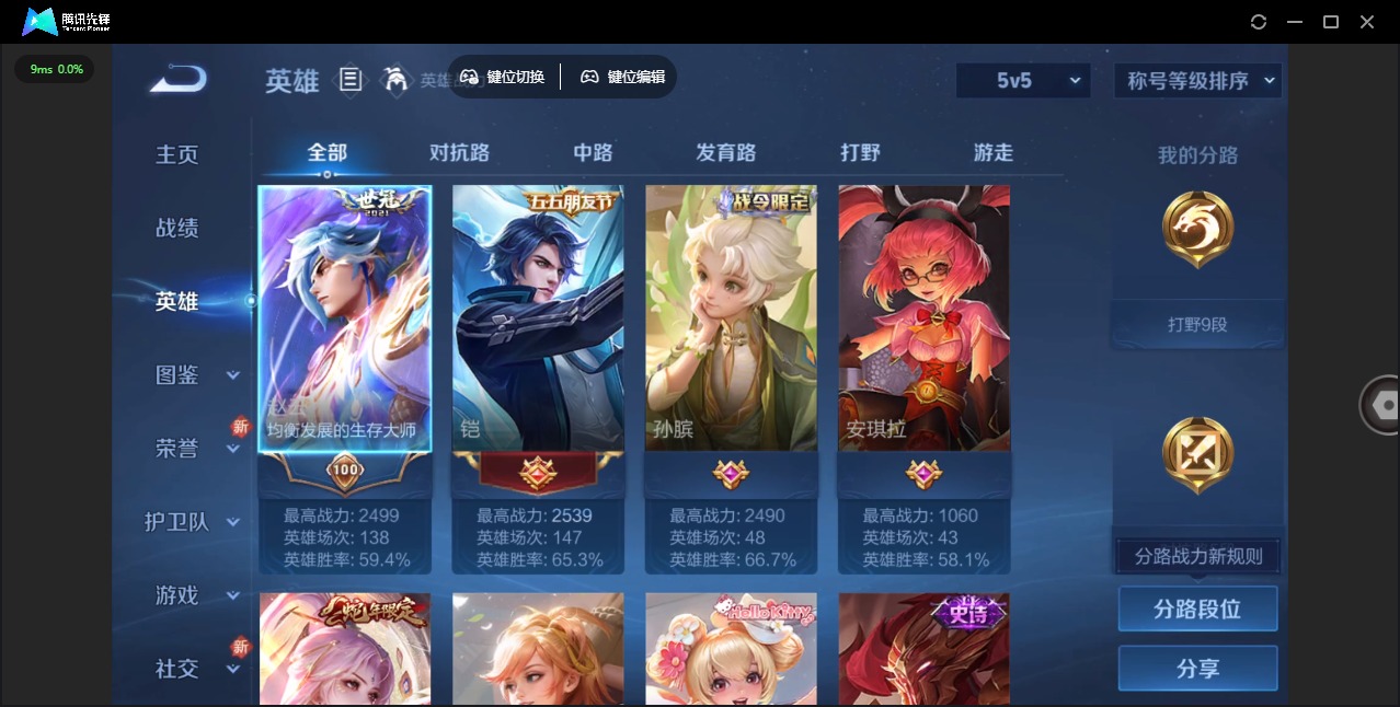 - [11296222]V4 3传说 85英雄 50皮肤 可修改实名 优质装备:云鹰飞将(小将军),一念神魔 限定皮:鸣野蒿 史诗皮:特工魅影,水果甜心,鬼剑武藏,曙光守护者,金属风暴,鹰眼统帅,魅力维加斯