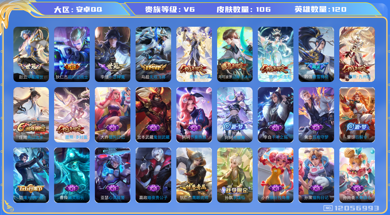 [12056993]V6 8传说 120英雄 106皮肤 可修改实名 优质装备:一念神魔,淬星耀世,超时空战士-狄仁杰,无双飞将 珍宝阁皮:女武神 限定皮:愿照·九州拓(澜年限),愿照·岁时盈(虞姬年限),愿照·山河定(司空震年限),愿照·众生和(妲己年限),傲雪梅枪,高山流水,山海·玄木吟(马可年限) 史诗皮:化蝶舞,茶境仙,百相守梦-黄忠,紫霞仙子,电玩小子(小书包),特工魅影,千年之狐,匿光侦查者,魅语,百解令(蒙犽),晚萤,龙骑士(小龙虾),猫狗日记-孙策,猫狗日记-大乔,节奏热浪,水果甜心,幽灵船长,鬼剑武藏,心灵战警,缤纷独角兽,曙光守护者,金属风暴,鹰眼统帅,暗夜贵公子,魅力维加斯,未来纪元-赵云