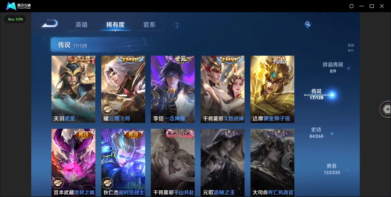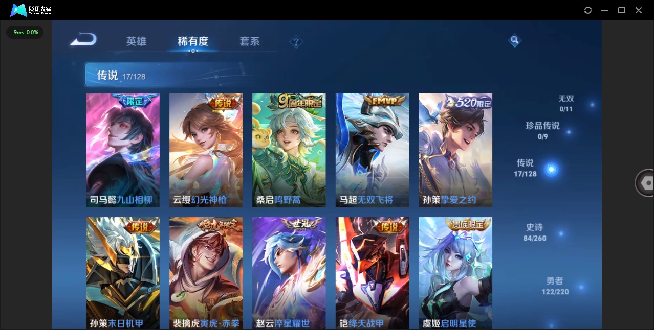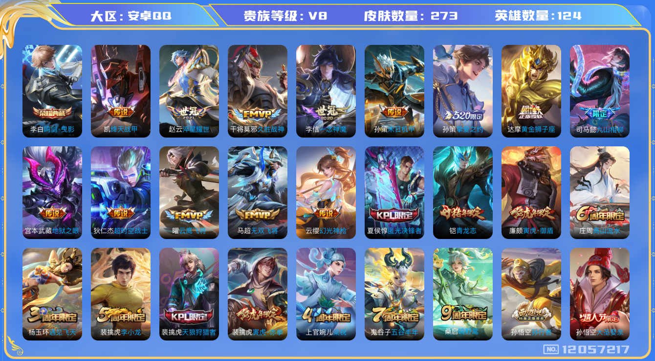 [12057217]V8 1典藏 17传说 124英雄 273皮肤 可修改实名 优质装备:鸣剑·曳影,黄金狮子座,云鹰飞将(小将军),绛天战甲(鸡嘴战神),久胜战神,一念神魔,地狱之眼,淬星耀世,超时空战士-狄仁杰,末日机甲-孙策,挚爱之约,无双飞将,涂山容容 传说皮:九山相柳,幻光神枪 珍宝阁皮:万物之道,优雅恋人,蔷薇恋人 限定皮:鸣野蒿,傲雪梅枪,神威(电光马子),遇见飞天,高山流水,匿光决锋者,五谷丰年,青龙志(铠年限),武圣,梁祝,天狼狩猎者,李小龙,朱雀志(守约年限),孙行者,大圣娶亲,寅虎·御盾(廉颇年限),寅虎·赤拳(老虎年限) 史诗皮:器灵·浮梦炉,化蝶舞,星界战将,龙之律动,茶境仙,幻珠鲛人,百相守梦-黄忠,紫霞仙子,电玩小子(小书包),白龙吟,黄金分割率,永昼,江河有灵,冰冠公主,偶像歌手,晚萤,末日机甲-吕布,猫狗日记-孙策,猫狗日记-大乔,乱世虎臣,节奏热浪,修罗,女仆咖啡,摇滚巨星,水果甜心,绅士熊喵,天才门将,星夜王子,时之奇旅-安琪拉,功夫厨神,德古拉伯爵,暗隐猎兽者,幽灵船长,鬼剑武藏,暗渊魔法,舞动绿茵,地狱岩魂,纤云弄巧,乘风破浪,逐浪之夏,水晶猎龙者,曙光守护者,热力回旋,金属风暴,原初追逐者,圣诞狂欢,圣诞恋歌,鹰眼统帅,黎明之约,赏金猎手,寅虎·御盾,无心,未来纪元-赵云