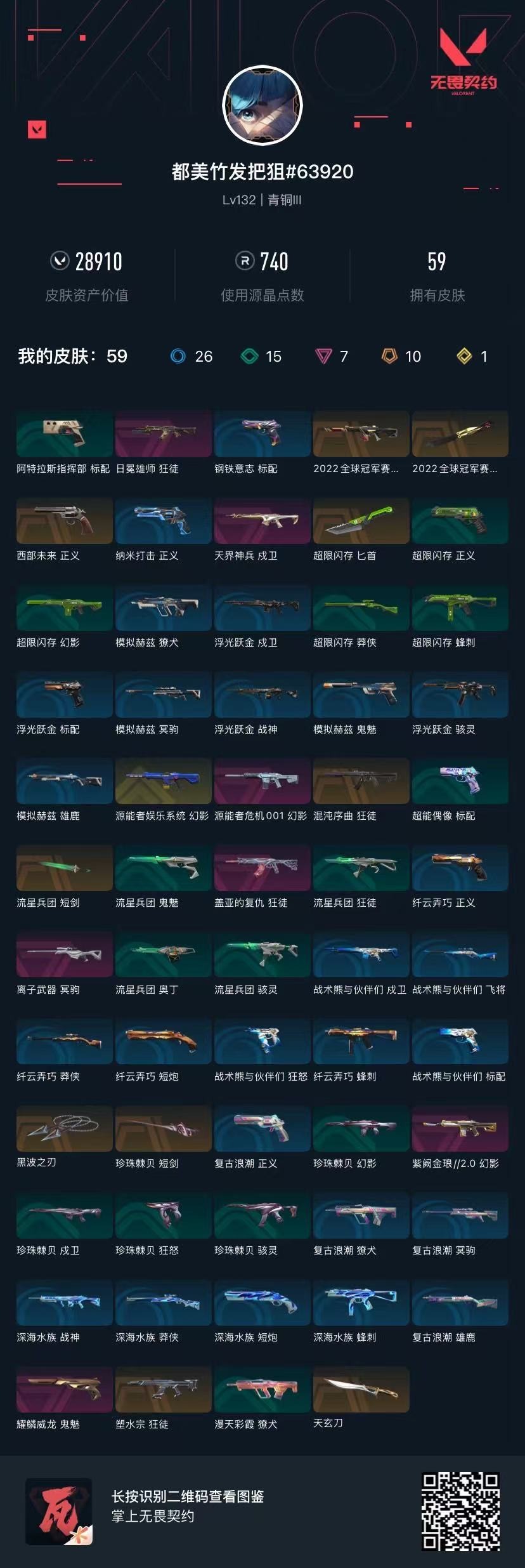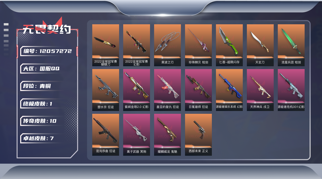 - [12294252]45橙皮 3金皮 19紫皮 148皮肤 27英雄 139卡面 1435已用源晶 超凡 优质装备:黯夜怪谈套装,掠影套装,2024全球冠军赛套装,正义-奇点,狂徒-塑水宗,幻影-2024全球冠军赛,狂徒-混沌序曲,狂徒-掠影,狂徒-紫阙金琅,狂徒-盖亚的复仇,幻影-侦察力量,狂徒-机动狂飙,正义-塑水宗,冥驹-堕天遗武,狂徒-洪荒怒焰,正义-离子武器,狂徒-日冕雄师,幻影-黯夜怪谈,正义-光明哨兵,正义-掠影,冥驹-掠影,奥丁-艾沃莉的梦之翼,戍卫-掠影,狂徒-冰点凝冻,鬼魅-天界神兵,戍卫-天界神兵,定海神珍,骇灵-光明哨兵2.0,紫金爪刀,黑波之刃,鬼魅-艾沃莉的梦之翼,艾沃莉的魔法棒,爪刀-RGX 11z Pro 3.0,狂翼掠空指虎刀,夜刃诡镰,匕首-超限闪存,蝴蝶刀-奇点//2.0,影刃,荒土机兵热能刀,鬼丸国纲,镭切,神圣领域 战刀,VCT 2025 爪刀,噬影者簇刃,诡秘蛇影,苍龙之刃,雄鹿-紫阙金琅2.0 亮点皮肤:战刀-2024全球冠军赛,幻影-2022全球冠军赛,2022全球冠军赛 蝴蝶刀 套装:般若假面//2.0套装,2022全球冠军赛,VCT 2025赛季礼包,VCTCN2025套装 佩枪皮肤:标配-VCT25xBLG,标配-黯夜怪谈,狂怒-般若假面//2.0,短炮-混沌序曲,正义-西部未来,狂怒-全息波普 冲锋枪皮肤:蜂刺-天界神兵 霰弹枪皮肤:判官-上古龙炎 步枪皮肤:狂徒-创·纪元,獠犬-黯夜怪谈,狂徒-双城之战,狂徒-般若假面//2.0,獠犬-般若假面//2.0,RGX 11z pro 狂徒 狙击枪皮肤:飞将-黯夜怪谈,飞将-西部未来,莽侠-RGX 11z Pro 3.0 机枪皮肤:战神-般若假面//2.0 近战武器皮肤:超能偶像 应援棒