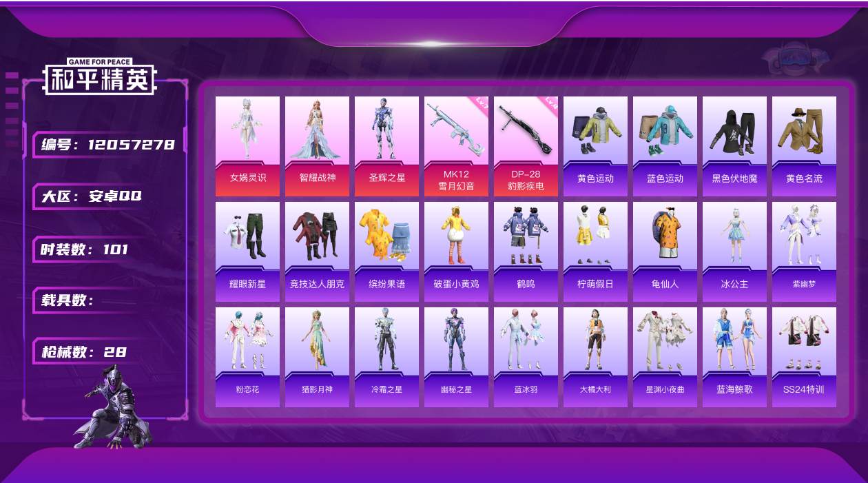 - PX_2095656- 苹果手Q-29王牌印记-有战神框-16粉装-17特效枪-2载具-153357热力值-301套装-443枪皮-4卓越印记-2传奇印记 【16粉装】,小叽联名款,放客神游,第五大道,洛天依,冷漠罗丽,千金淑猫,精灵迷巫,冰炎战车,深海曼妙,金属狂野,圣堂之誓,银刃赛罗,极限特训,绚金战神,未来战士,烟云彩露 【17特效枪】AKM-炫紫旋律-7级 SCAR-L-彩装战姬-4级 M