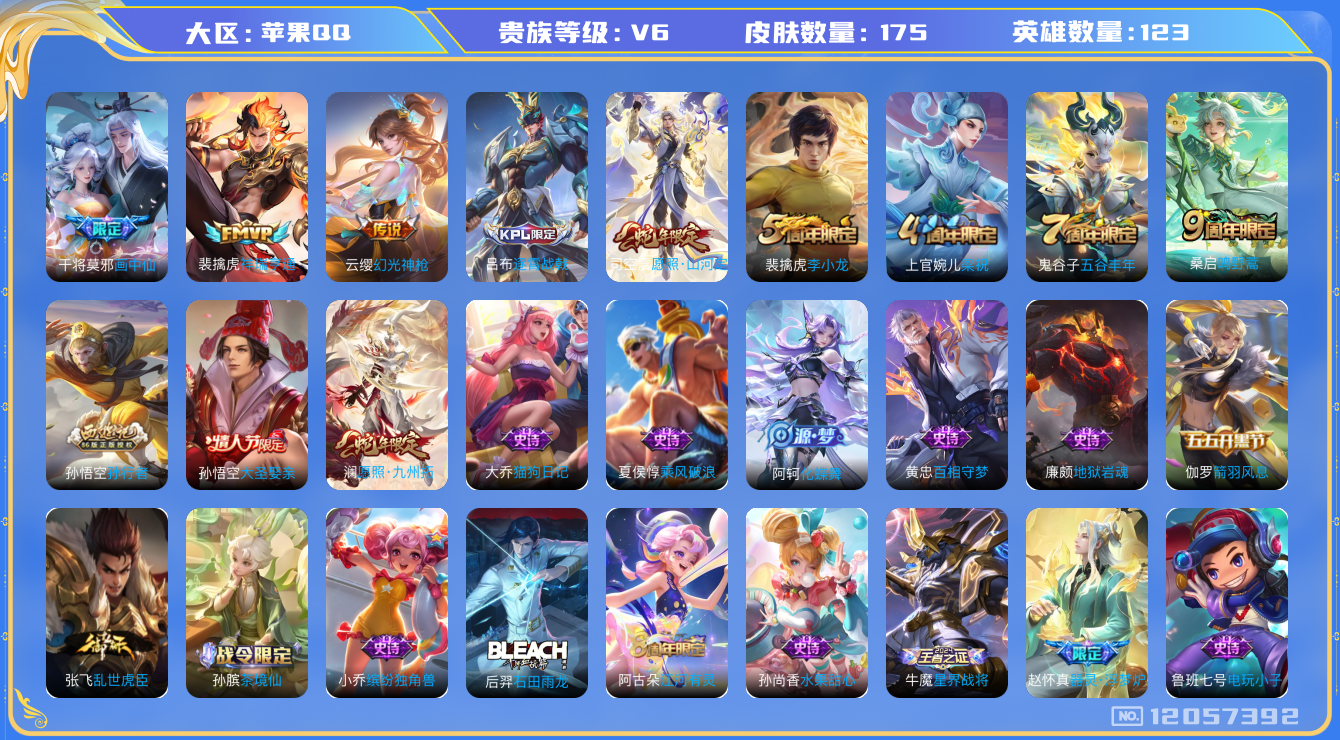 [12057392]V6 6传说 123英雄 175皮肤 可修改实名 优质装备:画中仙,涂山容容 传说皮:祥瑞亨通,幻光神枪 珍宝阁皮:万物之道,蔷薇恋人 限定皮:愿照·九州拓(澜年限),愿照·山河定(司空震年限),逐霄战戟,鸣野蒿,五谷丰年,梁祝,李小龙,孙行者,大圣娶亲 史诗皮:鸭鸭历险记-刘禅,器灵·浮梦炉,化蝶舞,星界战将,龙之律动,雪豹·霜爪,石田雨龙,茶境仙,百相守梦-黄忠,紫霞仙子,电玩小子(小书包),白龙吟,黄金分割率,特工魅影,江河有灵,冰冠公主,猫狗日记-大乔,乱世虎臣,女仆咖啡,水果甜心,心灵骇客,暗隐猎兽者,鬼剑武藏,乐园奇幻夜,天秀·启明,地狱岩魂,纤云弄巧,拒霜思,缤纷独角兽,乘风破浪,箭羽风息,金属风暴,鹰眼统帅,魅力维加斯