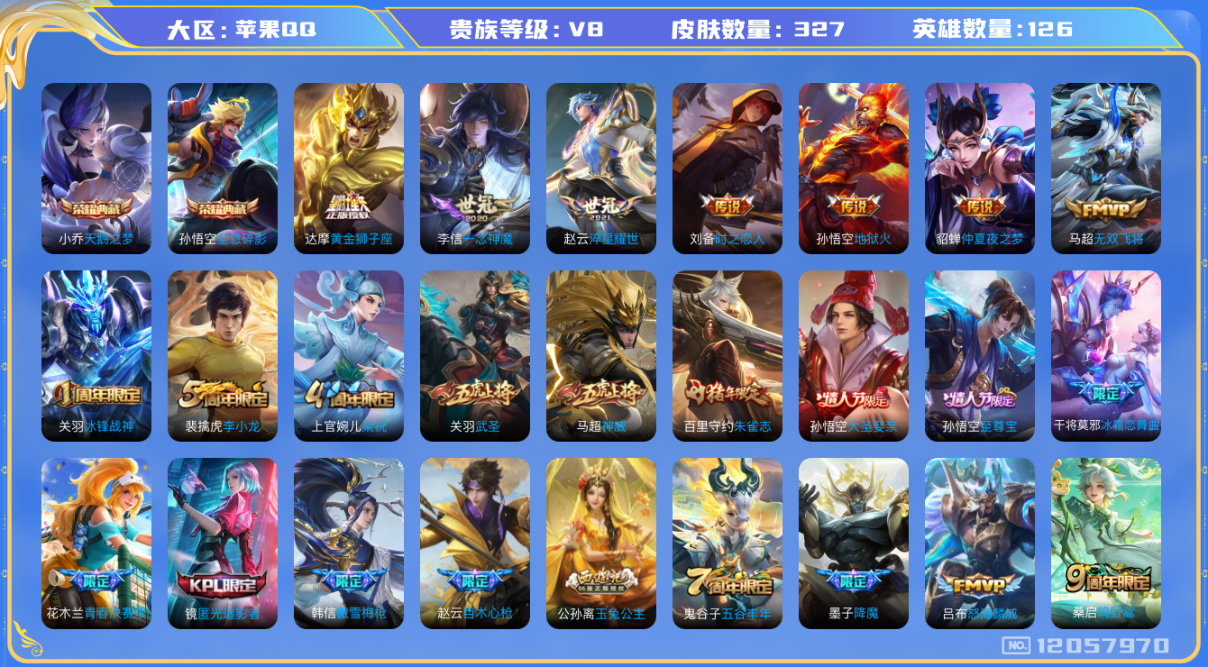 [12057970]【商品标题】:苹果Q-V8-尊贵铂金II段位-123英雄-327皮肤-2典藏-0珍品无双-0无双-0珍品传说-11传说-91史诗
