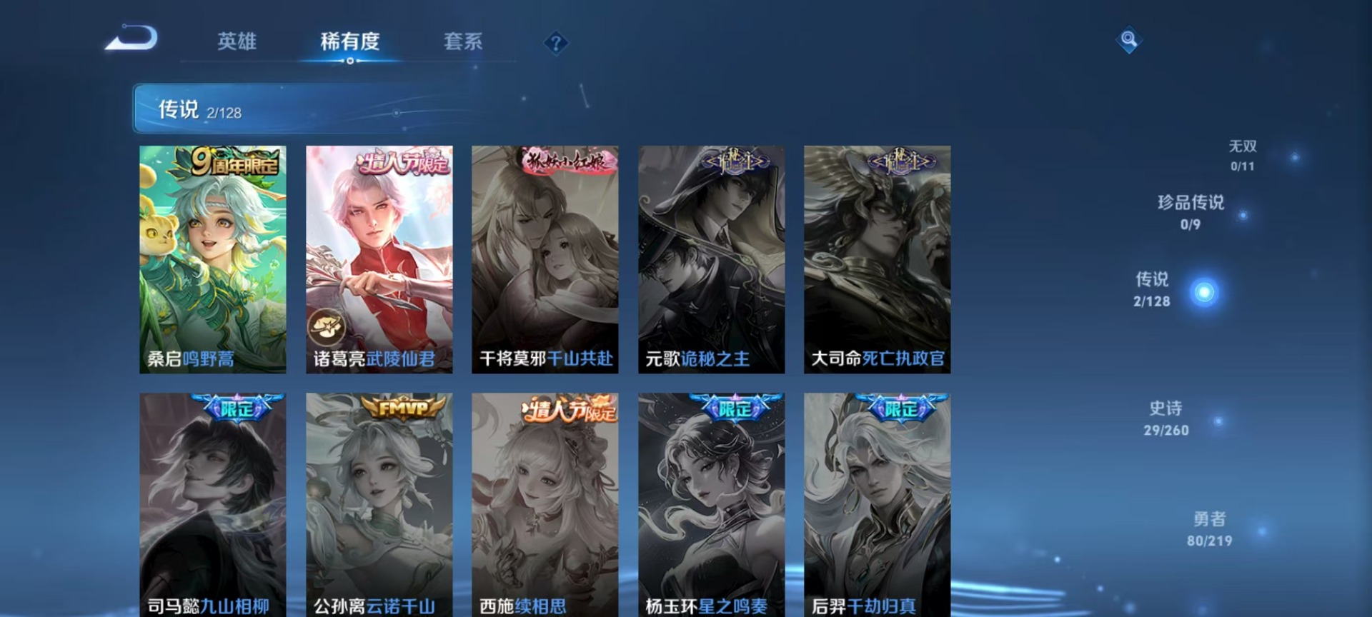 - [12027491]V7 1典藏 5传说 125英雄 272皮肤 可修改实名 优质装备:银白咏叹调(倪克斯侍卫),地狱火,地狱之眼 珍宝阁皮:妄想食味,玩趣恶龙 限定皮:愿照·九州拓(澜年限),鸣野蒿,傲雪梅枪,高山流水,五谷丰年,梁祝,御风骁将(吕布年限),天狼溯光者,李小龙,引擎之心,天魔缭乱 史诗皮:鸭鸭历险记-刘禅,星界战将,茶境仙,蔬乡物语(鲁班七号),百相守梦-百里守约,百相守梦-黄忠,紫霞仙子,电玩小子(小书包),黄金分割率,特工魅影,千年之狐,江河有灵,雪夜绮愿(周瑜),百解令(蒙犽),高渐离燃音魔法,蒙恬荣光圣徽,偶像歌手,暗夜猫娘,猫狗日记-孙策,猫狗日记-大乔,乱世虎臣,修罗,女仆咖啡,摇滚巨星,水果甜心,天才门将,心灵骇客,功夫厨神,德古拉伯爵,暗隐猎兽者,幽灵船长,鬼剑武藏,心灵战警,乐园奇幻夜,天秀·启明,舞动绿茵,地狱岩魂,纤云弄巧,繁星吟游(呼啦呼啦),拒霜思,缤纷独角兽,乘风破浪,月团寄思,水晶猎龙者,曙光守护者,金属风暴,原初追逐者,圣诞狂欢,圣诞恋歌,鹰眼统帅,王者之锤,暗夜贵公子,魅力维加斯,黎明之约