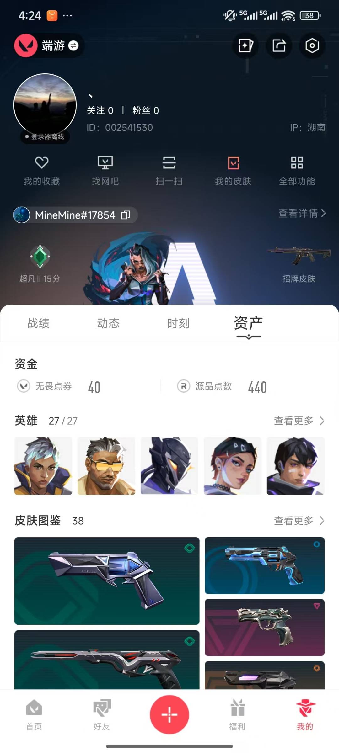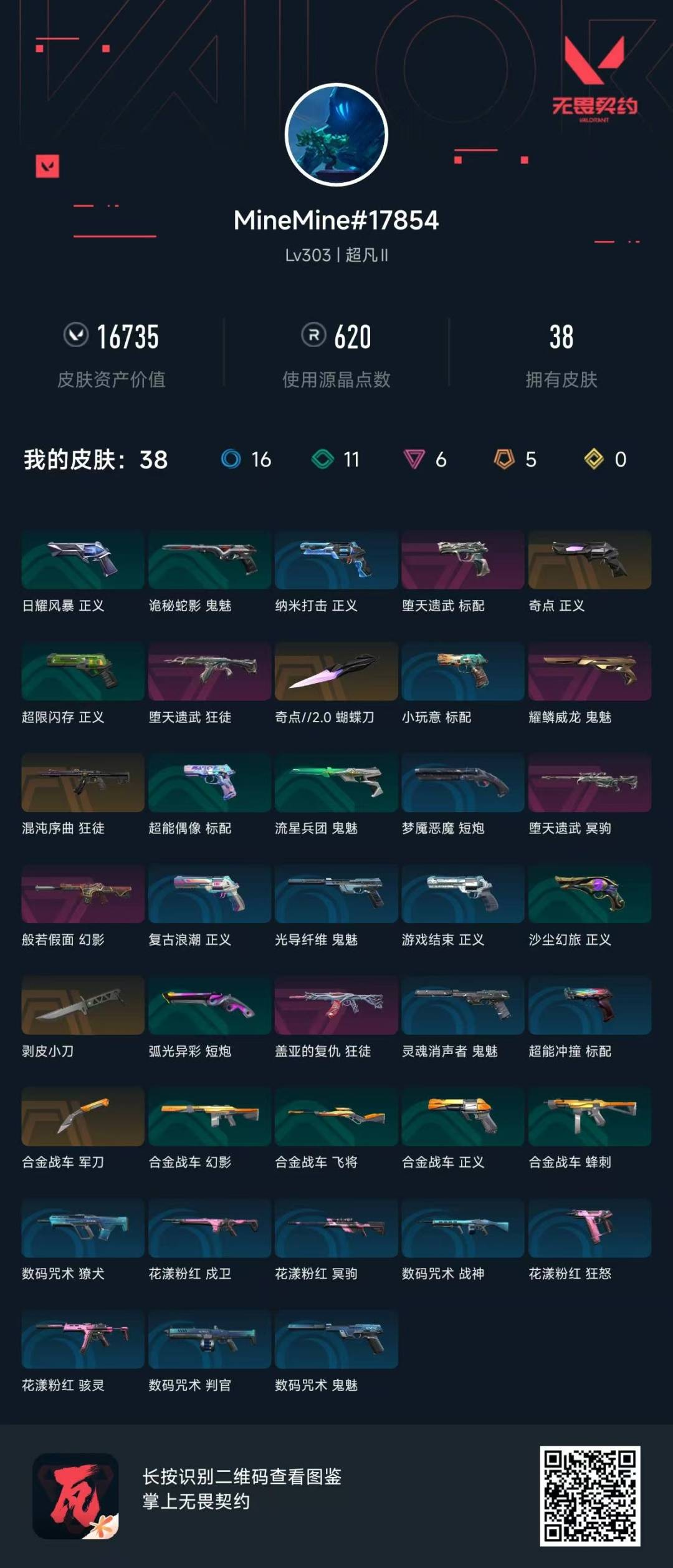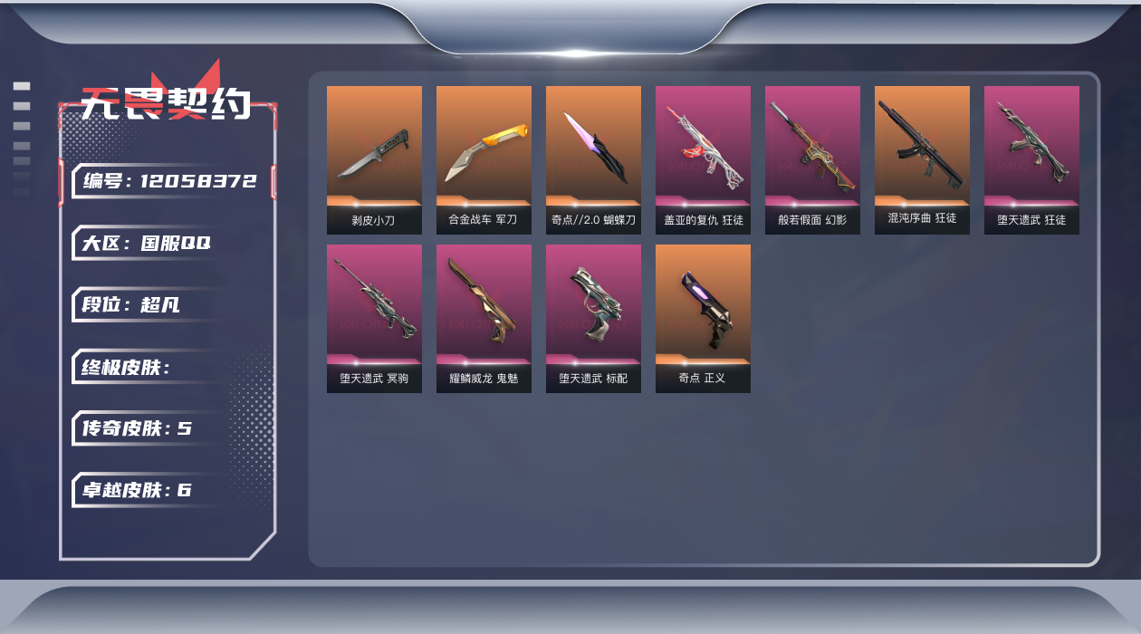 [12058372]5橙皮 6紫皮 38皮肤 27英雄 110卡面 620已用源晶 超凡 优质装备:正义-奇点,狂徒-混沌序曲,狂徒-盖亚的复仇,冥驹-堕天遗武,幻影-般若假面,军刀-合金战车,剥皮小刀,蝴蝶刀-奇点//2.0,标配-堕天遗武,鬼魅-耀鳞威龙 步枪皮肤:狂徒-堕天遗武