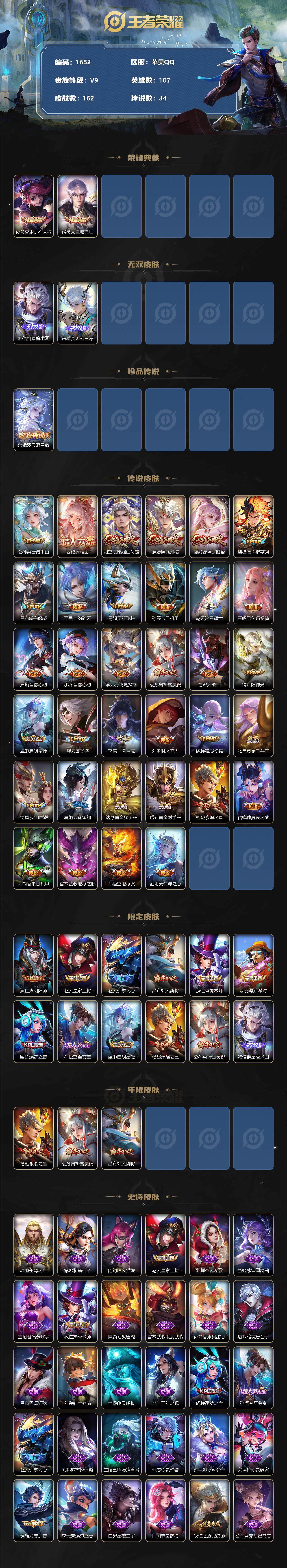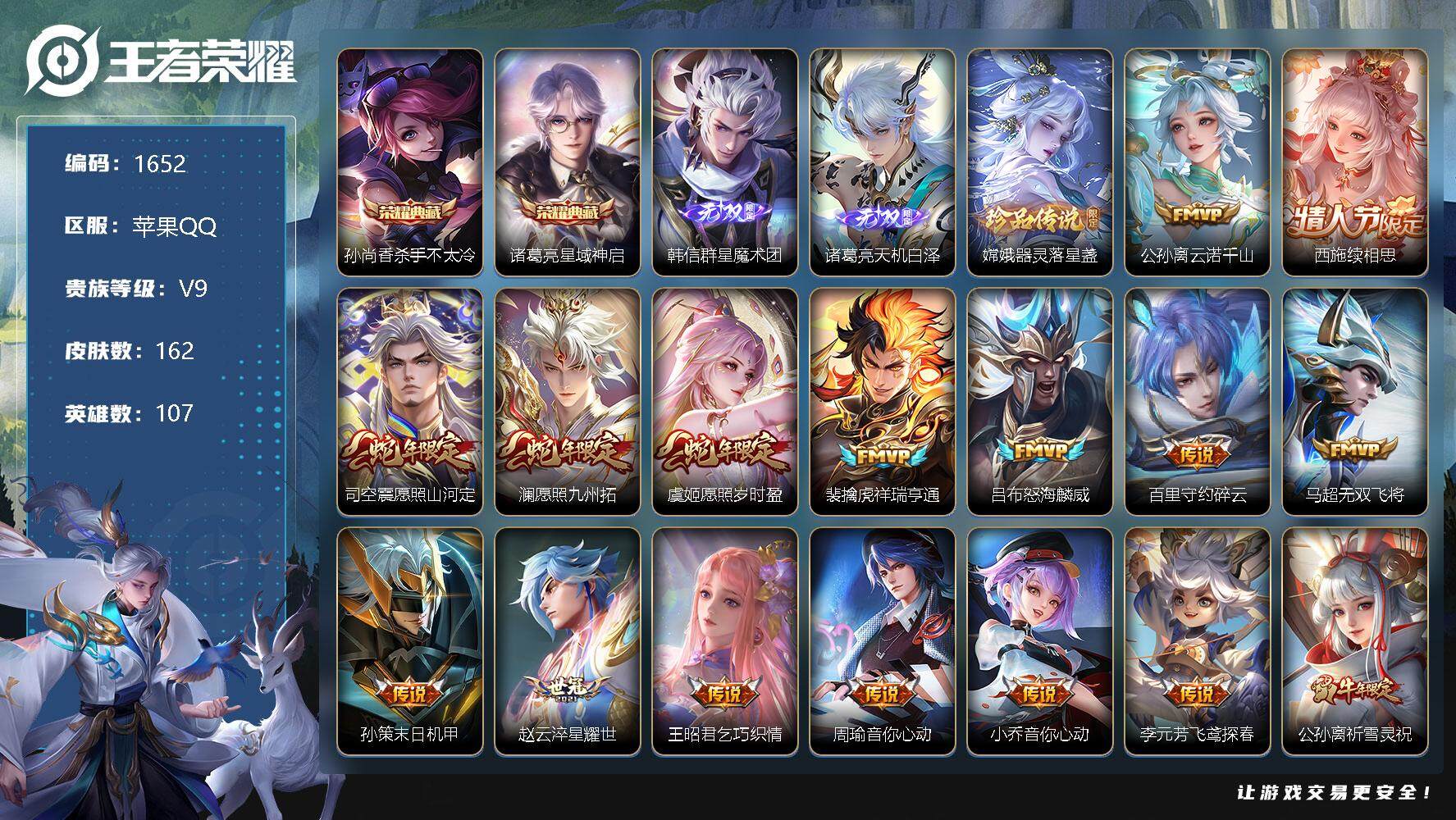 [12058488]【商品标题】:苹果Q-V9-最强王者段位-107英雄-162皮肤-2典藏-0珍品无双-2无双-1珍品传说-34传说-49史诗