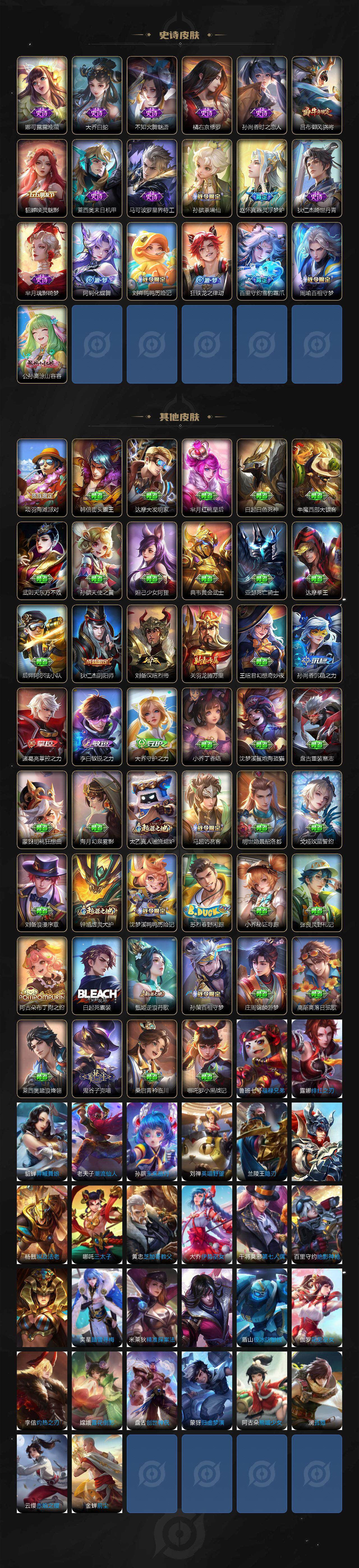 【史诗皮肤】:项羽苍穹之光,露娜紫霞仙子,阿轲暗夜猫娘,赵云皇家上将,貂蝉圣诞恋歌,甄姬冰雪圆舞曲,王昭君偶像歌手,狄仁杰魔术师,廉颇地狱岩魂,宫本武藏鬼剑武藏,孙尚香水果甜心,嬴政暗夜贵公子,吕布圣诞狂欢,刘禅绅士熊喵,曹操幽灵船长,李白千年之狐,貂蝉逐梦之音,孙悟空至尊宝,赵云引擎之心,刘邦德古拉伯爵,兰陵王暗隐猎兽者,亚瑟心灵战警,雅典娜冰冠公主,安琪拉心灵骇客,铠曙光守护者,李元芳逐浪之夏,白起星夜王子,阿轲节奏热浪,狄仁杰鹰眼统帅,公孙离无限星赏官,娜可露露晚萤,大乔白蛇,不知火舞魅语,橘右京修罗,孙尚香时之恋人,吕布御风骁将,貂蝉唤灵魅影,莱西奥末日机甲,马可波罗星界特工,孙膑茶境仙,赵怀真器灵浮梦炉,狄仁杰绮世丹青,芈月瑰影绮梦,阿轲化蝶舞,刘禅鸭鸭历险记,狂铁龙之律动,百里守约雪豹霜爪,周瑜百相守梦,公孙离涂山容容