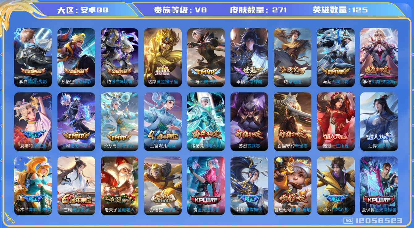 [12058523]【商品标题】:安卓Q-V8-永恒钻石IV段位-125英雄-271皮肤-3典藏-0珍品无双-0无双-0珍品传说-19传说-83史诗