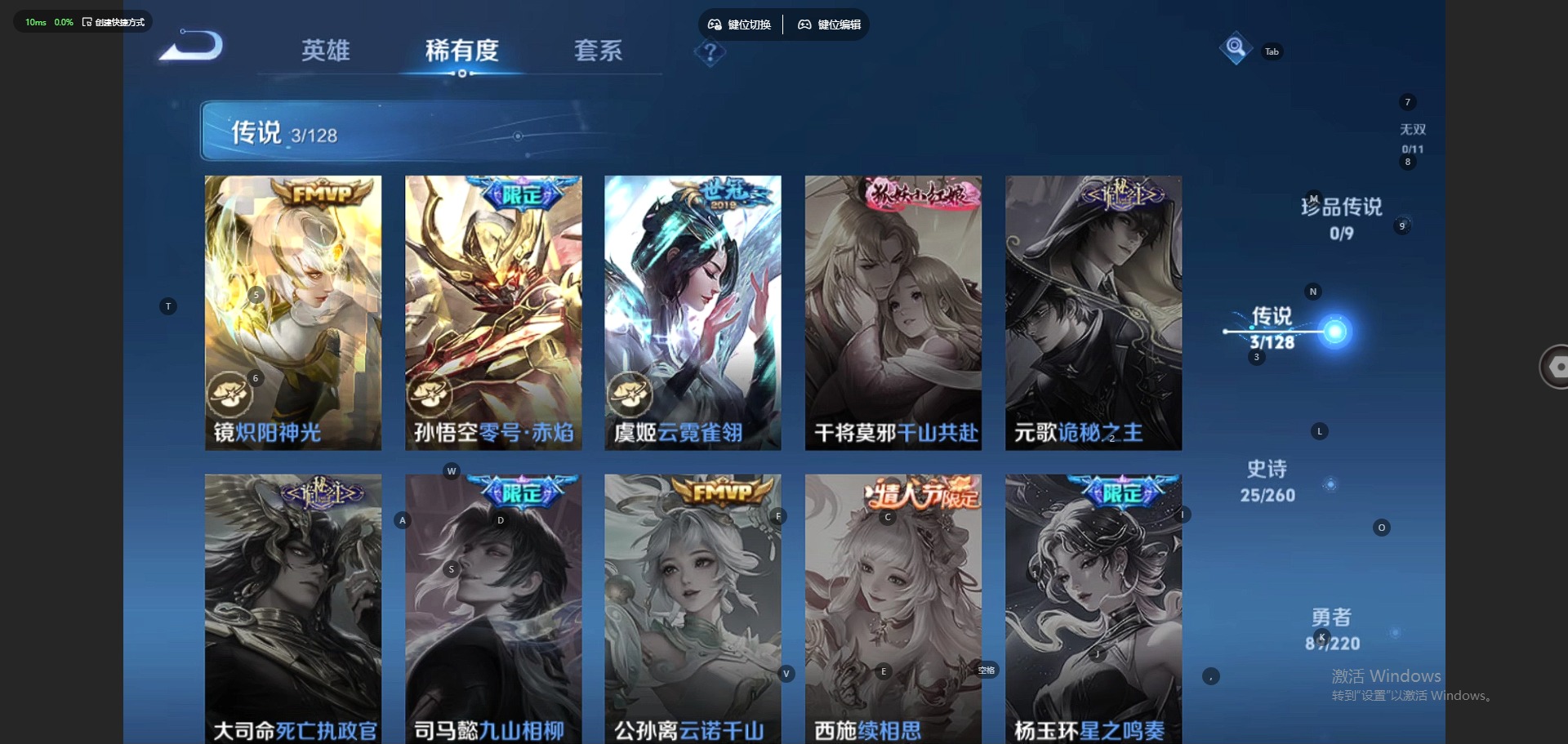 - [11841320]V7 2传说 123英雄 182皮肤 可修改实名 优质装备:地狱之眼 珍宝阁皮:玩趣恶龙 限定皮:至尊宝,傲雪梅枪,诗剑行,五谷丰年,梁祝,御风骁将(吕布年限),龙胆,逐梦之星,逐梦之影,孙行者,神器·万象笔 史诗皮:紫霞仙子,黄金分割率,特工魅影,千年之狐,永昼,百解令(蒙犽),高渐离燃音魔法,修罗,水果甜心,星夜王子,功夫厨神,德古拉伯爵,幽灵船长,鬼剑武藏,地狱岩魂,乘风破浪,金属风暴,原初追逐者,圣诞狂欢,圣诞恋歌,鹰眼统帅,王者之锤,魅力维加斯,赏金猎手,无心,未来纪元-赵云