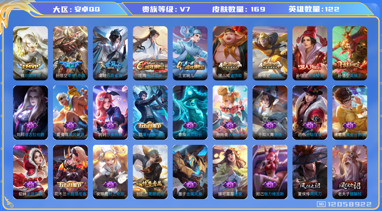 [12058922]V7 3传说 122英雄 169皮肤 可修改实名 优质装备:炽阳神光,云霓雀翎,零号·赤焰 限定皮:高山流水,梁祝,孙行者,猪悟能,大圣娶亲,美猴王 史诗皮:黄金分割率,魅语,晚萤,节奏热浪,水果甜心,时之奇旅-安琪拉,德古拉伯爵,幽灵船长,乘风破浪,水晶猎龙者,曙光守护者,金属风暴,圣诞狂欢,圣诞恋歌,鹰眼统帅,魅力维加斯