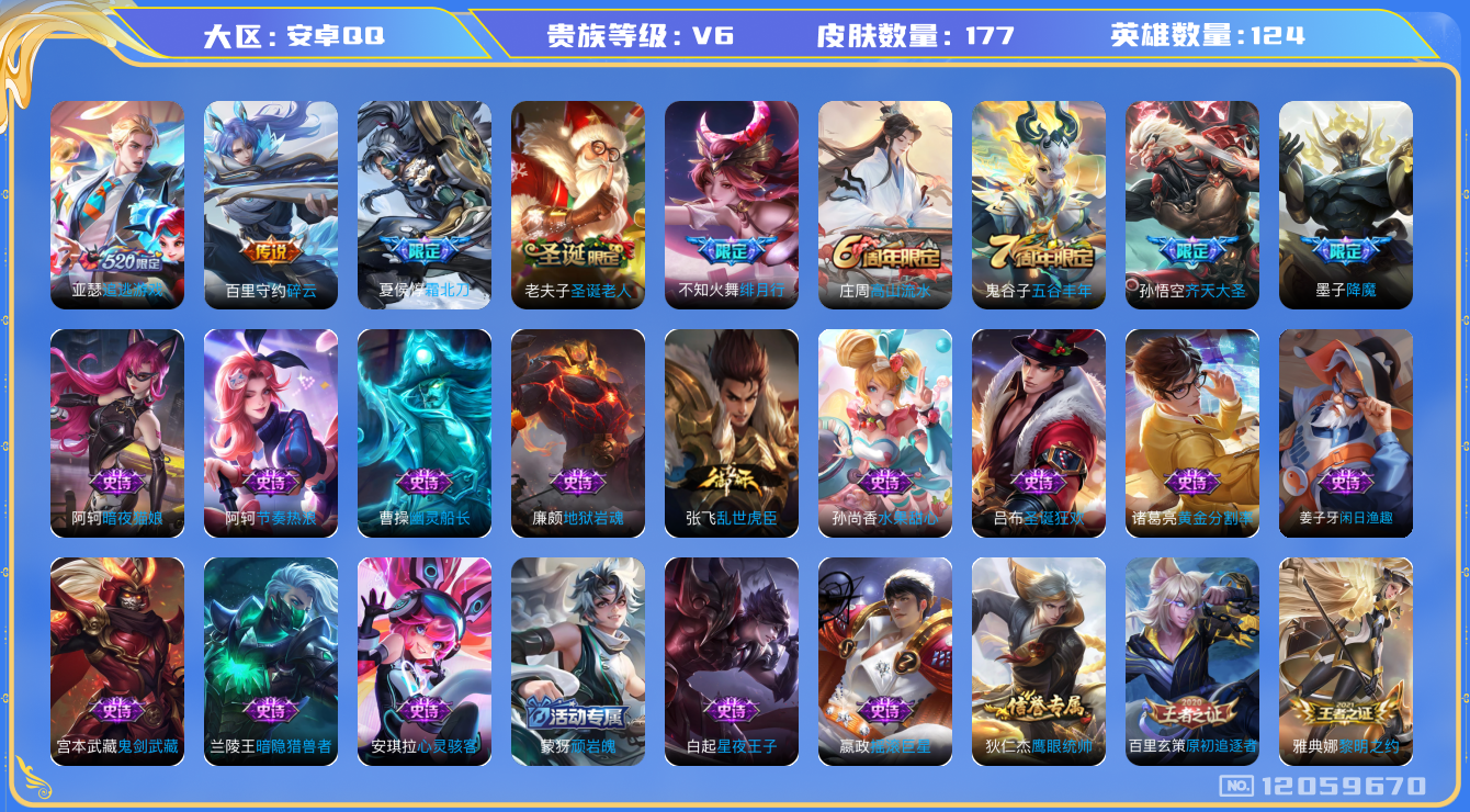 [12059670]V6 124英雄 177皮肤 可修改实名 白起小国标 扁鹊大国标 钟无艳大国标 赵怀真小国标 亚瑟小国标 安琪拉小国标 营地封十年 信用分50 优质装备:碎云,追逃游戏(亚瑟) 珍宝阁皮:优雅恋人 限定皮:夏侯惇霜北刀,绯月行,高山流水,齐天大圣,降魔,五谷丰年,圣诞老人 史诗皮:龙之律动,东方月初,蒙犽顽岩魄,黄金分割率,闲日渔趣,蒙恬荣光圣徽,暗夜猫娘,龙骑士(小龙虾),乱世虎臣,节奏热浪,女仆咖啡,摇滚巨星,水果甜心,星夜王子,心灵骇客,暗隐猎兽者,幽灵船长,鬼剑武藏,乐园奇幻夜,地狱岩魂,逐浪之夏,金属风暴,原初追逐者,圣诞狂欢,鹰眼统帅,魅力维加斯,黎明之约,滕王阁序