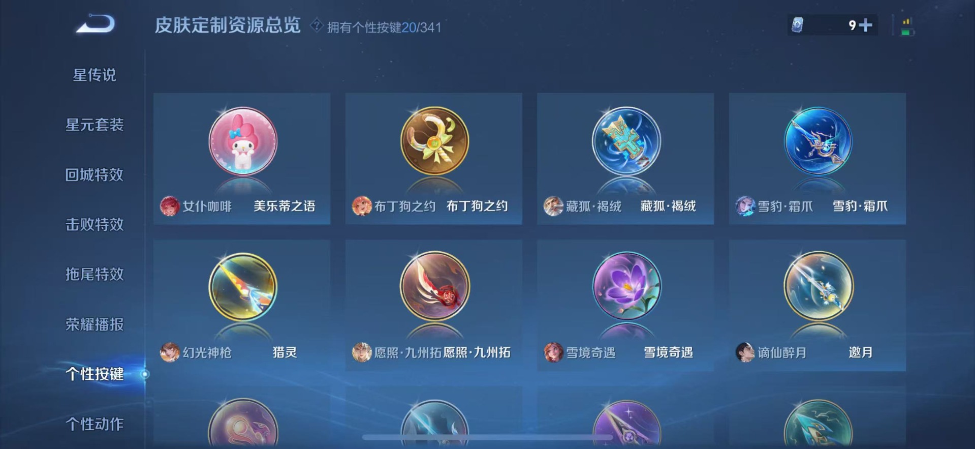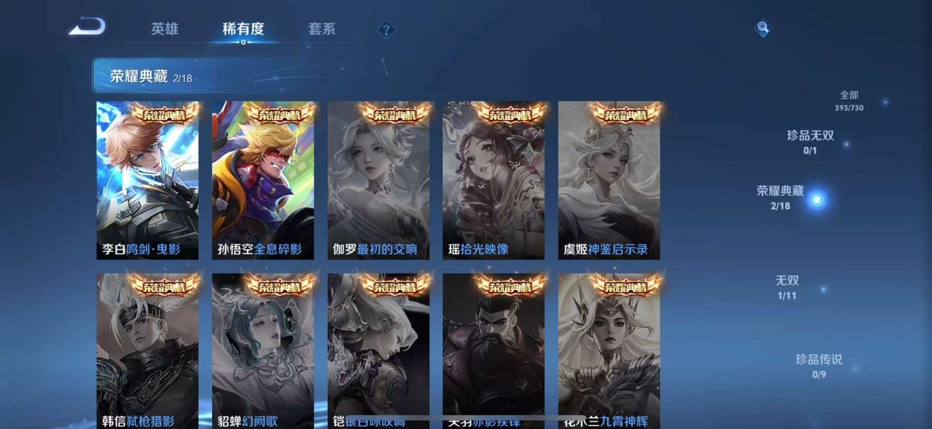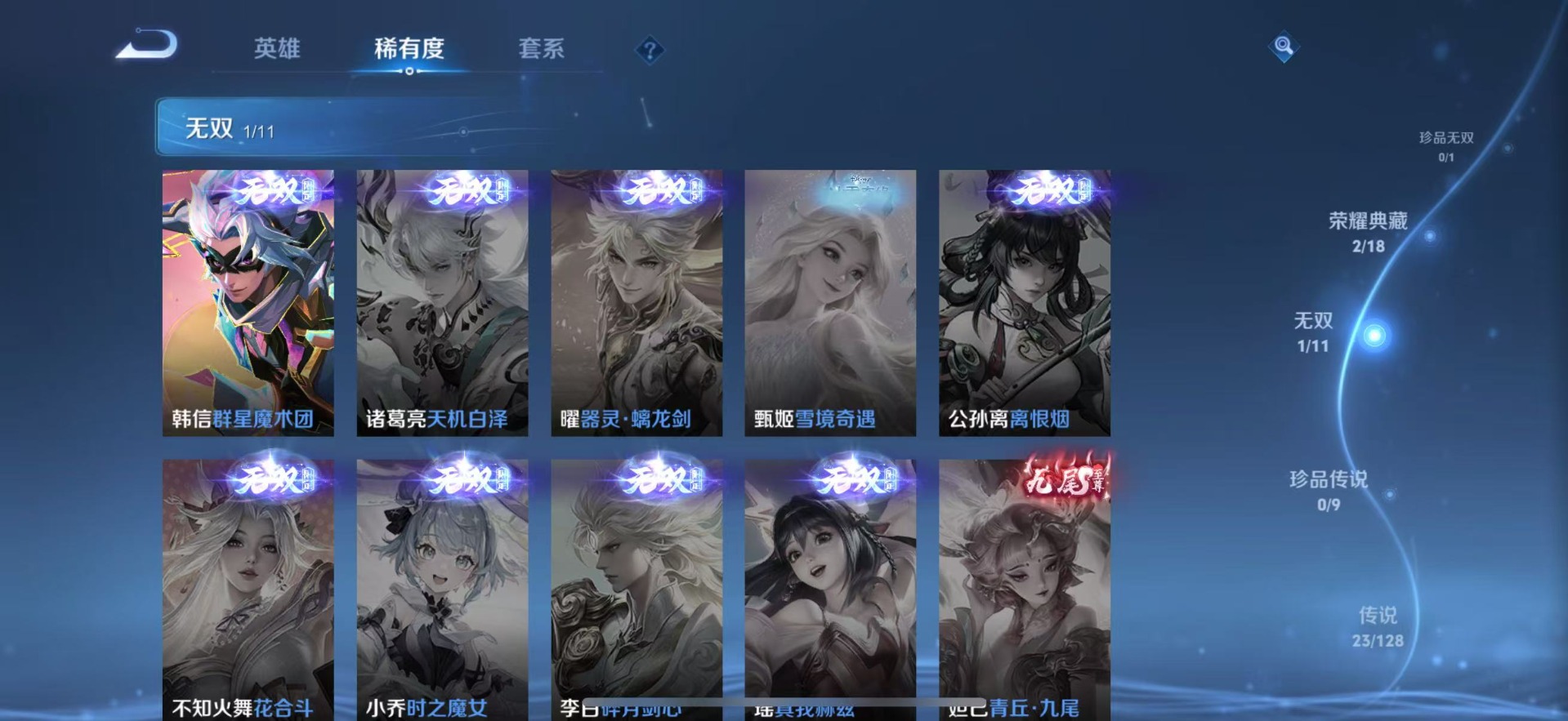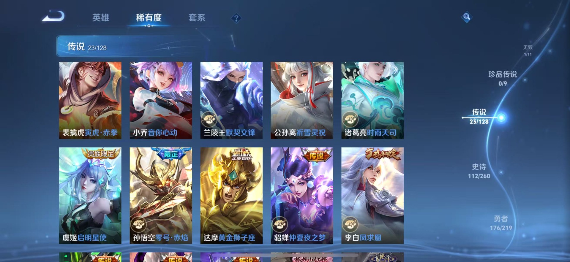 黄忠烈魂,铠青龙志,后羿辉光之辰,诸葛亮时雨天司,公孙离祈雪灵祝,兰陵王默契交锋,裴擒虎李小龙,裴擒虎寅虎·赤拳,上官婉儿梁祝,李白诗剑行,花木兰默契交锋,桑启鸣野蒿,猪八戒猪悟能,孙悟空孙行者,孙悟空大圣娶亲,孙悟空至尊宝,韩信飞衡,韩信逐梦之影,澜愿照·九州拓