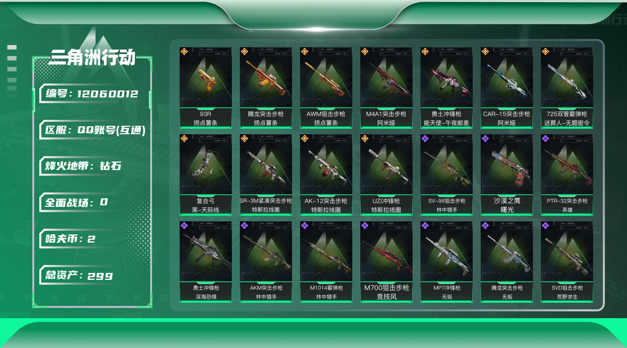 [12060012]总资产:299.6M 11传说枪械 哈夫币:2.261K 可二次 可修改实名 烽火地带段位:钻石 全面战场段位:军士长 传说武器皮肤:UZI冲锋枪-特斯拉线圈,AWM狙击步枪-捞点薯条,腾龙突击步枪-捞点薯条,93R-捞点薯条,AK-12突击步枪-特斯拉线圈,SR-3M紧凑突击步枪-特斯拉线圈,勇士冲锋枪-能天使-午夜邮差,复合弓-黑-天际线,725双管霰弹枪-送葬人-无题密令,M4A1突击步枪-阿米娅,CAR-15突击步枪-阿米娅 史诗武器皮肤:PKM通用机枪-蝮蛇,QJB201轻机枪-Old Habits,M1014霰弹枪-林中猎手,MP5冲锋枪-深海恐惧,勇士冲锋枪-深海恐惧,SG552突击步枪-深海恐惧,AKM突击步枪-林中猎手,M16A4突击步枪-竞赛选手,M250通用机枪-囚徒,SV-98狙击步枪-林中猎手,PTR-32突击步枪-英雄,SV-98狙击步枪-囚徒,腾龙突击步枪-无垢,MP7冲锋枪-无垢,PSG-1射手步枪-无垢,SVD狙击步枪-荒野求生,SR-3M紧凑突击步枪-荒野求生,PKM通用机枪-荒野求生,沙漠之鹰-曙光,M700狙击步枪-竞技风