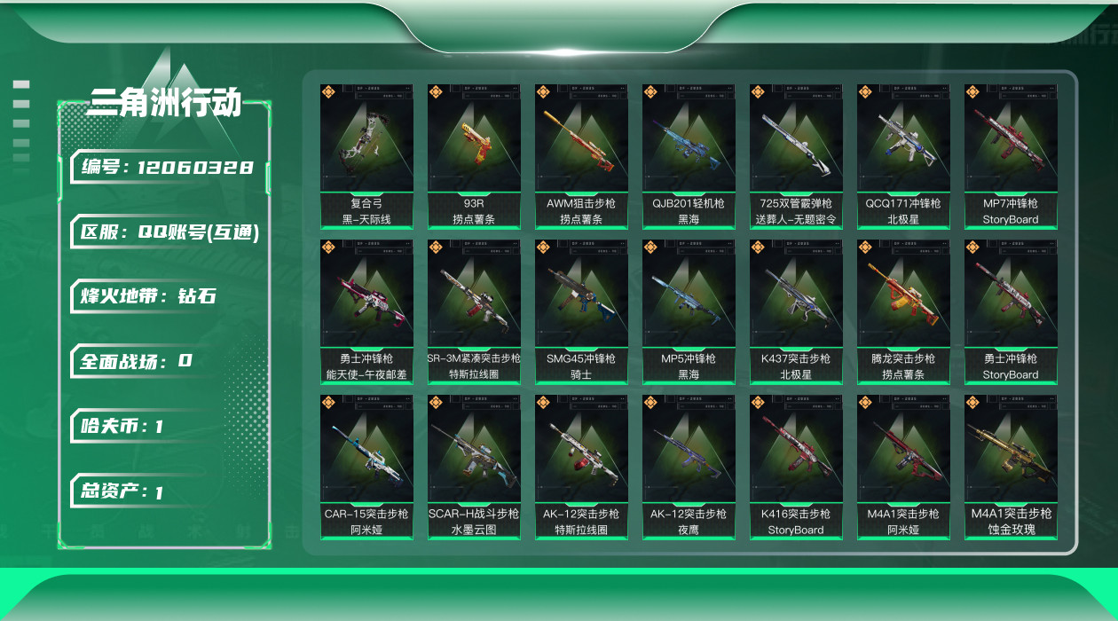 [12060328]总资产:1.2B 4干员外观 2近战传说 23传说枪械 哈夫币:1.051K 可二次 可修改实名 优质装备:近战-黑海,近战-北极星,顶级安全箱(3x3) 烽火地带段位:钻石 全面战场段位:列兵 传说武器皮肤:SCAR-H战斗步枪-水墨云图,SMG45冲锋枪-骑士,AWM狙击步枪-捞点薯条,腾龙突击步枪-捞点薯条,93R-捞点薯条,AK-12突击步枪-特斯拉线圈,SR-3M紧凑突击步枪-特斯拉线圈,勇士冲锋枪-能天使-午夜邮差,K416突击步枪-StoryBoard,MP7冲锋枪-StoryBoard,勇士冲锋枪-StoryBoard,复合弓-黑-天际线,K437突击步枪-北极星,QCQ171冲锋枪-北极星,725双管霰弹枪-送葬人-无题密令,M4A1突击步枪-阿米娅,CAR-15突击步枪-阿米娅,AK-12突击步枪-夜鹰,M4A1突击步枪-蚀金玫瑰,MP5冲锋枪-黑海,QJB201轻机枪-黑海 干员外观:红狼-蚀金玫瑰,骇爪-水墨云图,蜂医-送葬人·无题密令(S5),露娜-黑·天际线