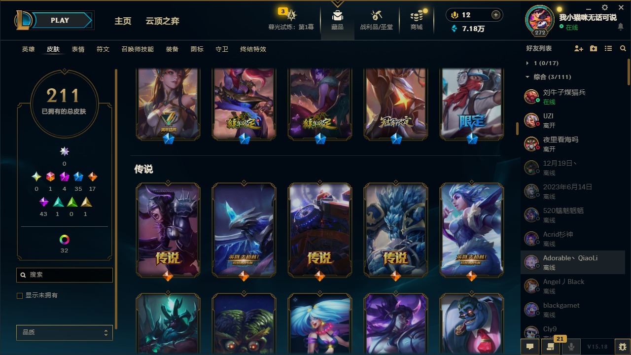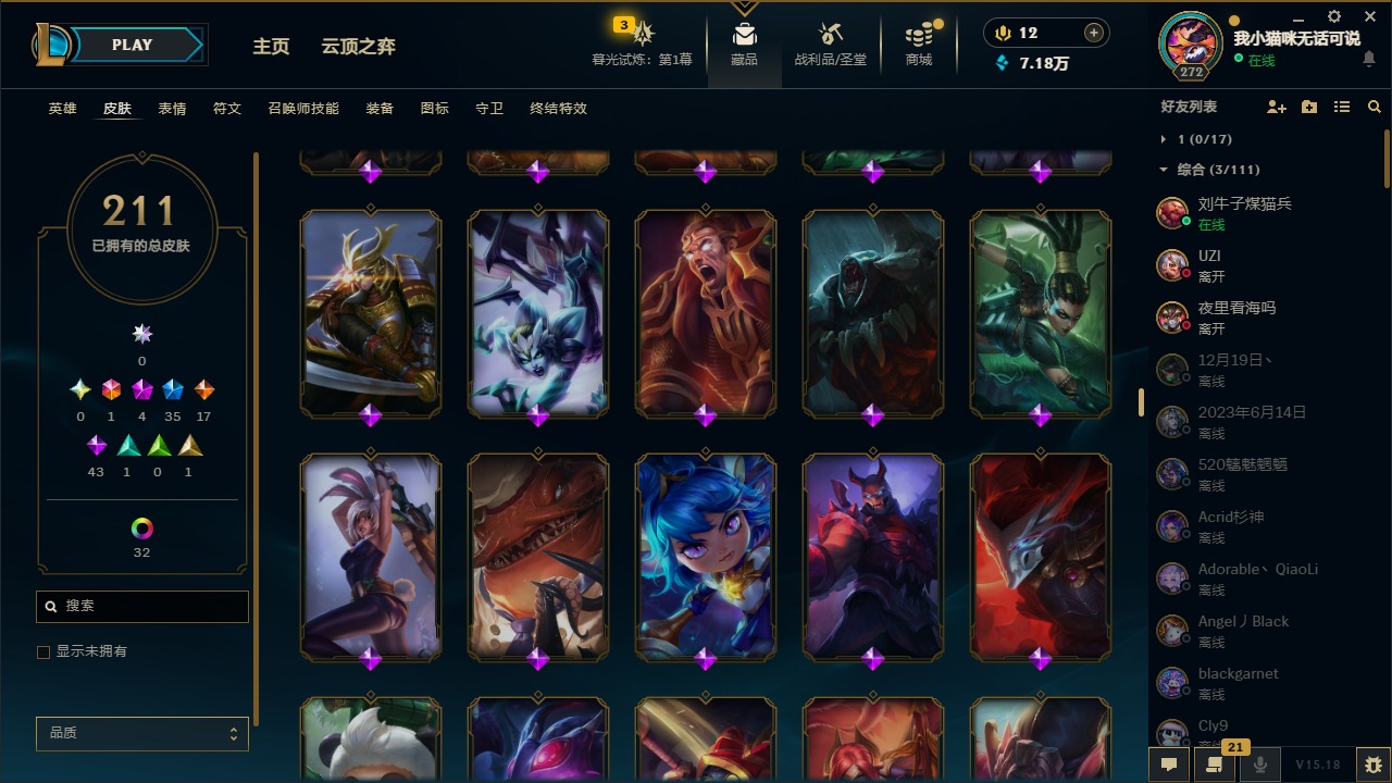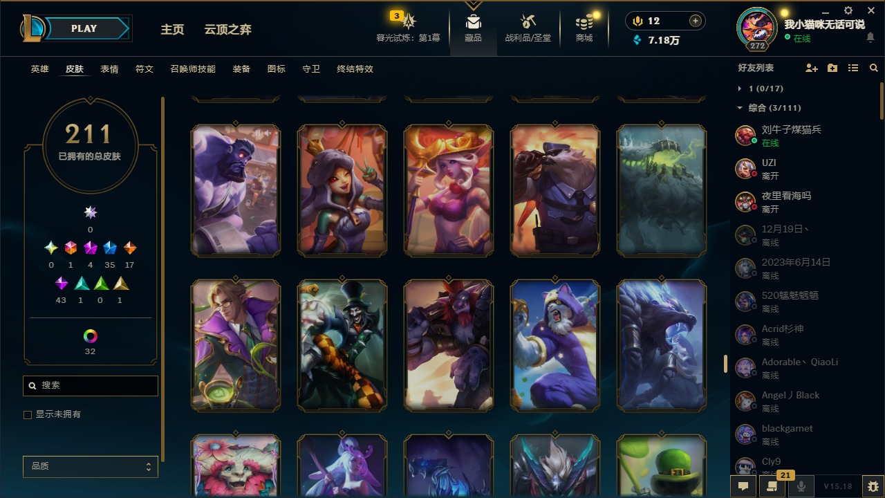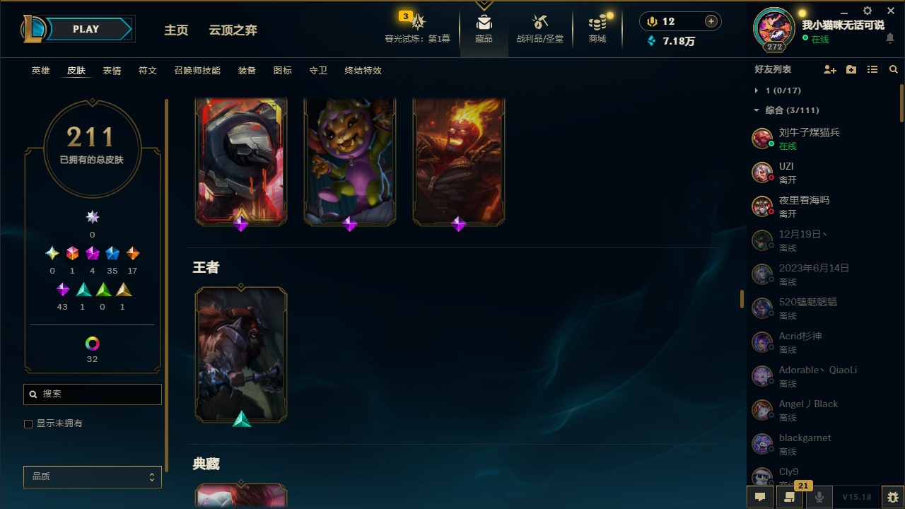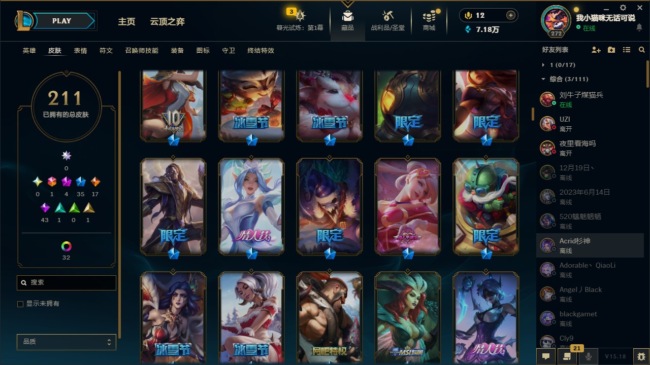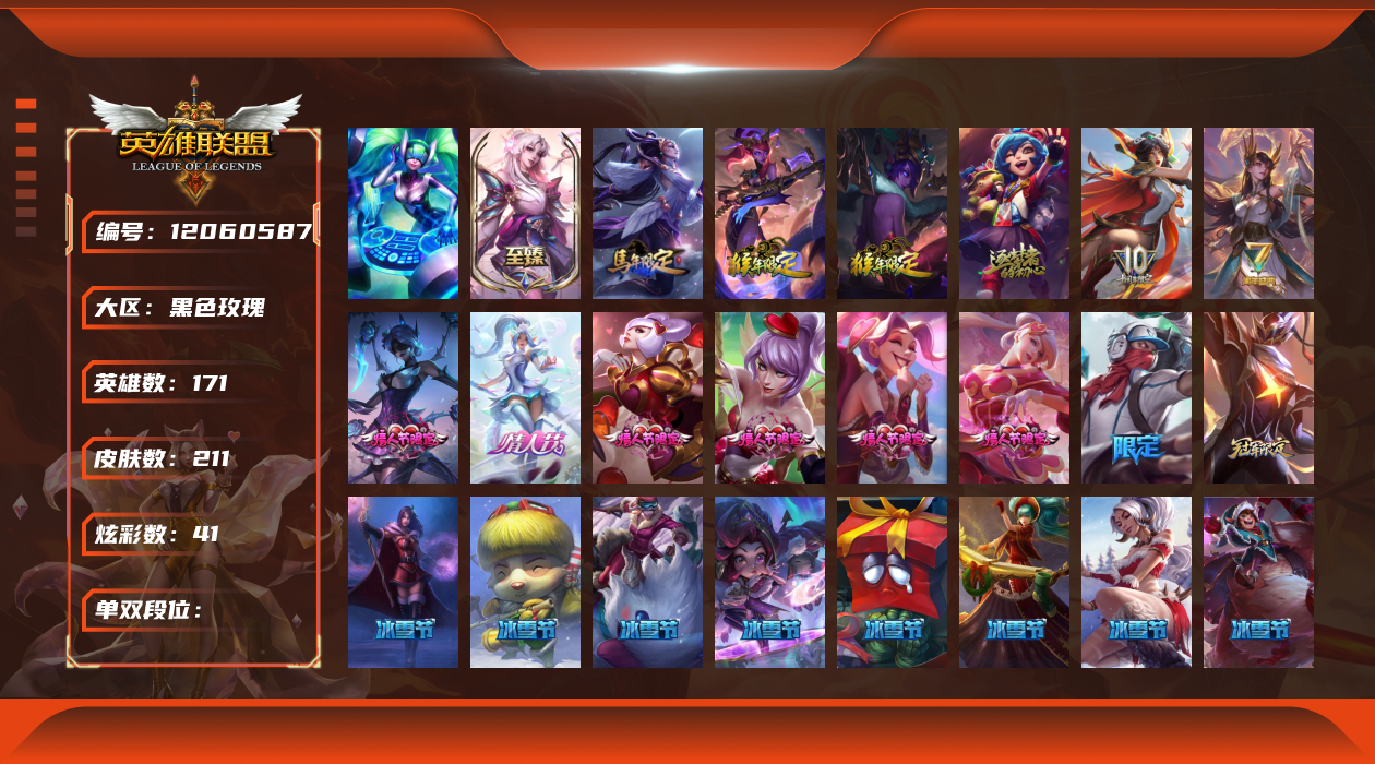 [12060587]1终极 4神话 35限定 17传说 43史诗 211皮肤 41炫彩 171英雄 可二次 可修改实名 优质装备:黎明使者 卡尔玛,防爆天使 凯尔,暗影 沃里克,都铎王朝 图奇,红桃杰克 崔斯特,惊悚派对 阿木木,糖果使徒 费德提克,野兽猎人 德莱文,永恒之森 乐芙兰,DJ-娑娜,玉剑传说 无极 麒麟,冠军之箭 艾希 凯旋圣装,幻灵战斗蝠 薇恩 梦幻强袭,觅心萝莉 金克丝 是心动啊,无畏骑士 瑟庄妮 赤子初心,外星装甲 库奇,冠军之隐 劫 凯旋圣装,净雪之月 莫甘娜 冬虹,十五周年纪念 希维尔,魔女 阿卡丽 虚荣,幻灵白鸽 萨勒芬妮 梦幻强袭,至臻 灵魂莲华 拉克丝,暗裔英雄 盖伦 情人节限定:觅心萝莉 金克丝,觅心魔灵 奥利安娜,觅心之翼 奎因,甜心宝贝 娑娜,幽梦玫瑰 蜘蛛,水晶玫瑰 迦娜 赛季限定皮:胜利女神 希维尔,胜利枪神 卢锡安,胜利机器人 布里茨 冠军限定系列:S4 SSW 炼金,S9 FPX 锤石 冰雪节限定:“主人不要我了” 阿木木,平安夜女神 娑娜,魄罗骑士 瑟庄妮,圣诞开心鬼 提莫,圣诞狂欢 努努,幸福女神 乐芙兰,雪装 奈德丽,北极星守望者 佐伊 万圣节限定:魅惑女巫 莫甘娜 年限:马年 黛安娜,猴年 凯特琳,猴年 莫甘娜 周年:7周年 艾瑞莉娅,10周年 安妮,10周年 霞