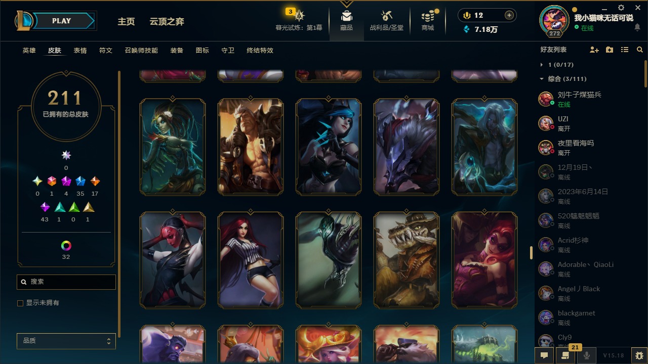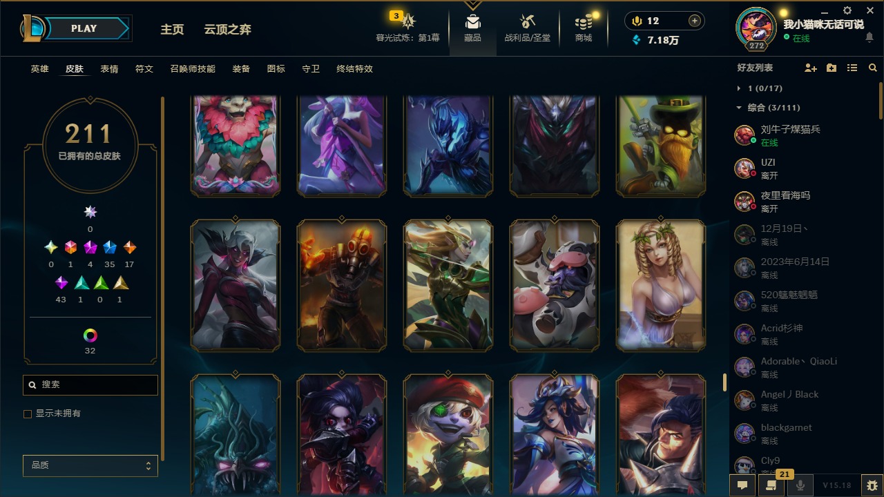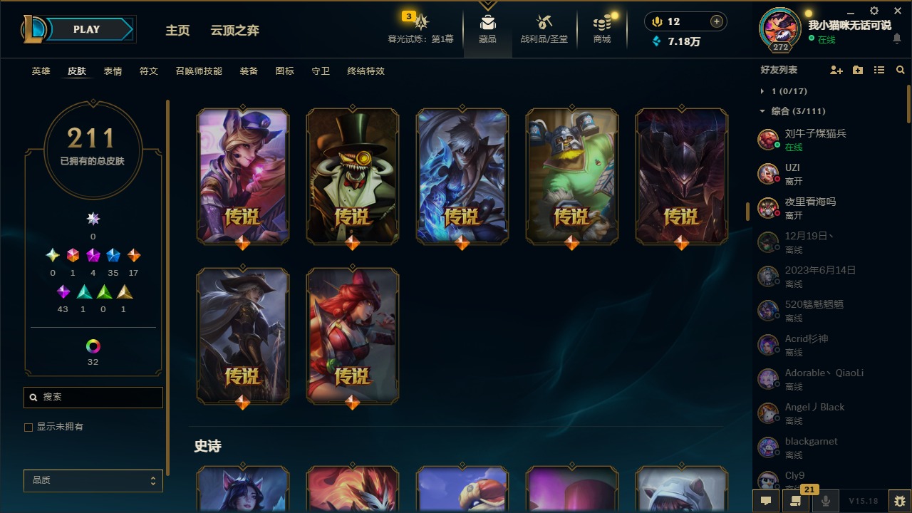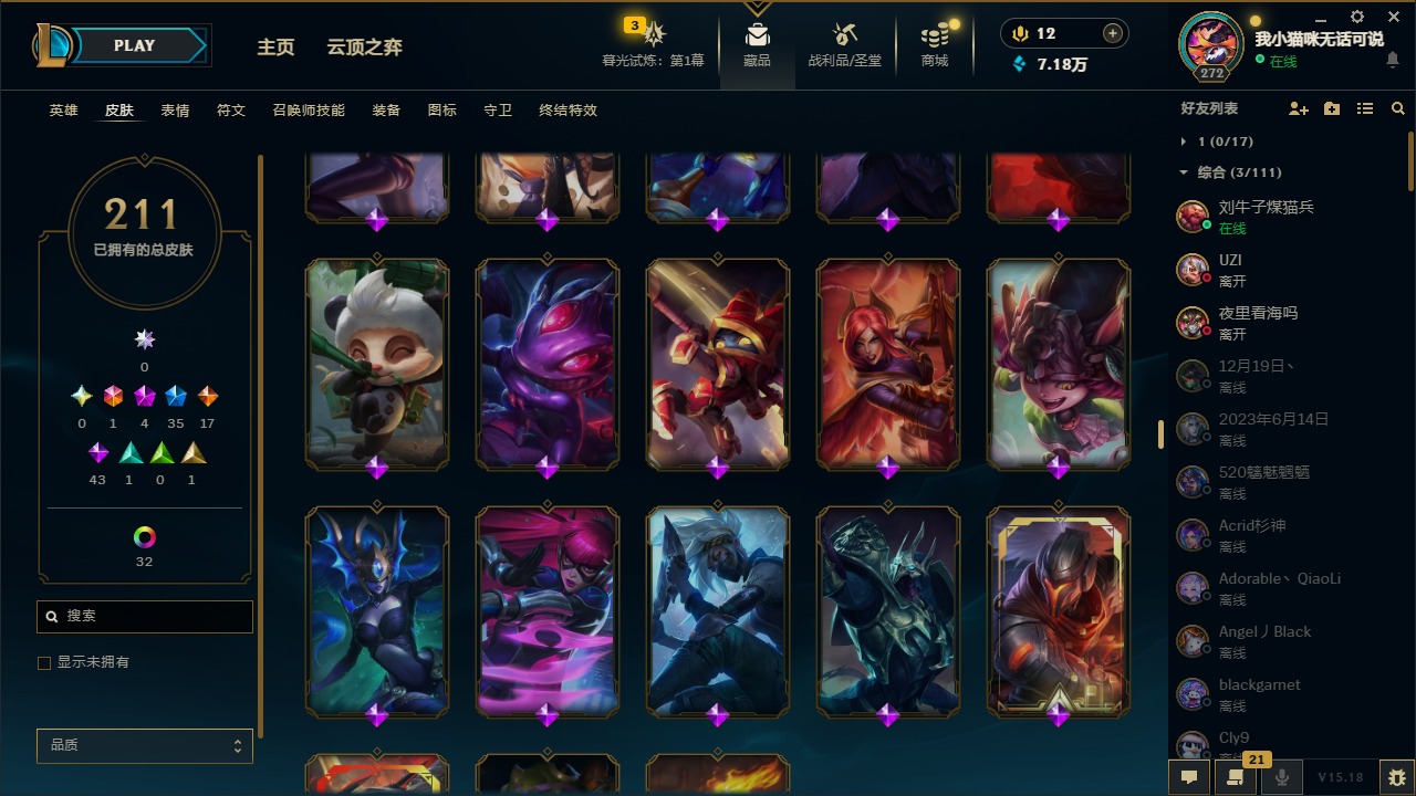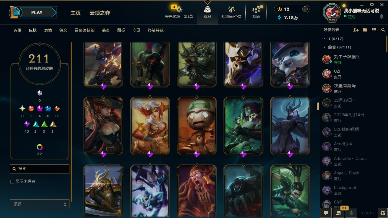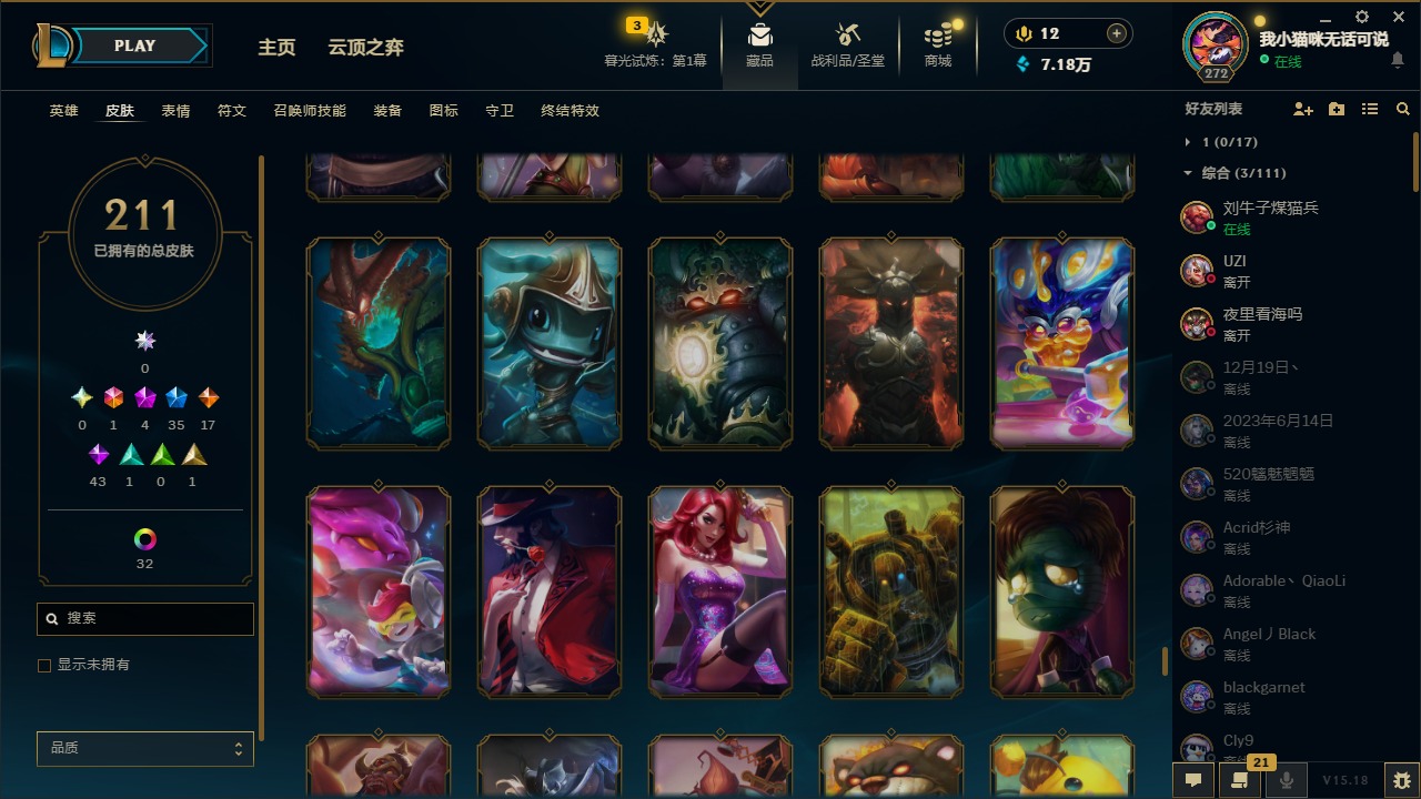 [12060587]1终极 4神话 35限定 17传说 43史诗 211皮肤 41炫彩 171英雄 可二次 可修改实名 优质装备:黎明使者 卡尔玛,防爆天使 凯尔,暗影 沃里克,都铎王朝 图奇,红桃杰克 崔斯特,惊悚派对 阿木木,糖果使徒 费德提克,野兽猎人 德莱文,永恒之森 乐芙兰,DJ-娑娜,玉剑传说 无极 麒麟,冠军之箭 艾希 凯旋圣装,幻灵战斗蝠 薇恩 梦幻强袭,觅心萝莉 金克丝 是心动啊,无畏骑士 瑟庄妮 赤子初心,外星装甲 库奇,冠军之隐 劫 凯旋圣装,净雪之月 莫甘娜 冬虹,十五周年纪念 希维尔,魔女 阿卡丽 虚荣,幻灵白鸽 萨勒芬妮 梦幻强袭,至臻 灵魂莲华 拉克丝,暗裔英雄 盖伦 情人节限定:觅心萝莉 金克丝,觅心魔灵 奥利安娜,觅心之翼 奎因,甜心宝贝 娑娜,幽梦玫瑰 蜘蛛,水晶玫瑰 迦娜 赛季限定皮:胜利女神 希维尔,胜利枪神 卢锡安,胜利机器人 布里茨 冠军限定系列:S4 SSW 炼金,S9 FPX 锤石 冰雪节限定:“主人不要我了” 阿木木,平安夜女神 娑娜,魄罗骑士 瑟庄妮,圣诞开心鬼 提莫,圣诞狂欢 努努,幸福女神 乐芙兰,雪装 奈德丽,北极星守望者 佐伊 万圣节限定:魅惑女巫 莫甘娜 年限:马年 黛安娜,猴年 凯特琳,猴年 莫甘娜 周年:7周年 艾瑞莉娅,10周年 安妮,10周年 霞