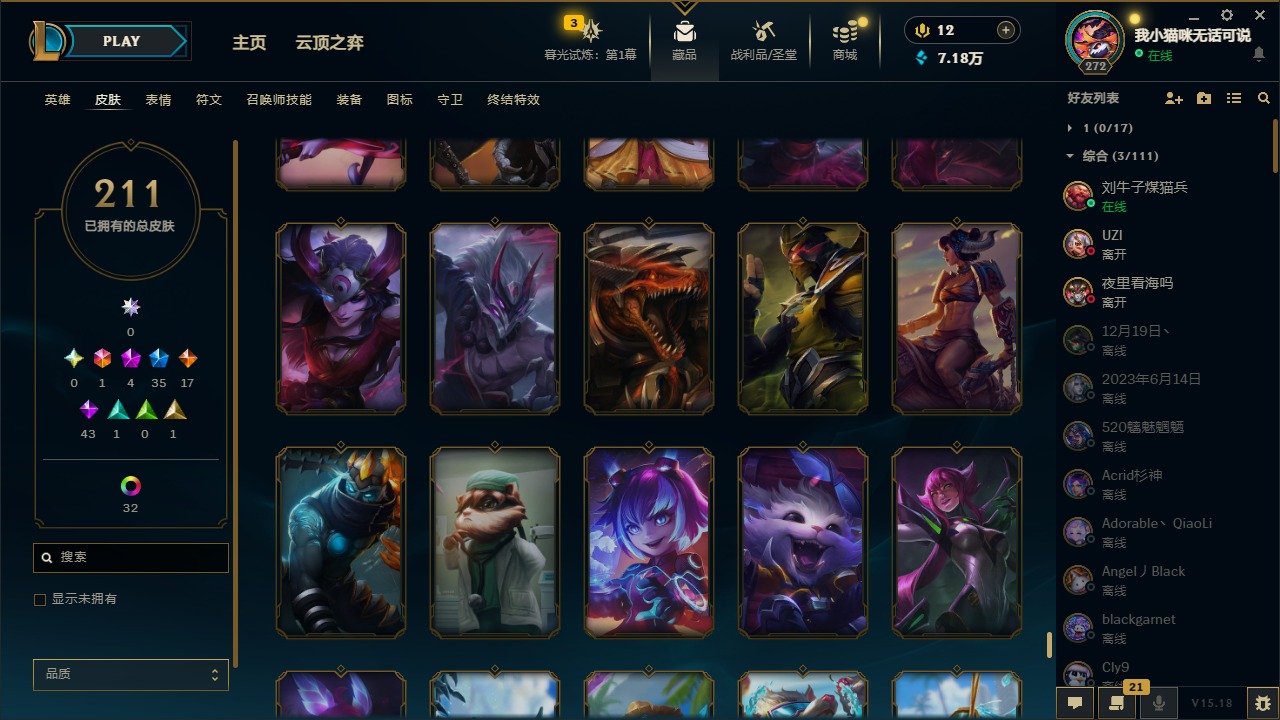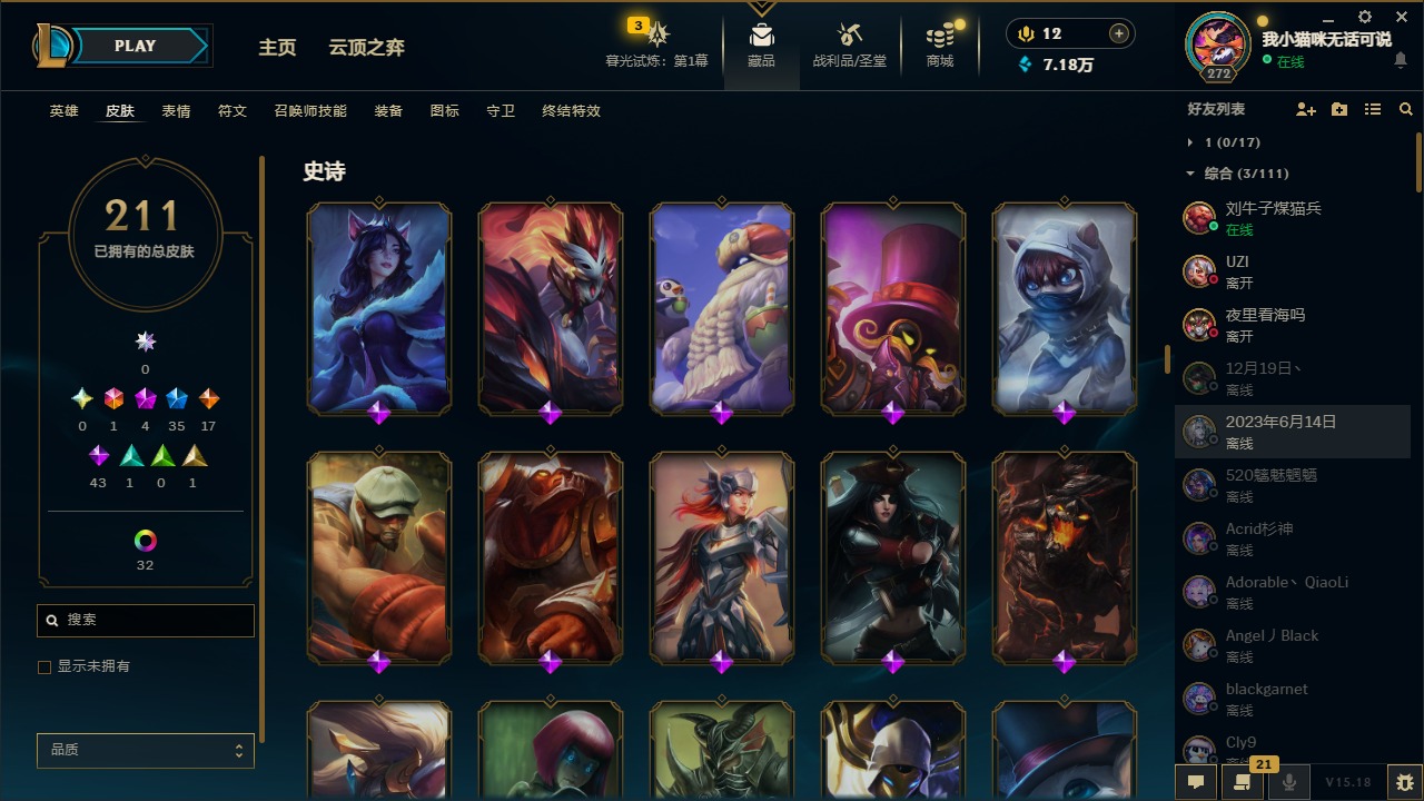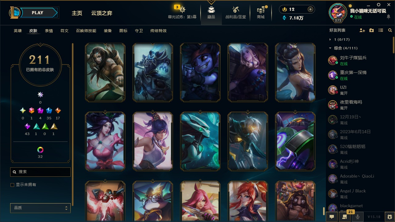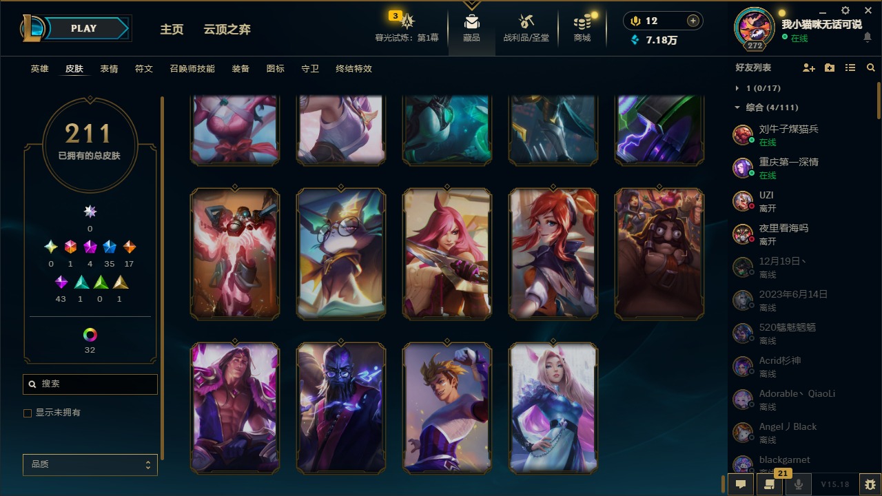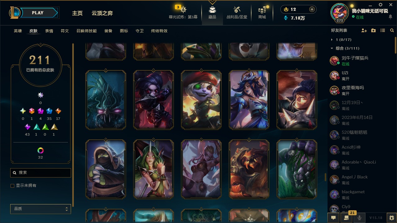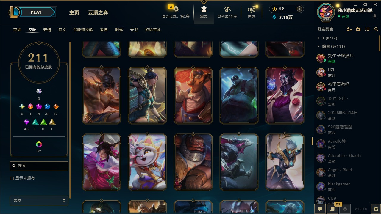 [12060587]1终极 4神话 35限定 17传说 43史诗 211皮肤 41炫彩 171英雄 可二次 可修改实名 优质装备:黎明使者 卡尔玛,防爆天使 凯尔,暗影 沃里克,都铎王朝 图奇,红桃杰克 崔斯特,惊悚派对 阿木木,糖果使徒 费德提克,野兽猎人 德莱文,永恒之森 乐芙兰,DJ-娑娜,玉剑传说 无极 麒麟,冠军之箭 艾希 凯旋圣装,幻灵战斗蝠 薇恩 梦幻强袭,觅心萝莉 金克丝 是心动啊,无畏骑士 瑟庄妮 赤子初心,外星装甲 库奇,冠军之隐 劫 凯旋圣装,净雪之月 莫甘娜 冬虹,十五周年纪念 希维尔,魔女 阿卡丽 虚荣,幻灵白鸽 萨勒芬妮 梦幻强袭,至臻 灵魂莲华 拉克丝,暗裔英雄 盖伦 情人节限定:觅心萝莉 金克丝,觅心魔灵 奥利安娜,觅心之翼 奎因,甜心宝贝 娑娜,幽梦玫瑰 蜘蛛,水晶玫瑰 迦娜 赛季限定皮:胜利女神 希维尔,胜利枪神 卢锡安,胜利机器人 布里茨 冠军限定系列:S4 SSW 炼金,S9 FPX 锤石 冰雪节限定:“主人不要我了” 阿木木,平安夜女神 娑娜,魄罗骑士 瑟庄妮,圣诞开心鬼 提莫,圣诞狂欢 努努,幸福女神 乐芙兰,雪装 奈德丽,北极星守望者 佐伊 万圣节限定:魅惑女巫 莫甘娜 年限:马年 黛安娜,猴年 凯特琳,猴年 莫甘娜 周年:7周年 艾瑞莉娅,10周年 安妮,10周年 霞