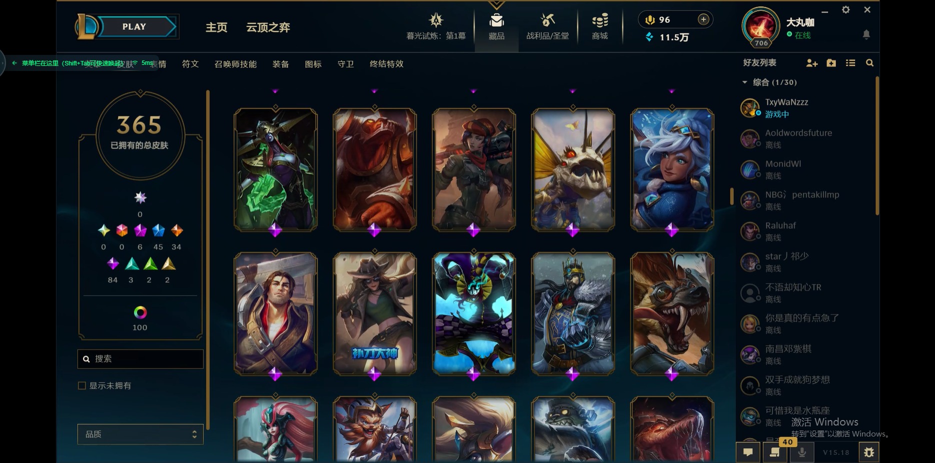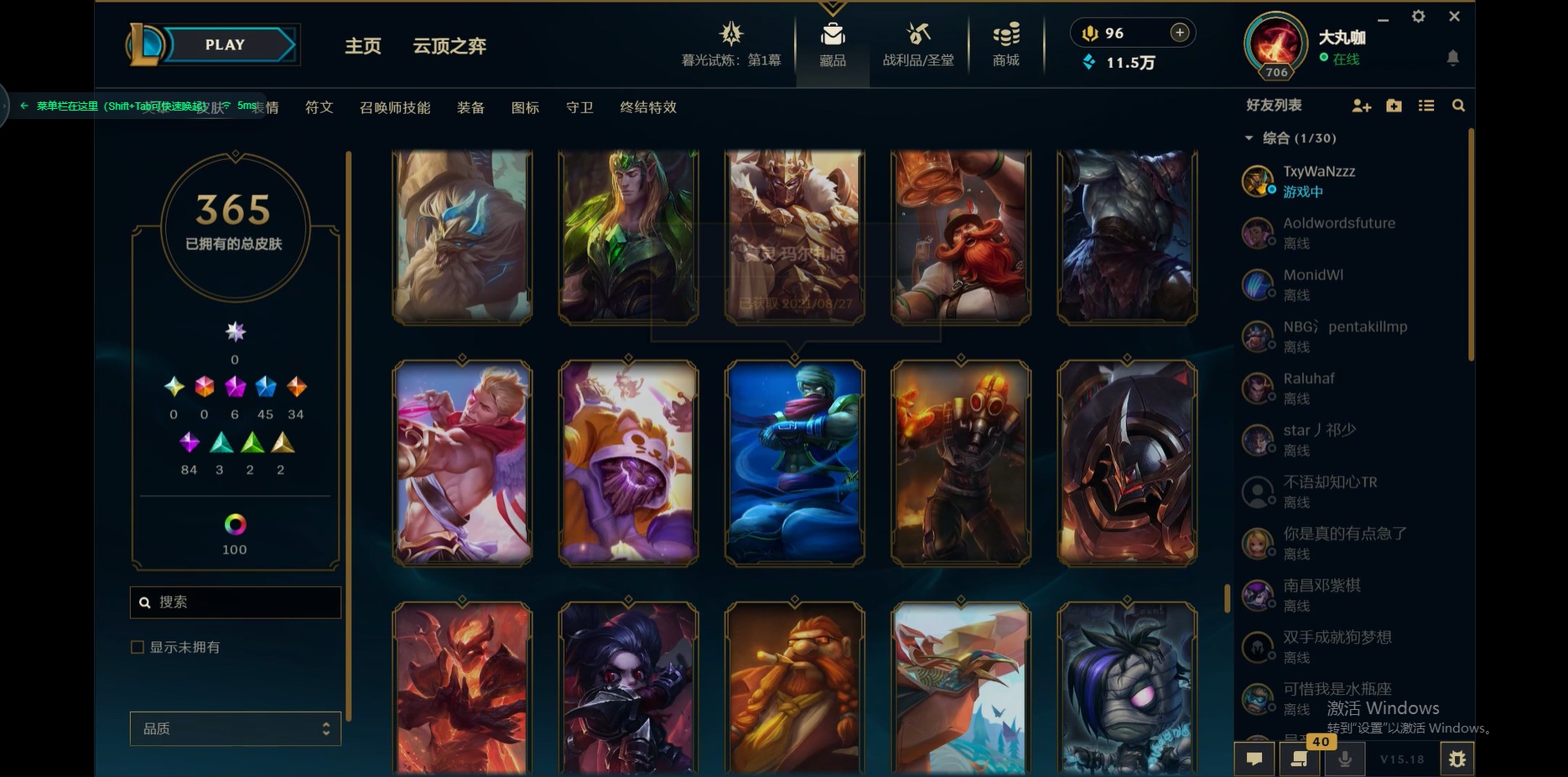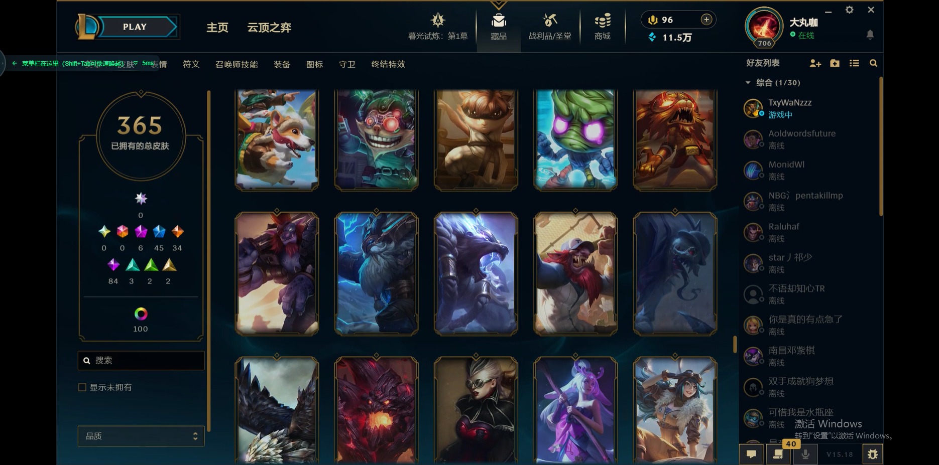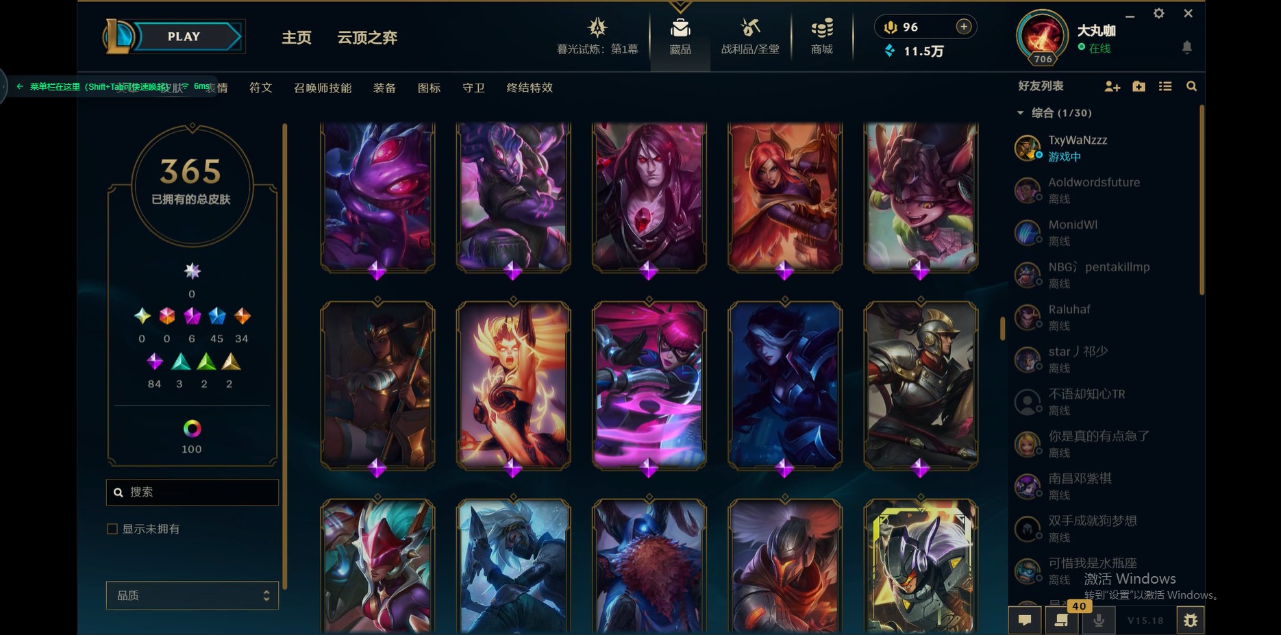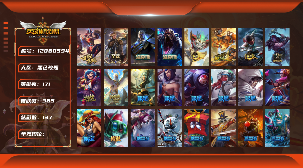 [12060594]6神话 45限定 34传说 84史诗 365皮肤 137炫彩 171英雄 可二次 可修改实名 优质装备:至臻 灵能特工 伊泽瑞尔,源代码 乐芙兰,防爆天使 凯尔,暗影 沃里克,巧克力工坊 波比,都铎王朝 图奇,冠军之刃 锐雯,警用试作体K-9 内瑟斯,蒙多蒙多,密林猎手 提莫,糖果使徒 费德提克,奥德赛 吉格斯,玉净夜叉 凯特琳 炫金神机,雾雨之刃 锐雯,天煞 劫 恒星游历者,无畏骑士 瑟庄妮 赤子初心,外星装甲 库奇,可爱可爱粉红红 布里茨,净雪之月 莫甘娜 冬虹,银龙裁夬 泰隆 潜龙在渊,魔女 阿卡丽 虚荣 海克斯:海克斯 雷克顿,海克斯 斯维因 限定:玉剑传说 舞龙卫 赛季限定皮:胜利凤凰 艾尼维亚,胜利之运 崔斯特,胜利剑圣 易,胜利女神 娑娜,胜利巨口 克格莫,胜利之王 泰达米尔,胜利女神 莫甘娜,胜利女神 希维尔,胜利之树 茂凯,胜利枪神 格雷福斯,胜利女神 奥利安娜,胜利之剑 剑魔,胜利枪神 卢锡安,胜利机器人 布里茨,胜利女神 瑟庄妮 冠军限定系列:S1FNC 迦娜,S3 SKT T1 贾克斯,S3 SKT T1 婕拉,S4 SSW 泰隆,S4 SSW 炼金,S7 SSG 洛 冰雪节限定:“主人不要我了” 阿木木,胡桃夹子 小丑,魄罗骑士 瑟庄妮,圣诞驯鹿 克格莫,邪恶圣诞老人 维迦,雪默丁格 泳池派对:泳池派对 吉格斯,泳池派对 厄运小姐 万圣节限定:南瓜头 费德提克 年限:天龙之子 斯莫德,龙年 泰隆,猴年 孙悟空 周年:2周年 德莱厄斯,10周年 安妮,10周年 凤凰