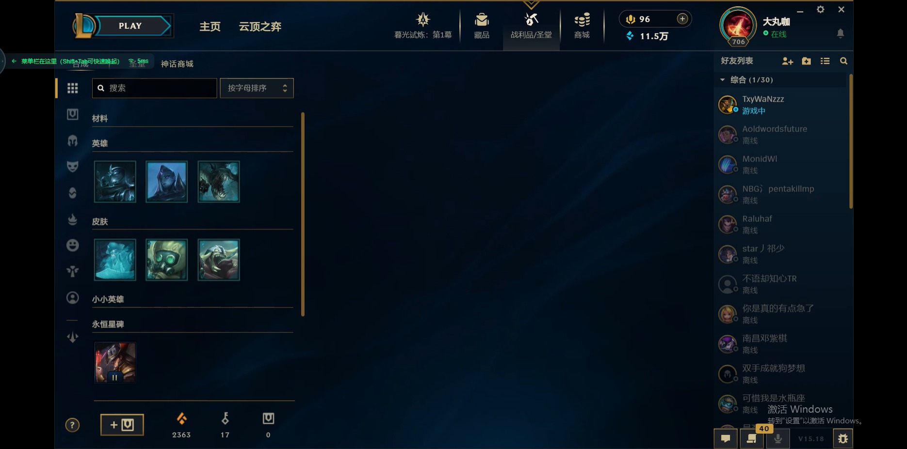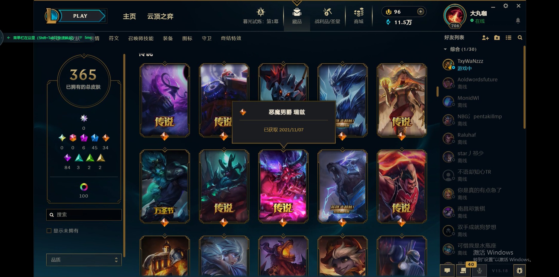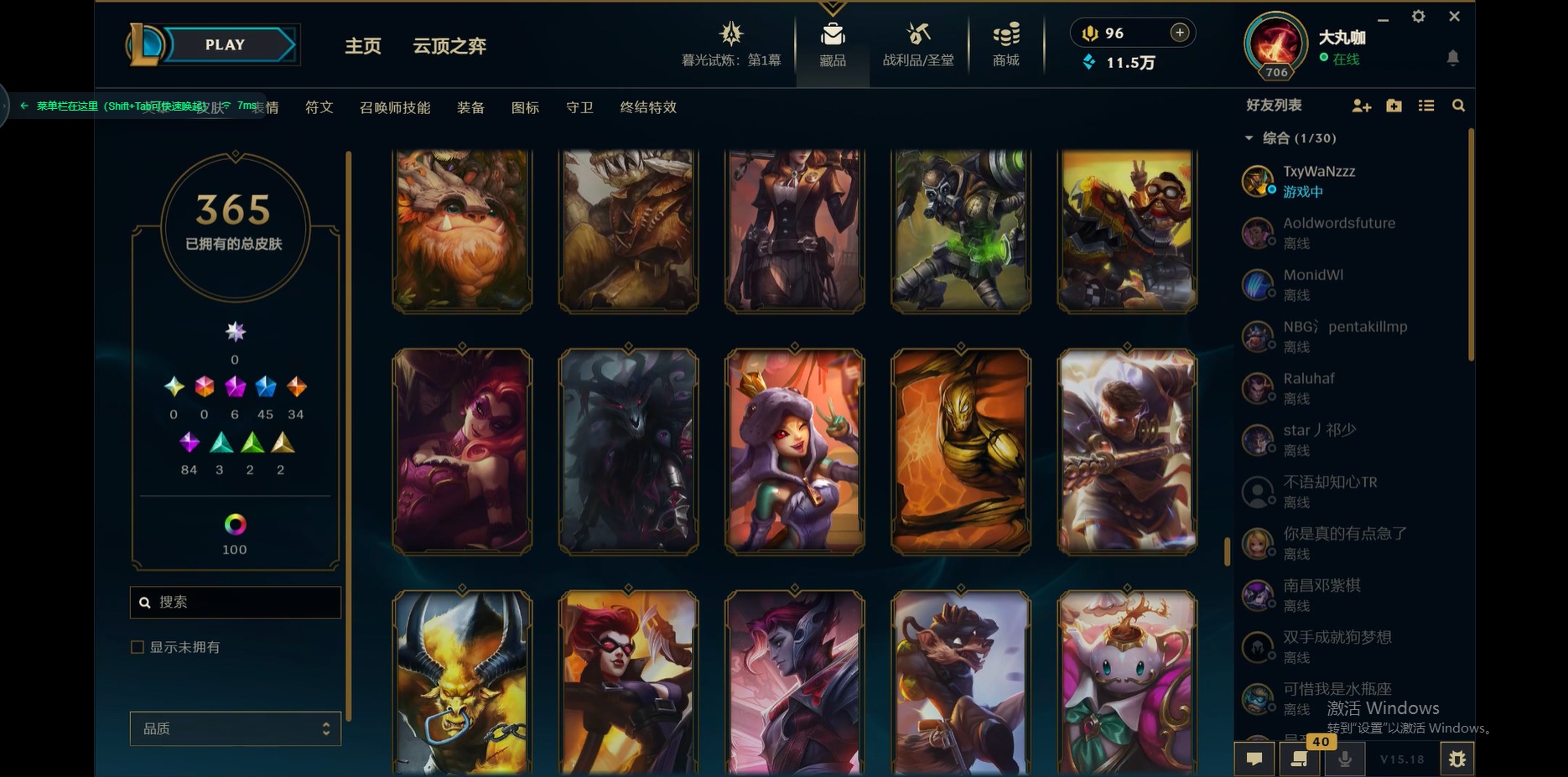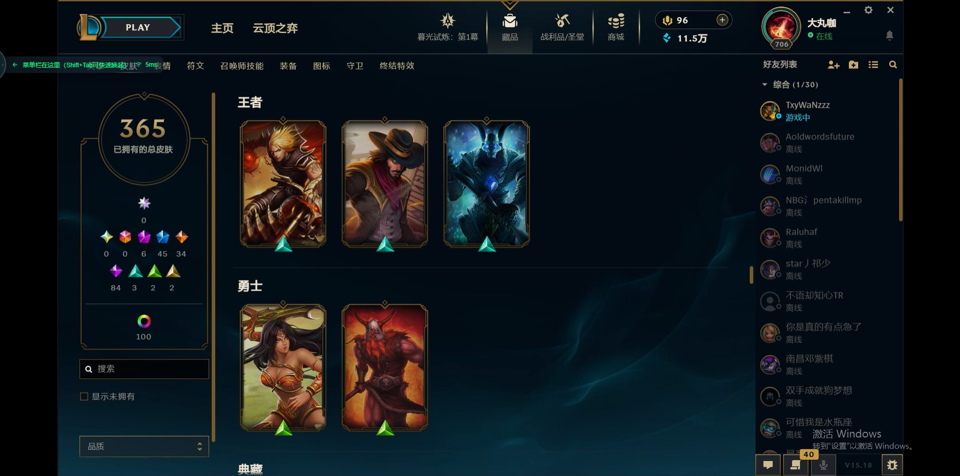 - [11553581]V7 3传说 120英雄 159皮肤 可修改实名 优质装备:云鹰飞将(小将军),地狱火 珍宝阁皮:女武神 限定皮:飞衡(韩信年限),诗剑行,五谷丰年,梁祝,李小龙,孙行者,青春决赛季 史诗皮:特工魅影,千年之狐,江河有灵,百解令(蒙犽),冰冠公主,修罗,水果甜心,德古拉伯爵,暗隐猎兽者,纤云弄巧,金属风暴,圣诞狂欢,鹰眼统帅,暗夜贵公子,魅力维加斯