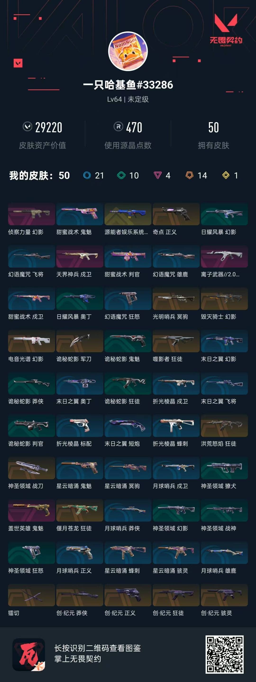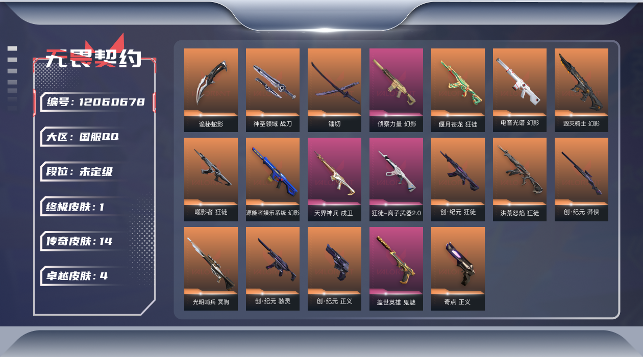[12060678]14橙皮 1金皮 4紫皮 50皮肤 19英雄 43卡面 470已用源晶 未定级 优质装备:正义-奇点,幻影-源能者娱乐系统,冥驹-光明哨兵,狂徒-偃月苍龙,幻影-侦察力量,狂徒-洪荒怒焰,幻影-毁灭骑士,戍卫-天界神兵,鬼魅-盖世英雄,镭切,神圣领域 战刀,诡秘蛇影 套装:创·纪元套装 佩枪皮肤:正义-创·纪元 冲锋枪皮肤:骇灵-创·纪元 步枪皮肤:狂徒-创·纪元,狂徒-噬影者,幻影-电音光谱,狂徒-离子武器2.0 狙击枪皮肤:莽侠-创·纪元