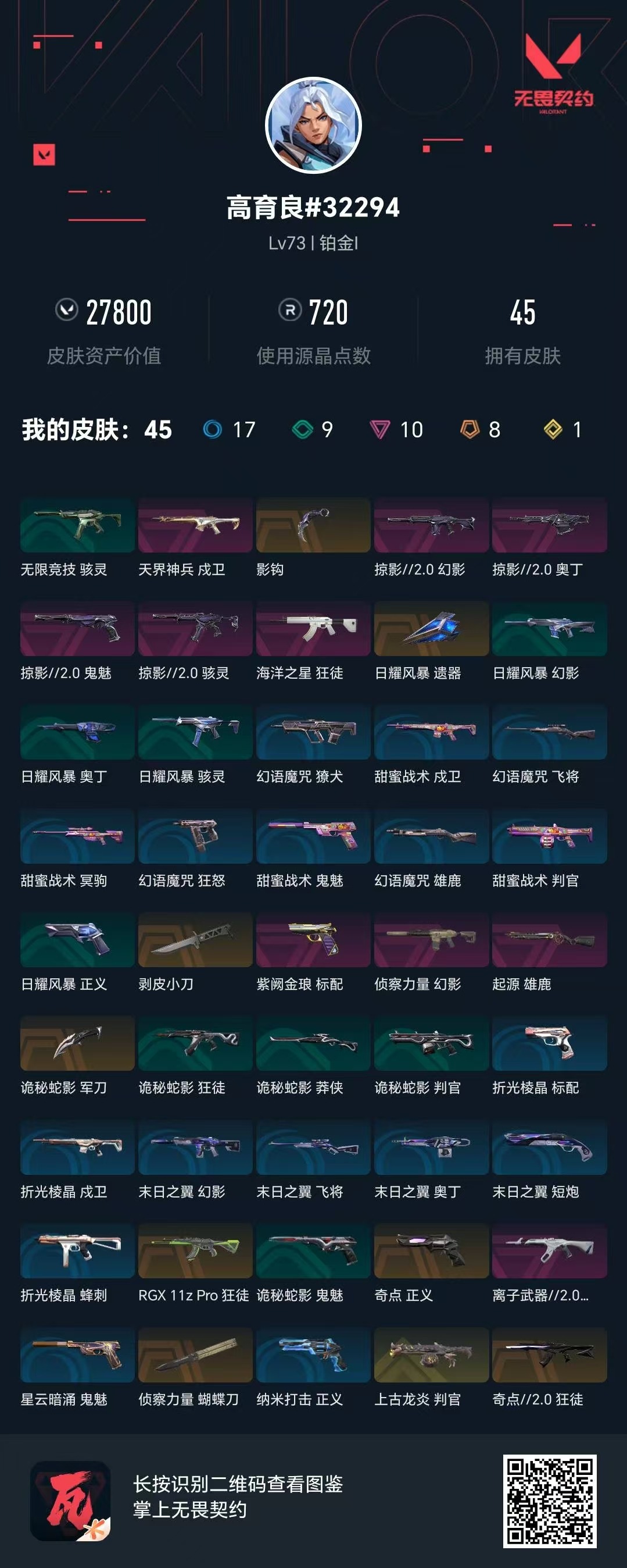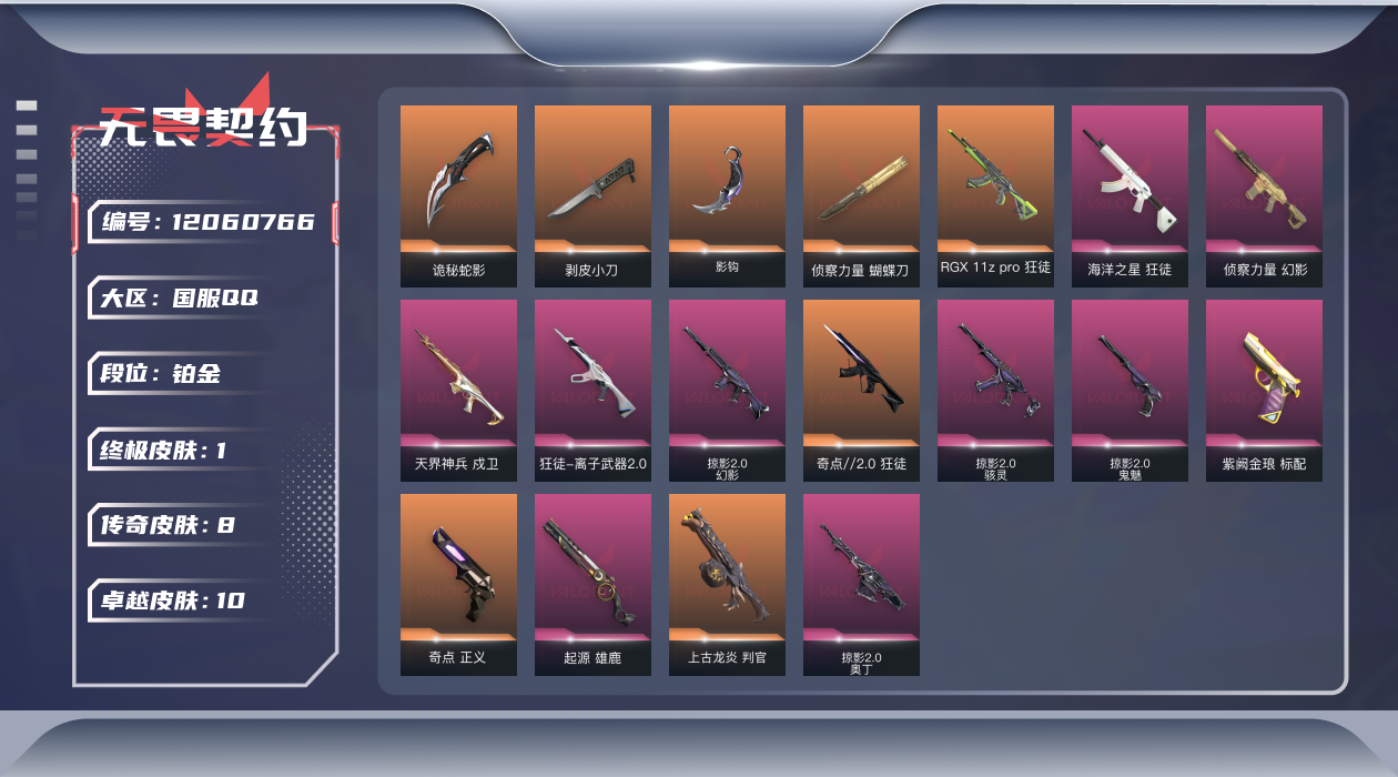 [12060766]8橙皮 1金皮 10紫皮 45皮肤 15英雄 78卡面 720已用源晶 铂金 优质装备:正义-奇点,幻影-侦察力量,狂徒-奇点//2.0,标配-紫阙金琅,蝴蝶刀-侦察力量,戍卫-天界神兵,剥皮小刀,诡秘蛇影,影钩,雄鹿-起源 套装:掠影2.0套装 佩枪皮肤:鬼魅-掠影2.0 冲锋枪皮肤:骇灵-掠影2.0 霰弹枪皮肤:判官-上古龙炎 步枪皮肤:幻影-掠影2.0,RGX 11z pro 狂徒,狂徒-离子武器2.0,狂徒-海洋之星 机枪皮肤:奥丁-掠影2.0