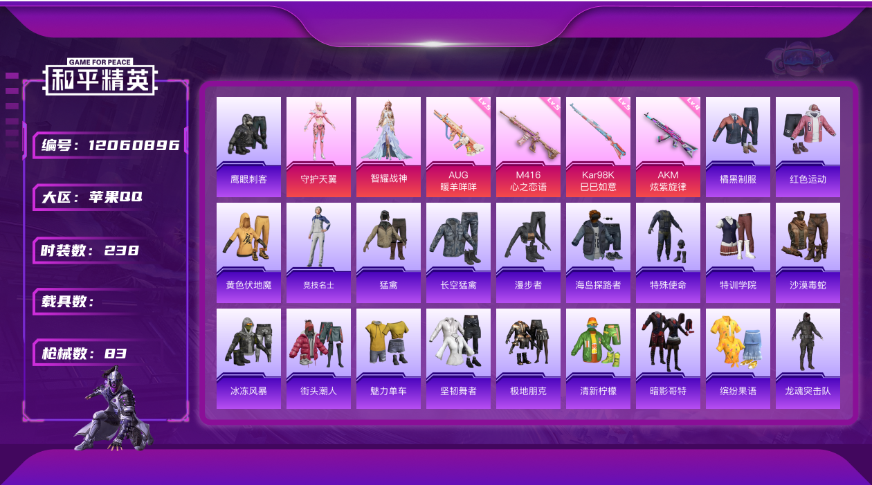 - PX_2095700- 苹果手Q-13王牌印记-12粉装-11特效枪-3载具-120521热力值-258套装-350枪皮-5卓越印记-3传奇印记 【12粉装】,梦幻火箭,2号机款机体服,宝贝奶油派,天使彩虹糖,新星烈龙,洛天依,星穹咏叹调,金曜白虎,筑梦精灵,PEL轰鸣竞梦者,彩虹鹿灵,未来战士 【11特效枪】AKM-甜心宝贝-7级 SCAR-L-机甲封神-1级 SCAR-L-梦幻火箭-7级 M4