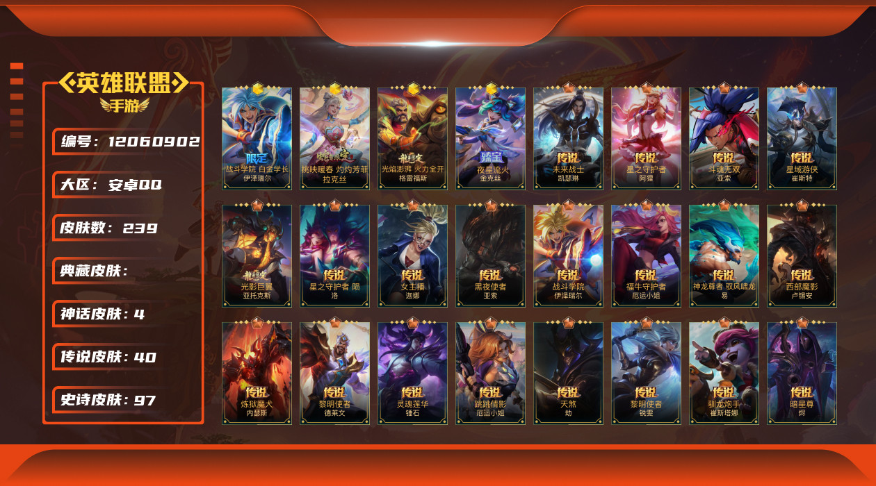 [12060902]40传说 97史诗 239皮肤 可二次 可修改实名 优质装备:暗星尊,福牛守护者女枪,灌篮高手,黑夜使者亚索,K/DA ALLOUT萨勒芬妮,黎明使者锐雯,炼狱魔犬,女主播风女,欧米伽小队 幽灵特工,神龙尊者 驭风啸龙,神拳盲僧,神王盖伦,神王诺手,天煞劫,西部魔影卢锡安,西部天使寒冰,星域游侠卡牌,星之守护者金克丝,星之守护者阿狸,星之守护者 辉,星之守护者 落,星之守护者 陨,驯龙炮手,源计划:净化,源计划:联合,月蚀骑士蕾欧娜,战斗学院ez,玉剑传说 武剑仙,灵魂莲华锤石,源计划:泯灭,光明哨兵格雷福斯,战斗学院EZ白金学长,跳跳倩影女枪,未来战士女警,灵魂莲华腕豪 段位:翡翠 神话皮:夜星流火 金克丝,桃映暖春 灼灼芳菲 拉克丝,火焰澎湃火力全开 限定皮肤:赵云子龙,星之守护者霞,星之守护者洛,关羽云长 传说皮:光影巨翼亚托克斯,黎明使者德莱文,花车开起来咯 墨菲特,斗魂无双亚索,翩翩绣蕊 霞,北极星神 黛安娜,黎明使者永恩