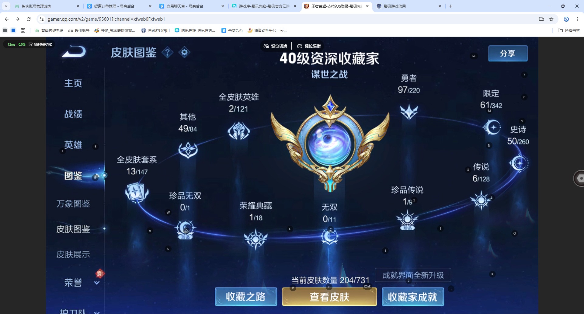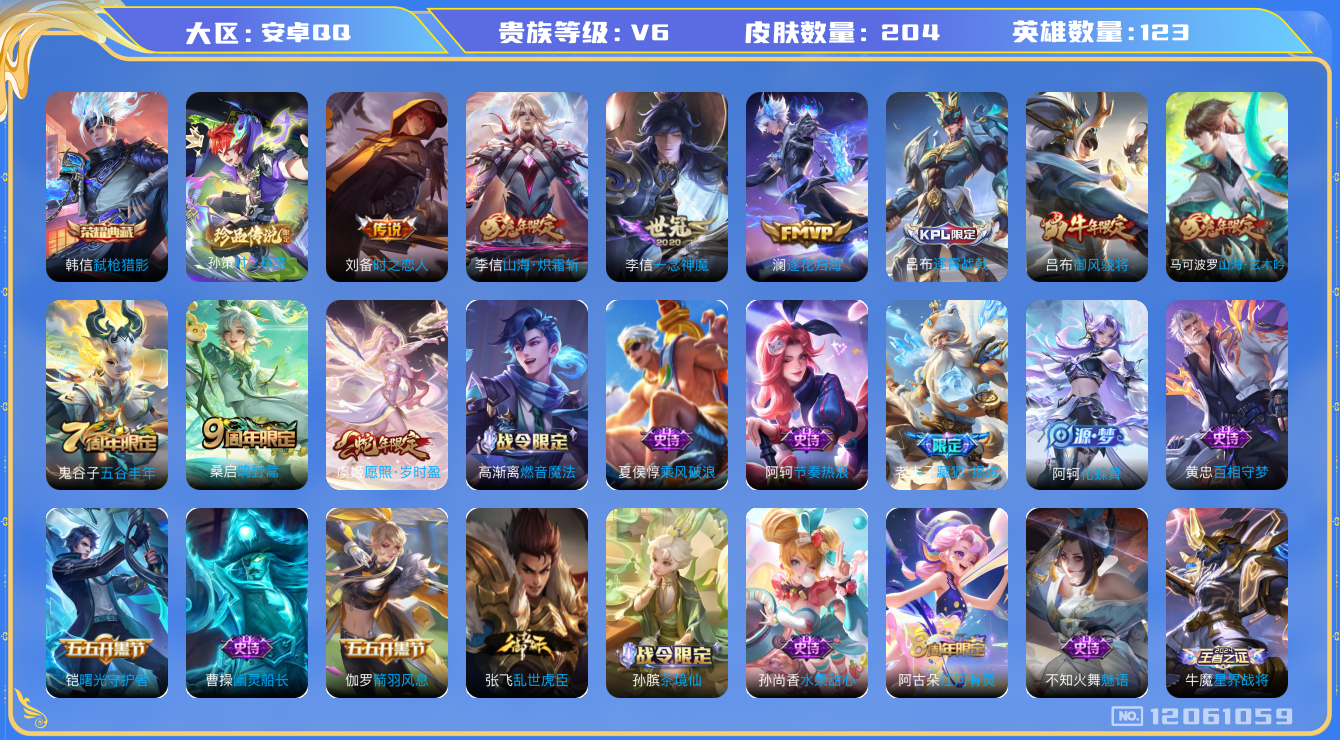 [12061059]V6 1典藏 1珍品传说 6传说 123英雄 204皮肤 可修改实名 优质装备:弑枪猎影(韩信典藏),一念神魔,时之恋人-刘备(电焊工),山海·炽霜斩(李信年限),澜逐花归海 珍品传说:时之奇旅-孙策 珍宝阁皮:妄想食味 限定皮:愿照·岁时盈(虞姬年限),逐霄战戟,鸣野蒿,五谷丰年,御风骁将(吕布年限),山海·玄木吟(马可年限) 史诗皮:鸭鸭历险记-刘禅,器灵·浮梦炉,化蝶舞,星界战将,龙之律动,藏狐·褐绒,茶境仙,破空之剑,蒙犽顽岩魄,蔬乡物语(鲁班七号),百相守梦-百里守约,百相守梦-黄忠,紫霞仙子,特工魅影,江河有灵,魅语,百解令(蒙犽),高渐离燃音魔法,偶像歌手,末日机甲-吕布,乱世虎臣,节奏热浪,水果甜心,星夜王子,暗隐猎兽者,幽灵船长,鬼剑武藏,乐园奇幻夜,舞动绿茵,纤云弄巧,乘风破浪,逐浪之夏,水晶猎龙者,曙光守护者,箭羽风息,金属风暴,原初追逐者,鹰眼统帅,魅力维加斯,未来纪元-赵云