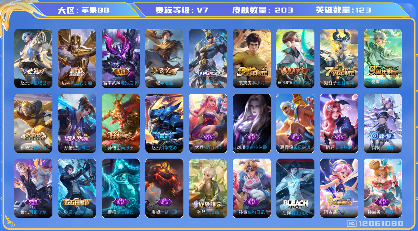 [12061080]V7 5传说 123英雄 203皮肤 可修改实名 优质装备:黄金射手座,地狱之眼,李逍遥,淬星耀世,涂山容容 珍宝阁皮:玩趣恶龙 限定皮:逐霄战戟,鸣野蒿,至尊宝,五谷丰年,李小龙,孙行者,引擎之心,美猴王,山海·玄木吟(马可年限) 史诗皮:化蝶舞,龙之律动,石田雨龙,茶境仙,埋骨钱,蔬乡物语(鲁班七号),百相守梦-百里守约,百相守梦-黄忠,紫霞仙子,黄金分割率,江河有灵,魅语,冰冠公主,电玩·爆裂旋风,猫狗日记-孙策,猫狗日记-大乔,节奏热浪,摇滚巨星,水果甜心,绅士熊喵,天才门将,星夜王子,心灵骇客,功夫厨神,德古拉伯爵,暗隐猎兽者,幽灵船长,鬼剑武藏,地狱岩魂,乘风破浪,逐浪之夏,水晶猎龙者,曙光守护者,金属风暴,圣诞狂欢,圣诞恋歌,鹰眼统帅,赏金猎手,无心,未来纪元-赵云