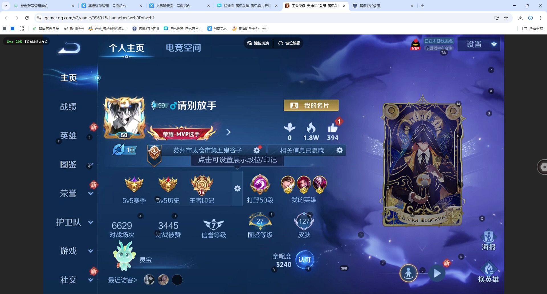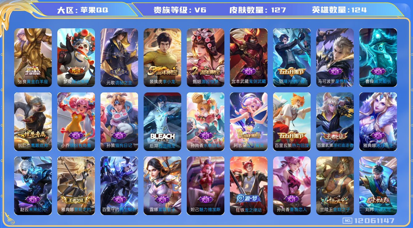 [12061147]V6 3传说 124英雄 127皮肤 可修改实名 优质装备:黄金白羊座,胖达荣荣,诡秘之主 珍宝阁皮:蔷薇恋人 限定皮:游园惊梦,李小龙 史诗皮:龙之律动,石田雨龙,星界特工,紫霞仙子,特工魅影,江河有灵,冰冠公主,猫狗日记-孙策,水果甜心,幽灵船长,鬼剑武藏,缤纷独角兽,曙光守护者,热力回旋,原初追逐者,鹰眼统帅,魅力维加斯,黎明之约,未来纪元-赵云