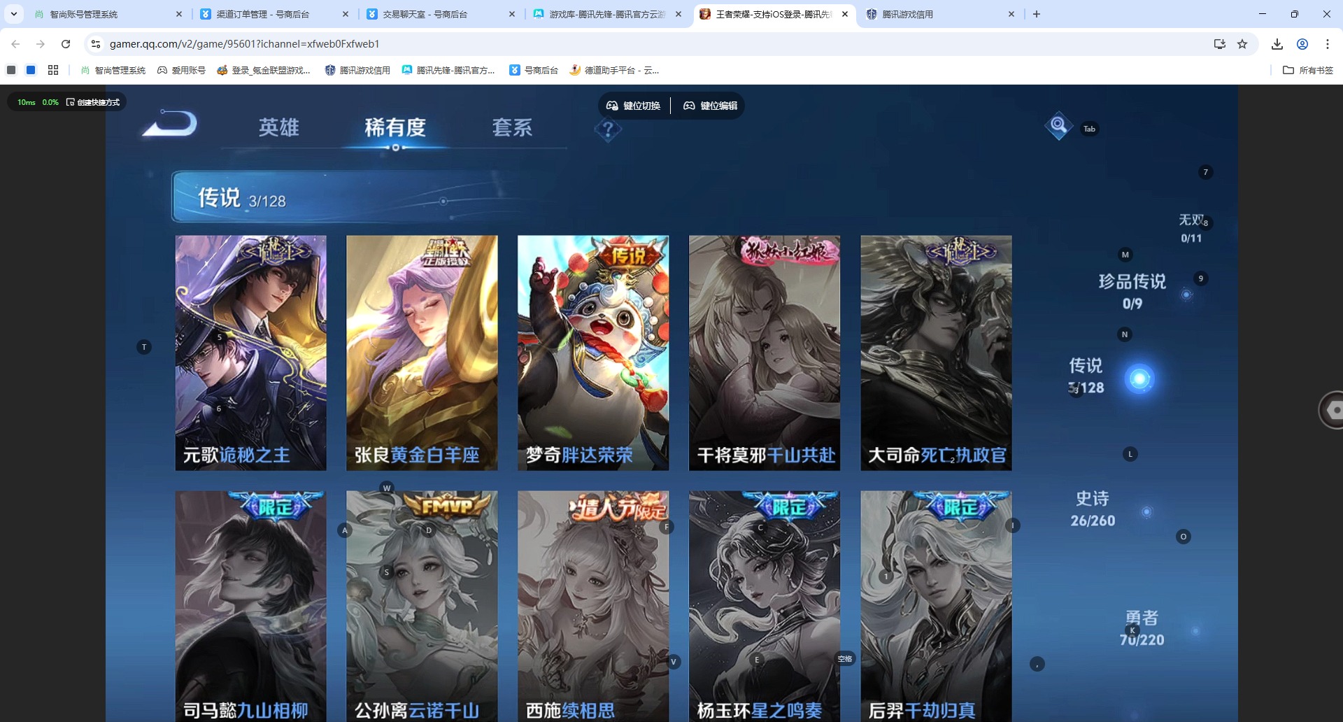 - [11625150]V7 2传说 123英雄 236皮肤 可修改实名 优质装备:地狱火 珍宝阁皮:蔷薇恋人 限定皮:逐霄战戟,鸣野蒿,至尊宝,高山流水,游园惊梦,梁祝,李小龙,逐梦之影,孙行者,引擎之心 史诗皮:灵蛊蚀心,破空之剑,百相守梦-百里守约,百相守梦-黄忠,苍穹之光,特工魅影,千年之狐,暗夜猫娘,乱世虎臣,节奏热浪,女仆咖啡,水果甜心,天才门将,星夜王子,心灵骇客,功夫厨神,暗隐猎兽者,幽灵船长,鬼剑武藏,心灵战警,舞动绿茵,纤云弄巧,繁星吟游(呼啦呼啦),拒霜思,缤纷独角兽,水晶猎龙者,曙光守护者,金属风暴,原初追逐者,圣诞狂欢,圣诞恋歌,鹰眼统帅,魅力维加斯,未来纪元-赵云