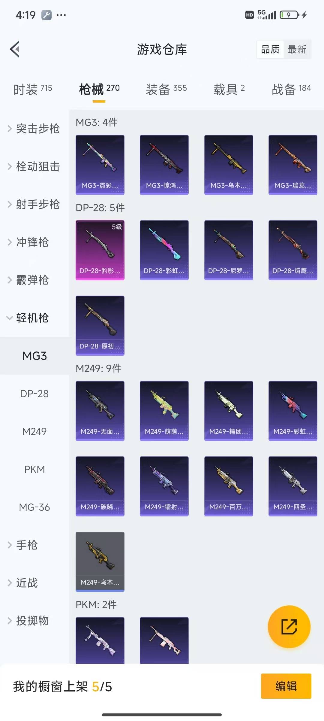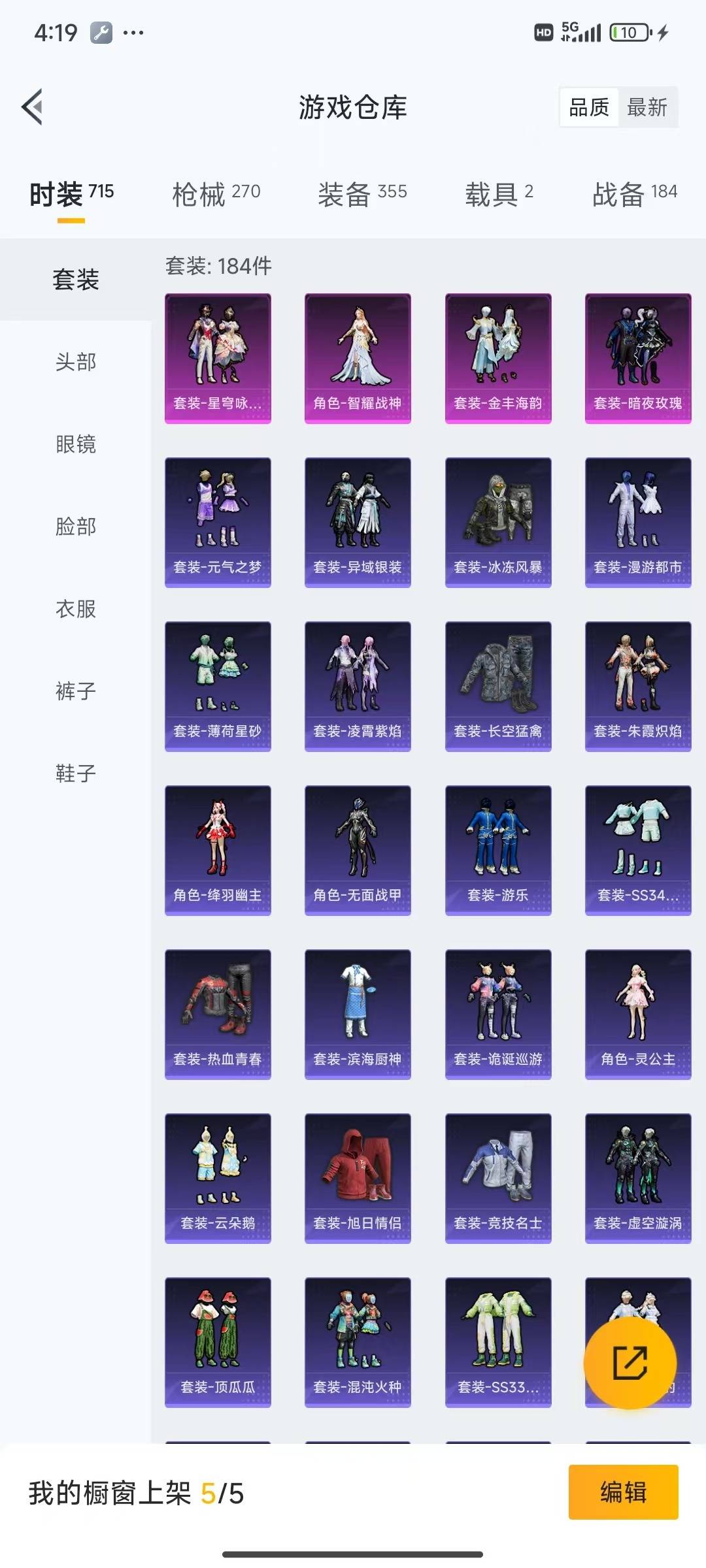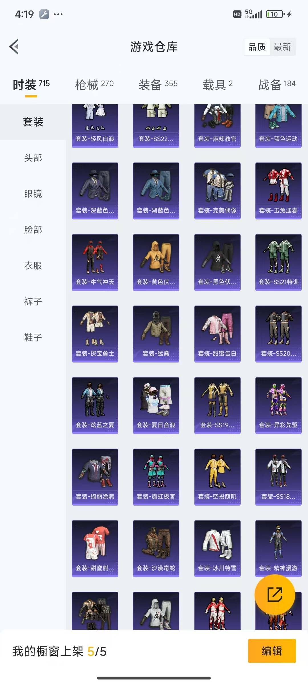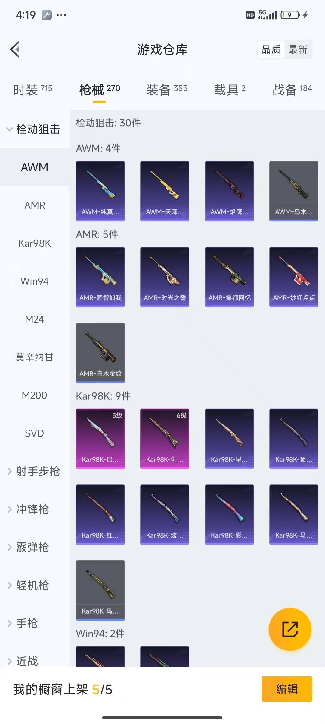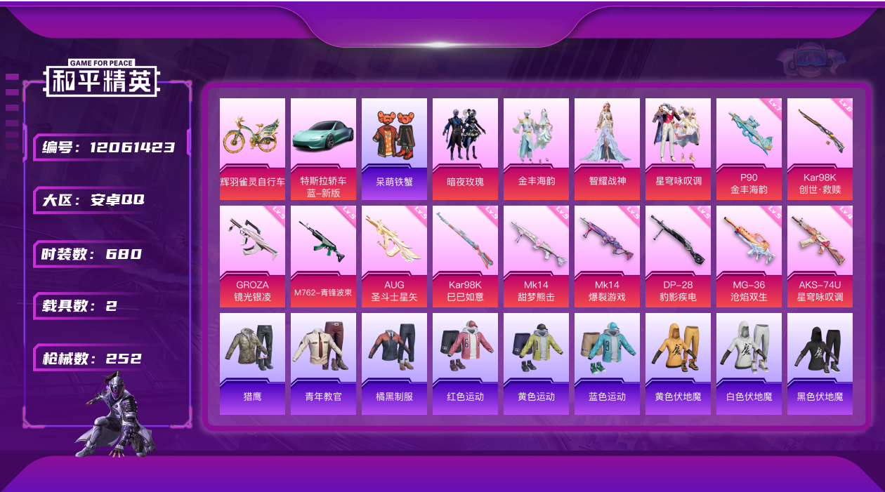 [12061423]4粉装 11特效枪 2载具 15印记 可二次 可修改实名 身法装备:暗影哥特(红眼罩),Mark.06(新蓝螳螂) 优质装备:辉羽雀灵自行车,特斯拉Roadster(水滴蓝),六级Kar98K-创世·救赎,Kar98K创世·救赎,P90-金丰海韵,七级P90-金丰海韵,M762-青锋波束,GROZA-镜光银凌,智耀战神,AUG-圣斗士星矢,星穹咏叹调,AKS-74U-星穹咏叹调,MK14-甜梦熊击,Mk14-爆裂游戏,Kar98K-巳巳如意 热门装扮:暗夜玫瑰,金丰海韵,呆萌铁蟹 稀有枪皮:MG-36-沧焰双生,DP-28-豹影疾电 五级特效枪:五级M762-青锋波束,五级GROZA-镜光银凌,五级Kar98K-巳巳如意,五级m14爆裂游戏,五级DP-28-豹影疾电,五级MG-36-沧焰双生,五级MK14-甜梦熊击,五级AUG-圣斗士星矢 四级特效枪:四级AKS-74U-星穹咏叹调 紫色装扮:SS23特训,虚空漩涡,SS30特训套装,SS31特训套装,云朵鹅,雪绒豹,SS33特训套装,旭日情侣,诡诞巡游,SS21特训,田园牧歌,轻风白浪,和煦暖阳,SS22特训,顶瓜瓜,混沌火种,冷焰舞者,吉莉礼服,夏日音浪,完美偶像,帅气教官,幻影武者,冰川特警,灵公主,人气偶像,SS16特训,瑞龙福将,团圆交子,SS17特训,治愈之星,科技之星,SS14特训,萌趣颜团子,特种颜团子,青春冒险家,潮流游乐家,SS15特训,蝎王蛇后,SS20特训,竞技角斗士,异彩先驱,SS18特训,SS19特训,战地菁英,黄色名流,青年教官,风暴特警,飞行日记,骑行爱好者,魅力单车,鹤鸣,麻辣教官,黄色伏地魔,黄色运动,黑色伏地魔,龙的传人,龟仙人,冰河战士,龙魂突击队,蝶变,酷潮明星,霓虹极客,野性战心,长空猛禽,雨林探路者,银刃勇者大衣,熔岩游骑兵连帽夹克,无面战甲,绛羽幽主,街头潮人,深蓝色名流,湖蓝色名流,灰色格斗者,灼焰舞者,炫蓝之夏,热血青春,牛气冲天,牛气满满,海岛探路者,战地督导,探宝勇士,极地朋克,柠萌假日,格斗先锋,橘黑制服,沙漠毒蛇,竞技达人朋克,红色运动,绮丽涂鸦,缤纷果语,蓝彩潮人,蓝色运动,虎虎生威吉莉,空投萌叽,特殊使命,特训学院,狂沙舞者,猎鹰,猛禽,王牌教练,甜蜜告白,甜蜜熊情侣,空岛之星,白熊同盟,白色伏地魔,破晓战魂,破蛋小黄鸡,福星高照,萝兰蝴蝶,SS2