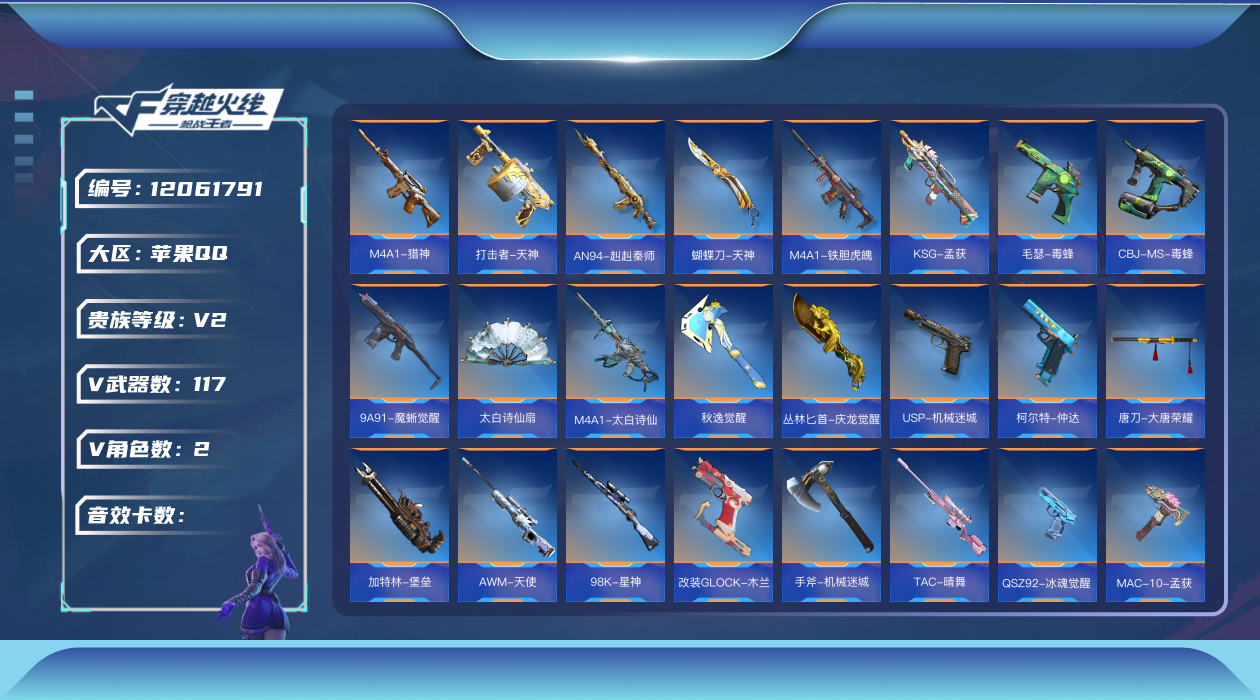 [12061791]可二次 可修改实名 V2 1王者武器 117英雄武器 2英雄角色 183万化 大师 武器:王者之影,M200-幻神,AWM-妙才,KSG-孟获,TAC-慈,TAC-晴舞,巴雷特-极光,巴雷特-毁灭,M4A1-死神,M4A1-雷神,AK47-黑武士觉醒,M4A1-黑骑士,AK47-木兰,AWM-天使,AUG-机械纪元,TAC-天使,98K-黑骑士,M4A1-猎神,M4A1-破空冰刃,M4A1-夏清觉醒,M4A1-海骑士,AK47-血武士,AK47-华夏传说,M4A1-赛博雷神,AK47-黑鲨,M200-心动次元觉醒,09式狙-天神,AWM-裁决,SCAR-幽暗骑士,98K-星神,加特林-堡垒,AA12-火药,CBJ-MS-毒蜂,地狱火,打击者-天神,柯尔特-仲达,M4A1-太白诗仙,9A91-魔蜥觉醒,AN94-赳赳秦师,沙鹰-修罗,毛瑟-毒蜂,改装GLOCK-木兰,USP-机械迷城,手斧-机械迷城,M4A1-铁胆虎魄,尼泊尔-冰锋觉醒,沙鹰-天神,血阳,神罚战斧,丛林匕首-庆龙觉醒,屠龙,唐刀-大唐荣耀,秋逸觉醒,星芒,太白诗仙扇,蝴蝶刀-天神,女皇利刃-铁胆虎魄,黑骑士闪光弹,黑骑士手雷,黑骑士烟雾弹,燃烧弹-游骑兵,闪光弹-游骑兵,烟雾弹-游骑兵,闪光弹-惊涛骇浪,死神手雷,高爆手雷-神工天巧,破邪蛇棍觉醒,手雷-鼓龙,甩棍-卧龙觉醒,蟒蛇-鼓龙,双持沙鹰-元让,AWM-指南针,掠夺者P365-虹舞,清刚-觉醒,炽芒蝶刀,AN94-盖,SCAR-心动PICK,GLOCK18-猎神,左轮-卧龙觉醒,龙爪手-鼓龙,马来剑-耀金伯爵,气勇胆烈戟,CZS2-仲康,AK47-钢铁狂热,烟雾弹-星际宇航,末日裁决觉醒,M1887-幽冥玄喵觉醒,MAC-10-孟获,QSZ92-冰魂觉醒,烈焰弓,手雷-游骑兵,AWM-大湾溢彩,黑骑士燃烧弹