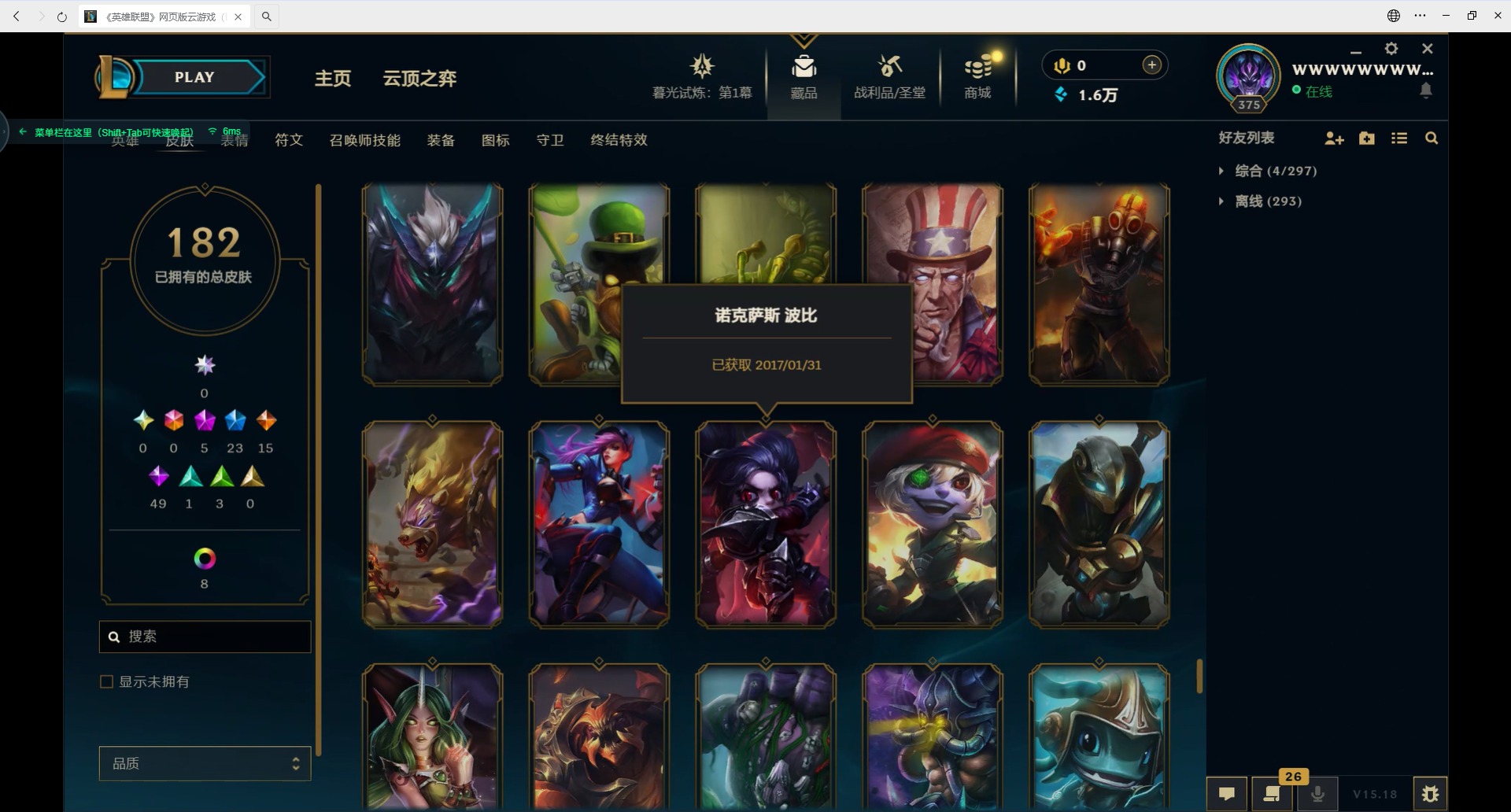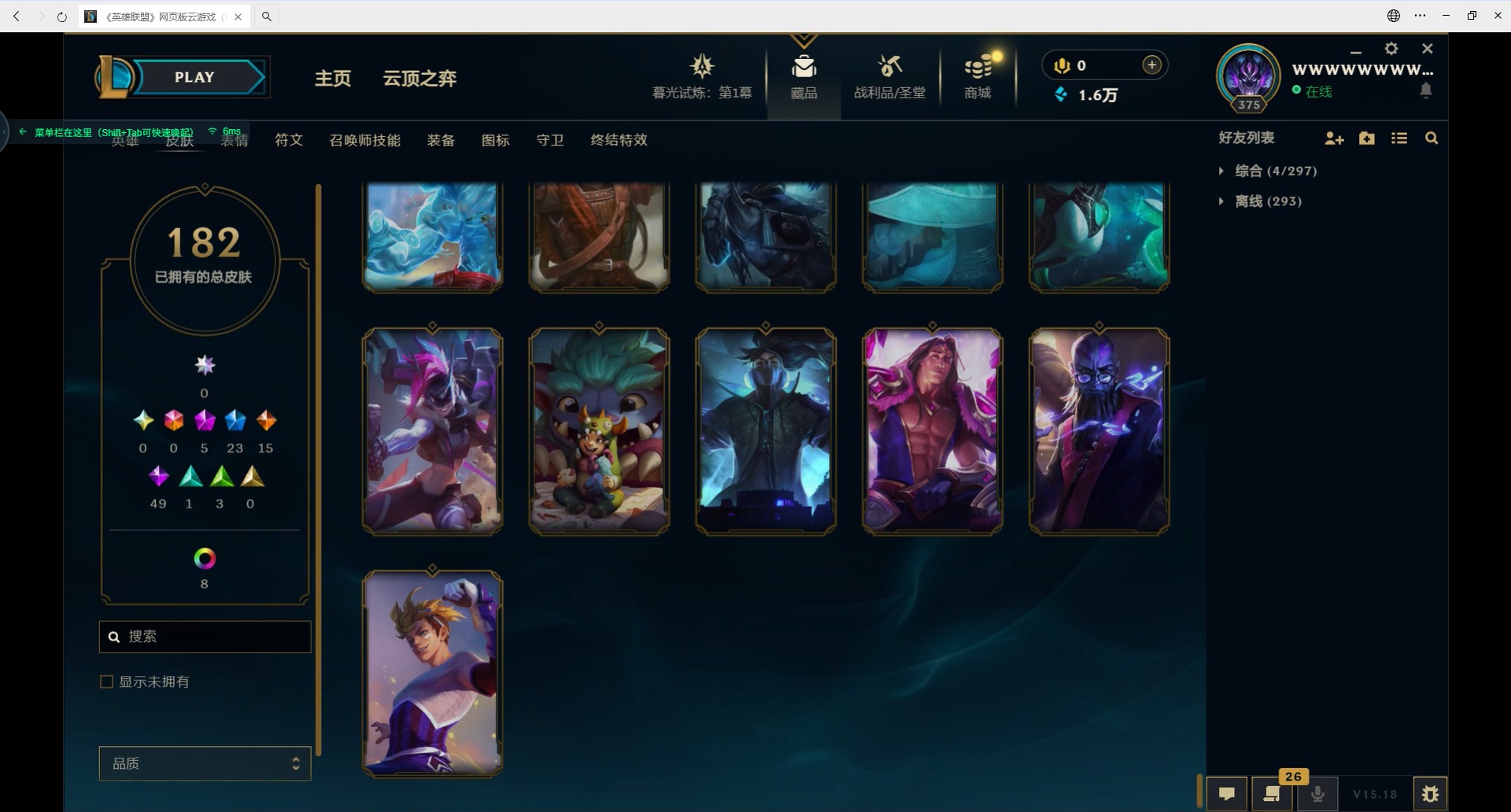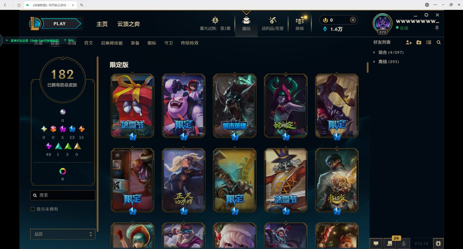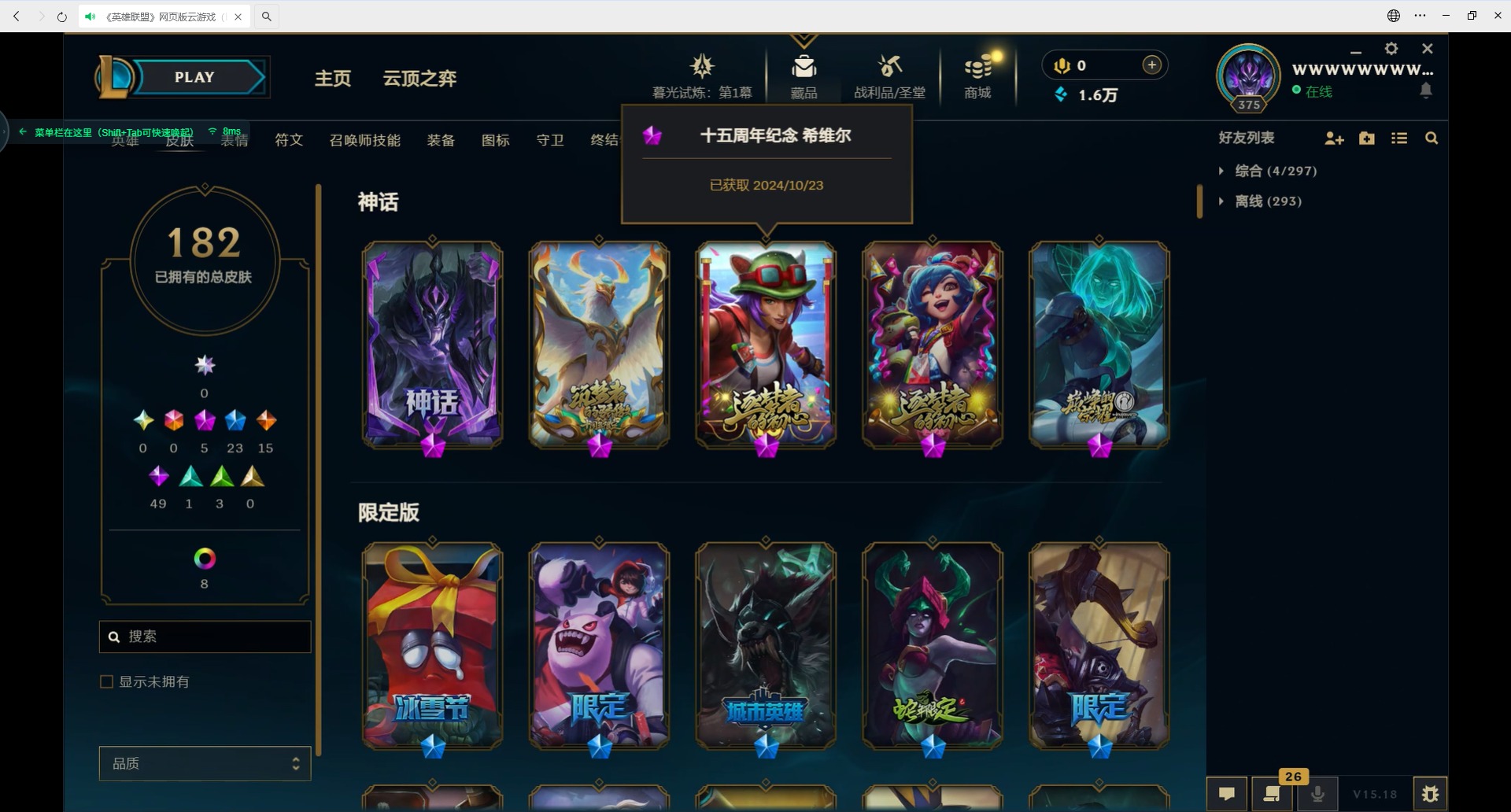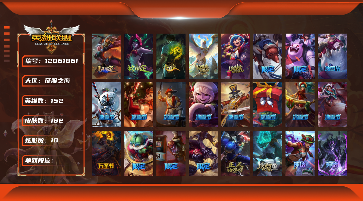 [12061861]5神话 23限定 15传说 49史诗 182皮肤 10炫彩 152英雄 可二次 可修改实名 优质装备:源代码 乐芙兰,防爆天使 凯尔,暗影 沃里克,都铎王朝 图奇,防爆士兵 炼金,钢铁之翼 凤凰,灰烬骑士 潘森,外星装甲 库奇,十五周年纪念 希维尔 赛季限定皮:胜利剑圣 易,胜利女神 娑娜 冠军限定系列:S2 暗杀星 努努,S4 SSW 图奇 冰雪节限定:“主人不要我了” 阿木木,胡桃夹子 小丑,平安夜女神 娑娜,魄罗骑士 瑟庄妮,圣诞精灵 崔丝塔娜,圣诞狂欢 努努,圣诞糖果棒 厄运小姐,雪默丁格,英勇玩具兵船长 万圣节限定:无头骑士 人马 年限:龙年 李青,蛇年 卡西奥佩娅,马年 锐雯 周年:10周年 安妮,10周年 凤凰