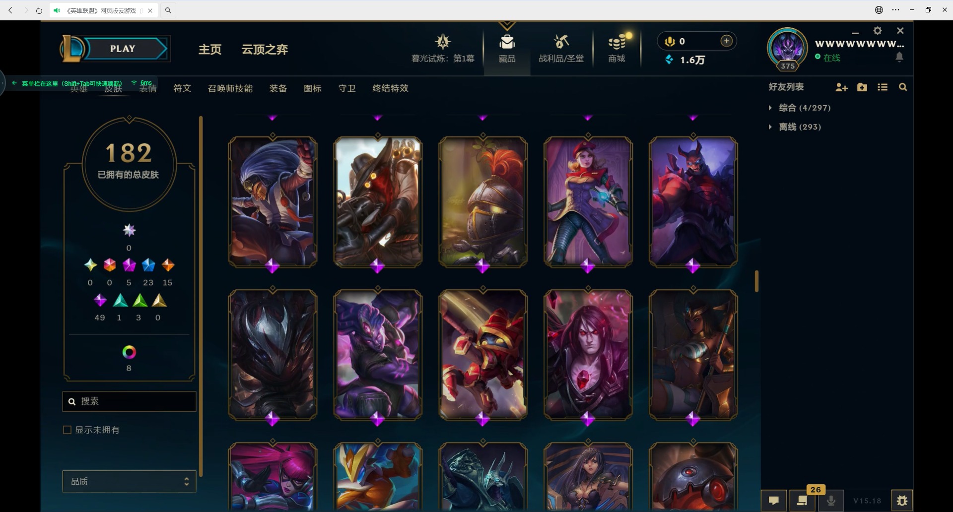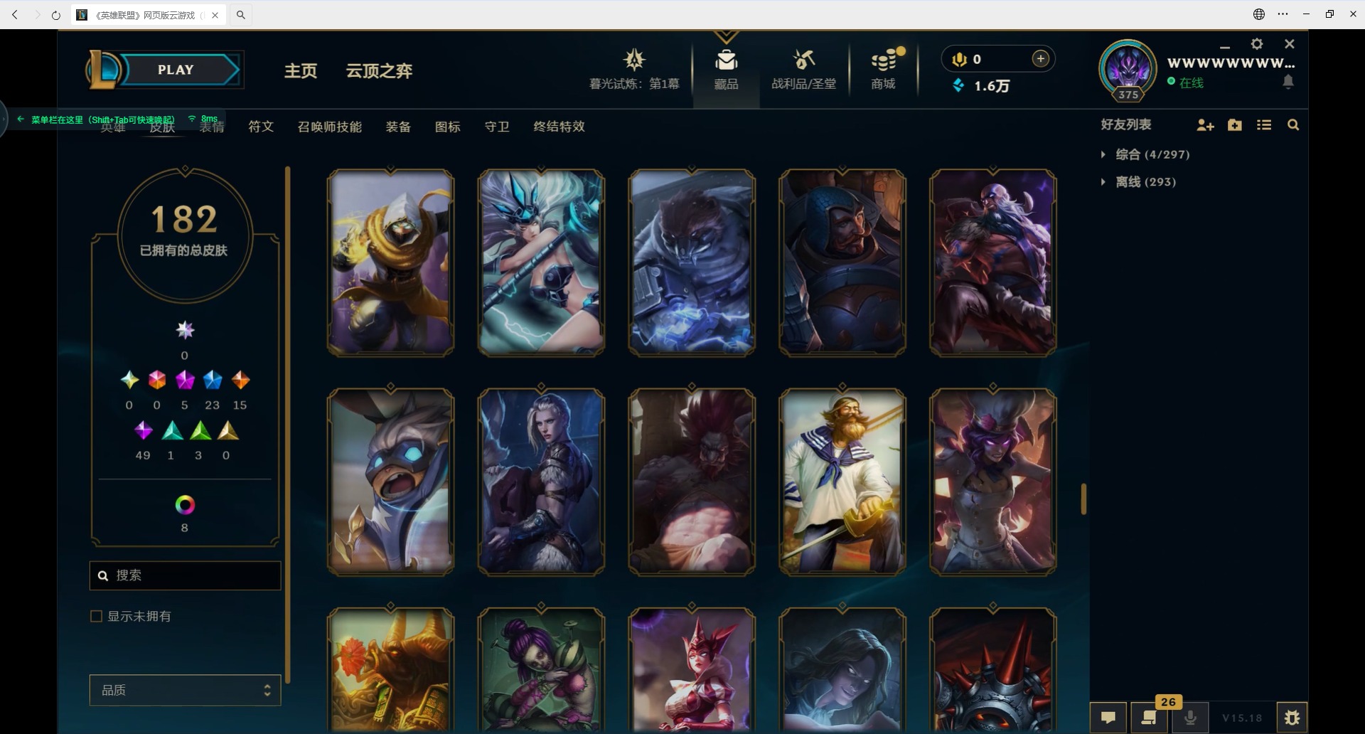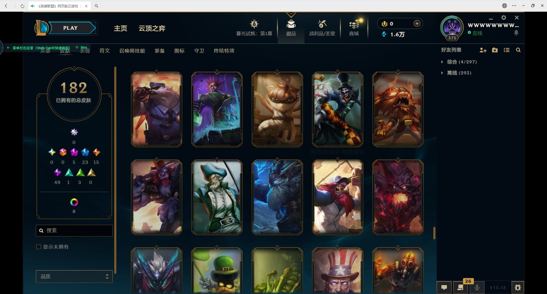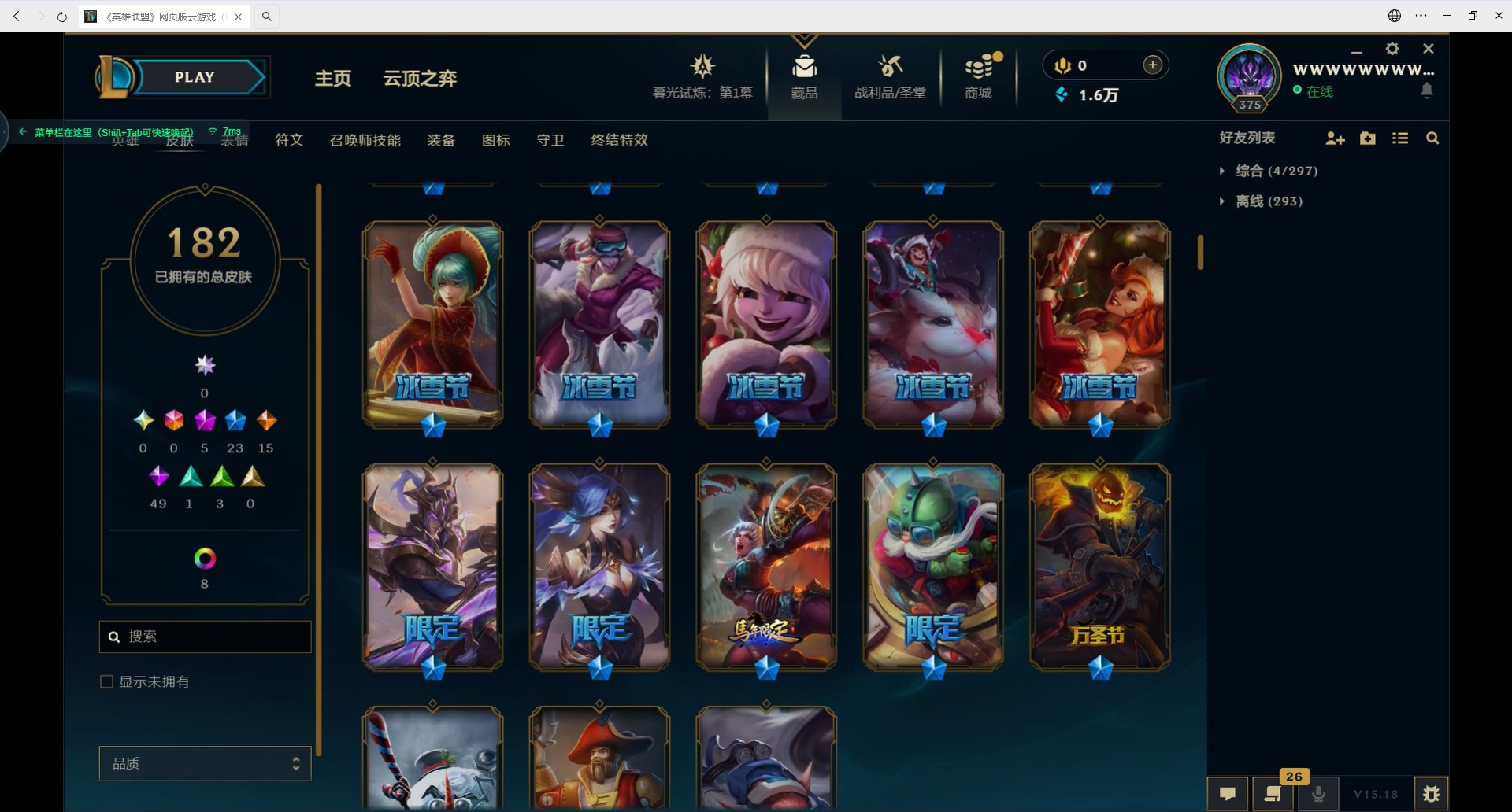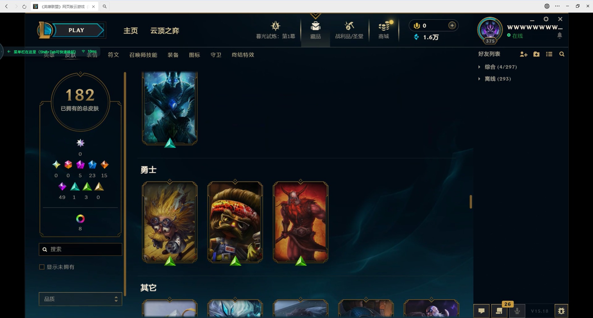 [12061861]5神话 23限定 15传说 49史诗 182皮肤 10炫彩 152英雄 可二次 可修改实名 优质装备:源代码 乐芙兰,防爆天使 凯尔,暗影 沃里克,都铎王朝 图奇,防爆士兵 炼金,钢铁之翼 凤凰,灰烬骑士 潘森,外星装甲 库奇,十五周年纪念 希维尔 赛季限定皮:胜利剑圣 易,胜利女神 娑娜 冠军限定系列:S2 暗杀星 努努,S4 SSW 图奇 冰雪节限定:“主人不要我了” 阿木木,胡桃夹子 小丑,平安夜女神 娑娜,魄罗骑士 瑟庄妮,圣诞精灵 崔丝塔娜,圣诞狂欢 努努,圣诞糖果棒 厄运小姐,雪默丁格,英勇玩具兵船长 万圣节限定:无头骑士 人马 年限:龙年 李青,蛇年 卡西奥佩娅,马年 锐雯 周年:10周年 安妮,10周年 凤凰