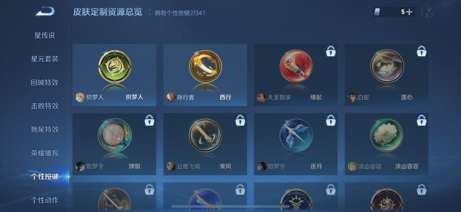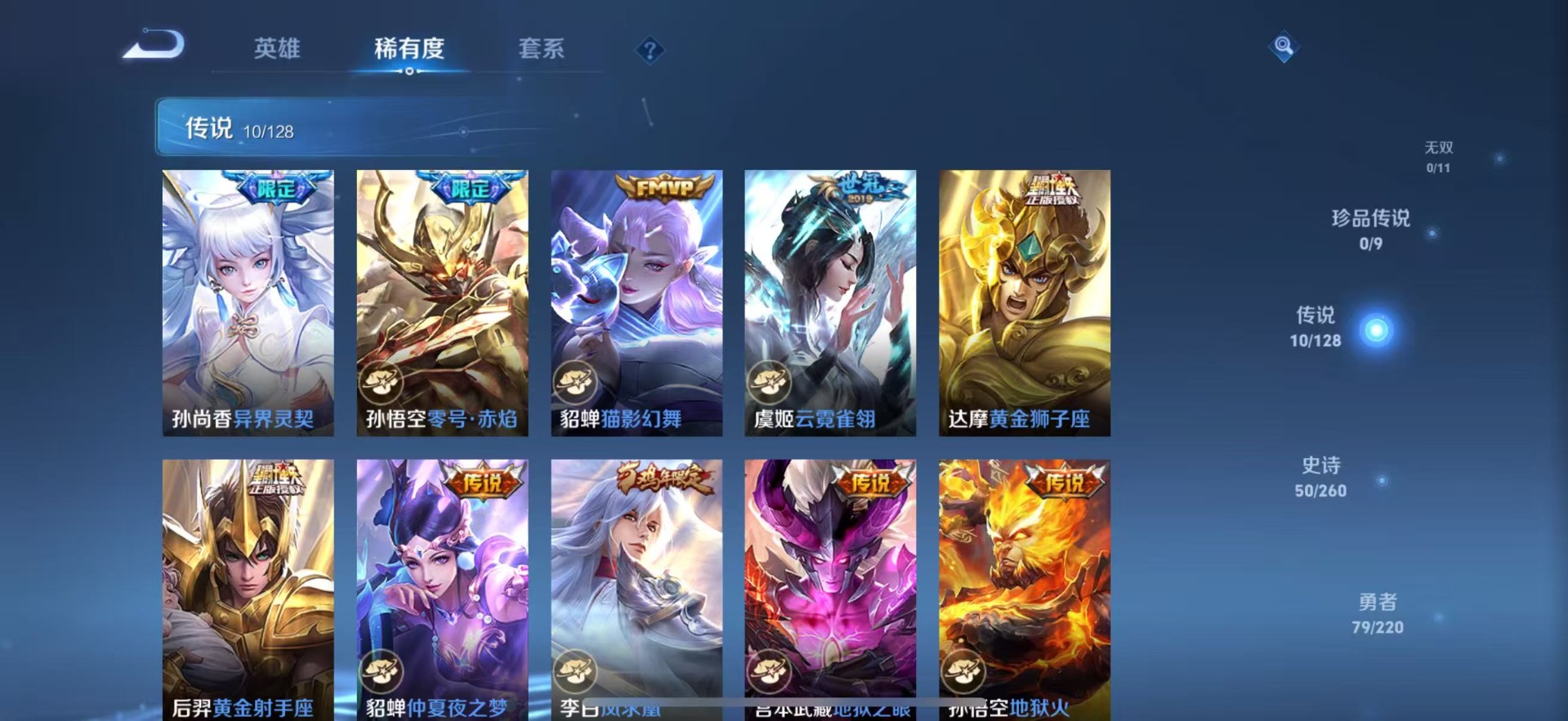 大乔白鹤梁神女,铠青龙志,孙尚香异界灵契,吕布御风骁将,裴擒虎李小龙,裴擒虎天狼狩猎者,上官婉儿梁祝,上官婉儿天狼绘梦者,花木兰瑞麟志,孙悟空孙行者,孙悟空大圣娶亲,孙悟空至尊宝,孙悟空美猴王,赵云引擎之心,韩信傲雪梅枪,韩信逐梦之影,百里守约朱雀志,关羽冰锋战神