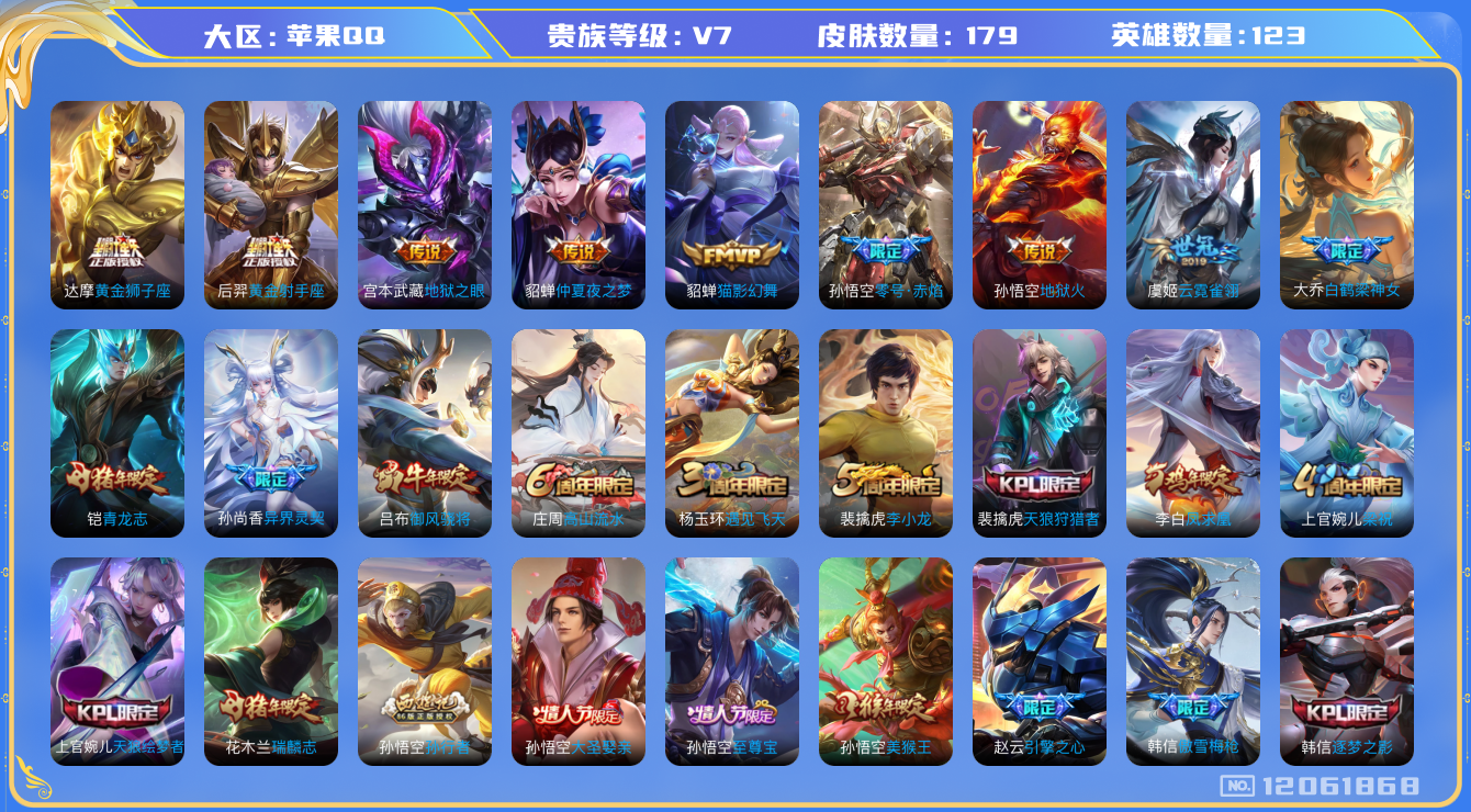 - PX_2077863-【金标钟馗】贵族等级: V7 英雄数: 123 皮肤数: 242 荣耀水晶: 全息碎影 星传说: 零号·雷霆 传说皮: 云鹰飞将,一念神魔,零号·赤焰 限定皮: 遇见飞天,李小龙,梁祝,时雨天司,辉光之辰,冰霜恋舞曲,逐梦之星,逐梦之影,凤求凰,白虎志,至尊宝,大圣娶亲,高山流水,圣诞老人,五谷丰年,山海·玄木吟