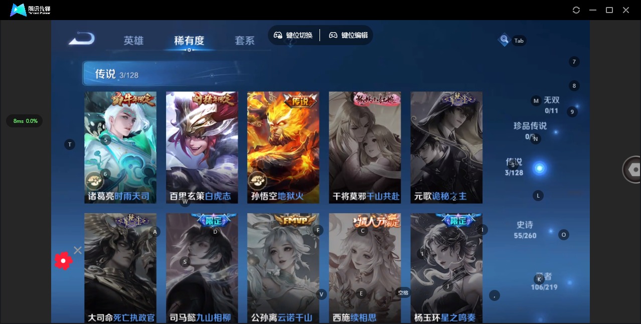 - [11578624]V7 1典藏 5传说 124英雄 162皮肤 可修改实名 优质装备:鸣剑·曳影,地狱火,超时空战士-狄仁杰,鹤羽星尊,玄雷天君 珍宝阁皮:蔷薇恋人 限定皮:五谷丰年,武圣,梁祝,李小龙,猪悟能 史诗皮:化蝶舞,龙之律动,百相守梦-周瑜,茶境仙,百相守梦-黄忠,电玩小子(小书包),黄金分割率,特工魅影,千年之狐,江河有灵,魅语,高渐离燃音魔法,冰冠公主,末日机甲-吕布,节奏热浪,水果甜心,绅士熊喵,天才门将,星夜王子,心灵骇客,功夫厨神,暗隐猎兽者,鬼剑武藏,缤纷独角兽,水晶猎龙者,曙光守护者,金属风暴,圣诞狂欢,圣诞恋歌,鹰眼统帅,暗夜贵公子,魅力维加斯,未来纪元-赵云