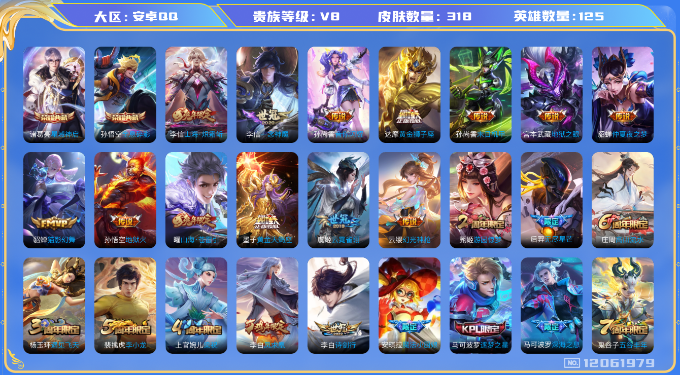 [12061979]V8 2典藏 20传说 125英雄 318皮肤 可修改实名 优质装备:全息碎影(猴子典藏),星域神启(倪克斯贼亮),黄金狮子座,猫影幻舞,一念神魔,云霓雀翎,末日机甲-孙尚香(绿蚂蚱),地狱火,仲夏夜之梦(大飞蛾),地狱之眼,音你闪耀(rap皮),山海·炽霜斩(李信年限),山海·苍雷引(电光曜子),黄金天蝎座,涂山容容 传说皮:幻光神枪 珍宝阁皮:优雅恋人,玩趣恶龙 限定皮:鸣野蒿,至尊宝,白虎志(电光耗子),凤求凰(白切鸡),魔法小厨娘,飞衡(韩信年限),遇见飞天,高山流水,诗剑行,五谷丰年,游园惊梦,梁祝,逐梦之星,李小龙,引擎之心,无尽星芒,深海之息(深海大菠萝) 史诗皮:化蝶舞,星界战将,龙之律动,石田雨龙,怒海争锋,破空之剑,决胜骁骑,百相守梦-黄忠,紫霞仙子,苍穹之光,电玩小子(小书包),特工魅影,千年之狐,永昼,江河有灵,百解令(蒙犽),蒙恬荣光圣徽,冰冠公主,偶像歌手,百相守梦(刘备),暗夜猫娘,百相守梦(关羽),龙骑士(小龙虾),末日机甲-吕布,猫狗日记-孙策,乱世虎臣,修罗,女仆咖啡,摇滚巨星,水果甜心,绅士熊喵,天才门将,星夜王子,心灵骇客,功夫厨神,德古拉伯爵,暗隐猎兽者,鬼剑武藏,心灵战警,舞动绿茵,地狱岩魂,纤云弄巧,拒霜思,缤纷独角兽,乘风破浪,逐浪之夏,水晶猎龙者,曙光守护者,金属风暴,原初追逐者,圣诞狂欢,圣诞恋歌,鹰眼统帅,暗夜贵公子,魅力维加斯,黎明之约,无心,未来纪元-赵云,玫瑰异探