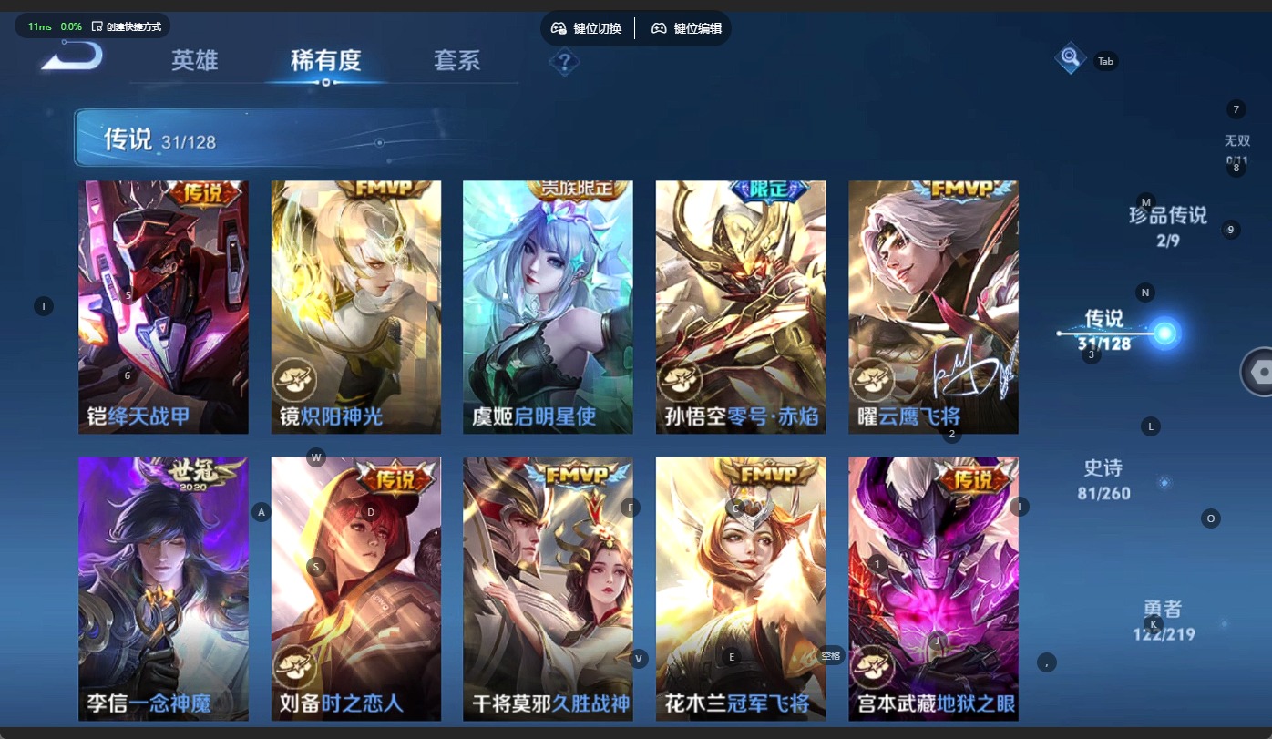 - [11684697]V8 1典藏 13传说 125英雄 305皮肤 可修改实名 优质装备:神鉴启示录,炽阳神光,末日机甲-孙尚香(绿蚂蚱),地狱火,记忆之芯(机甲兔),妄想实况,琥珀纪元马超 传说皮:幻光神枪 珍宝阁皮:优雅恋人,蔷薇恋人,女武神 限定皮:鸣野蒿,至尊宝,白虎志(电光耗子),凤求凰(白切鸡),时雨天司(水龙头),神威(电光马子),飞衡(韩信年限),遇见飞天,五谷丰年,冰锋战神,游园惊梦,梁祝,御风骁将(吕布年限),逐梦之星,天狼溯光者,逐梦之音,李小龙,逐梦之影,默契交锋-花木兰,一生所爱,大圣娶亲,青春决赛季,冰霜恋舞曲,深海之息(深海大菠萝),山海·玄木吟(马可年限) 史诗皮:化蝶舞,星界战将,石田雨龙,紫霞仙子,电玩小子(小书包),白龙吟,黄金分割率,特工魅影,千年之狐,末日机甲-莱西奥,江河有灵,百解令(蒙犽),蒙恬荣光圣徽,偶像歌手,龙骑士(小龙虾),魅语,无限星赏官,晚萤,末日机甲-吕布,猫狗日记-孙策,猫狗日记-大乔,乱世虎臣,节奏热浪,修罗,女仆咖啡,水果甜心,天才门将,星夜王子,功夫厨神,德古拉伯爵,暗隐猎兽者,幽灵船长,鬼剑武藏,天秀·启明,舞动绿茵,地狱岩魂,纤云弄巧,繁星吟游(呼啦呼啦),拒霜思,缤纷独角兽,乘风破浪,逐浪之夏,龙鼓争鸣,水晶猎龙者,曙光守护者,金属风暴,原初追逐者,圣诞狂欢,圣诞恋歌,鹰眼统帅,魅力维加斯,黎明之约,赏金猎手,无心