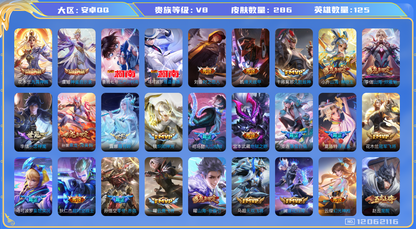 [12062116]V8 2典藏 2珍品传说 31传说 125英雄 286皮肤 可修改实名 优质装备:九霄神辉(木兰典藏),神鉴启示录,江户川柯南,怪盗基德,冠军飞将,云鹰飞将(小将军),绛天战甲(鸡嘴战神),久胜战神,炽阳神光,一念神魔,零号·赤焰,地狱之眼,时之恋人-刘备(电焊工),超时空战士-狄仁杰,无双飞将,山海·炽霜斩(李信年限),山海·琳琅生(小乔年限),山海·苍雷引(电光曜子),浮生妄,妄想实况,霜月吟,澜逐花归海 传说皮:乘龙·淬吴钩(孙策年限),落雪白狼,九山相柳,幻光神枪 珍宝阁皮:万物之道,蔷薇恋人 限定皮:愿照·九州拓(澜年限),愿照·山河定(司空震年限),陌上桑,鸣野蒿,傲雪梅枪,补天,飞衡(韩信年限),山海·碧波行(瑶年限),无限倾心-项羽,影龙天霄,诗剑行,五谷丰年,梁祝,御风骁将(吕布年限),龙胆,岱宗(典韦年限),逐梦之音,默契交锋-兰陵王,孙行者,玉兔公主,神器·万象笔,山海·玄木吟(马可年限),冰霜神祇 史诗皮:化蝶舞,星界战将,龙之律动,雪豹·霜爪,茶境仙,怒海争锋,炽弈燎原,东方月初,蒙犽顽岩魄,芈月浮光幕影,琥珀纪元伽罗,蔬乡物语(鲁班七号),紫霞仙子,千年之狐,永昼,江河有灵,匿光侦查者,鹤归松栖(赵怀真),雪夜绮愿(周瑜),真我赫兹(百里守约),魅语,百解令(蒙犽),高渐离燃音魔法,蒙恬荣光圣徽,匿光破解者,冰冠公主,偶像歌手,百相守梦(刘备),暗夜猫娘,猫狗日记-大乔,节奏热浪,修罗,女仆咖啡,水果甜心,星夜王子,心灵骇客,功夫厨神,暗隐猎兽者,幽灵船长,鬼剑武藏,暗渊魔法,天秀·启明,舞动绿茵,诗语江南,纤云弄巧,拒霜思,乘风破浪,逐浪之夏,水晶猎龙者,金属风暴,圣诞狂欢,圣诞恋歌,鹰眼统帅,暗夜贵公子,无心,未来纪元-赵云